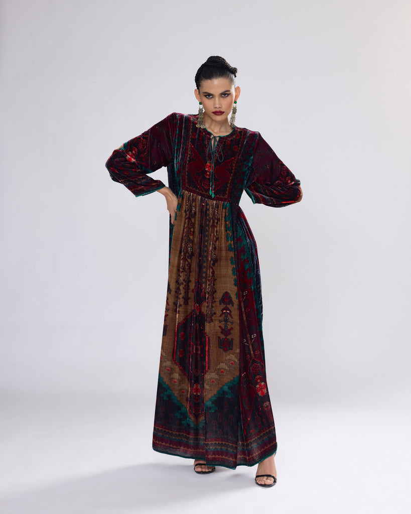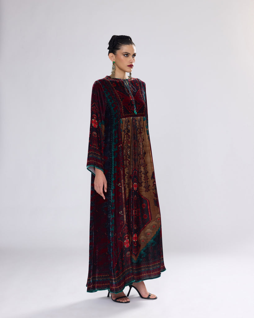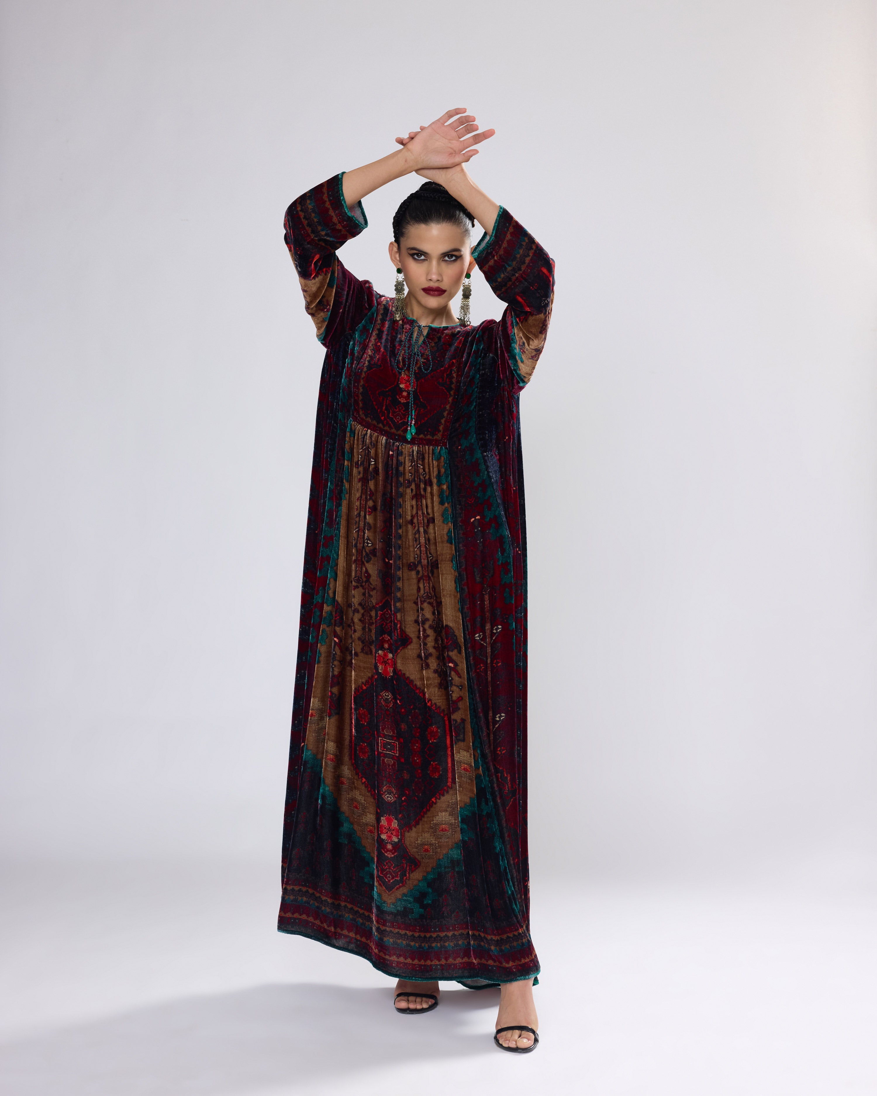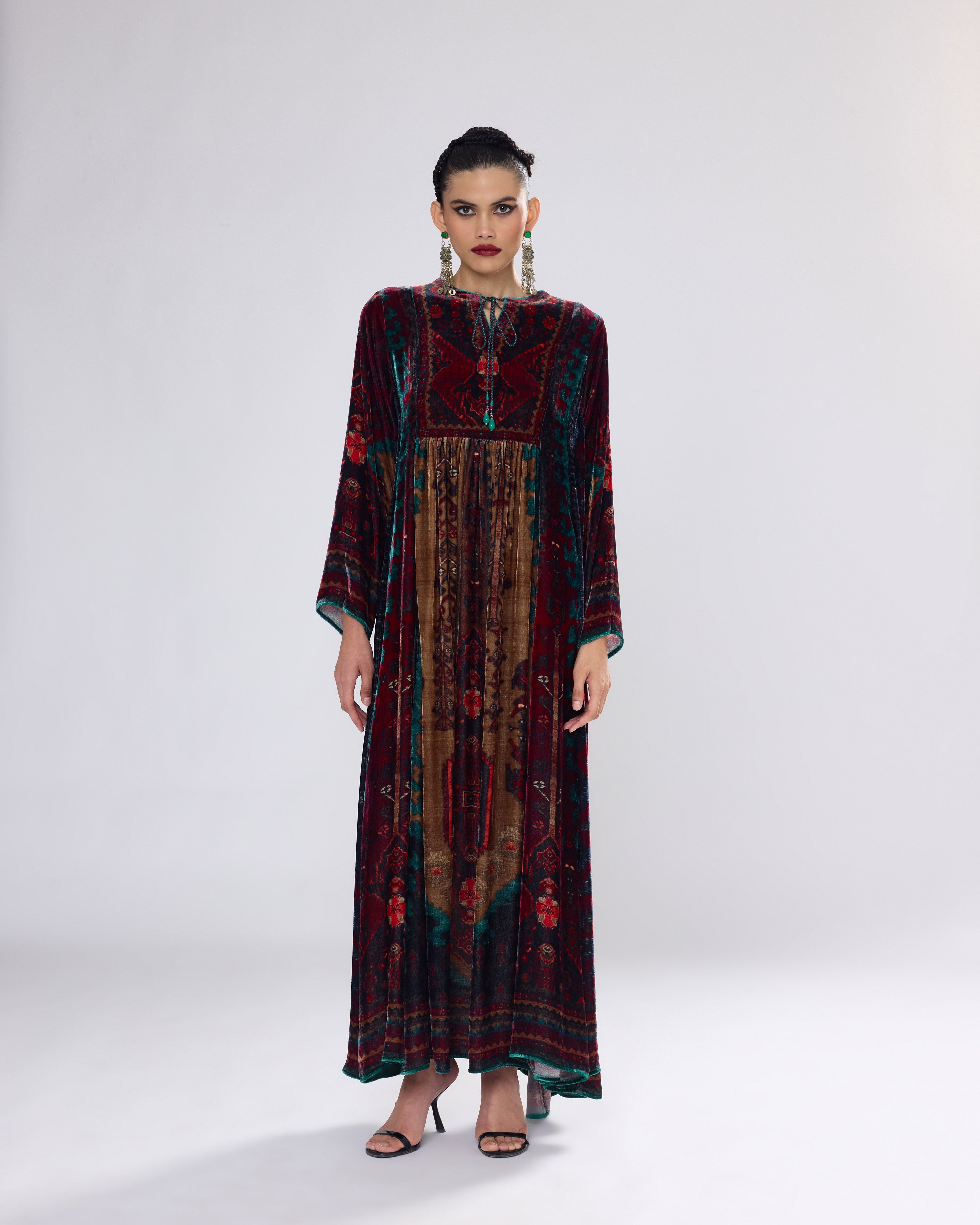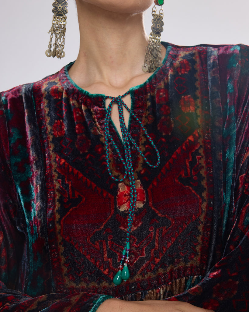 A printed silk kaftan dress with a yoke front and panels for a flare. The kaftan dress has full length sleeves.