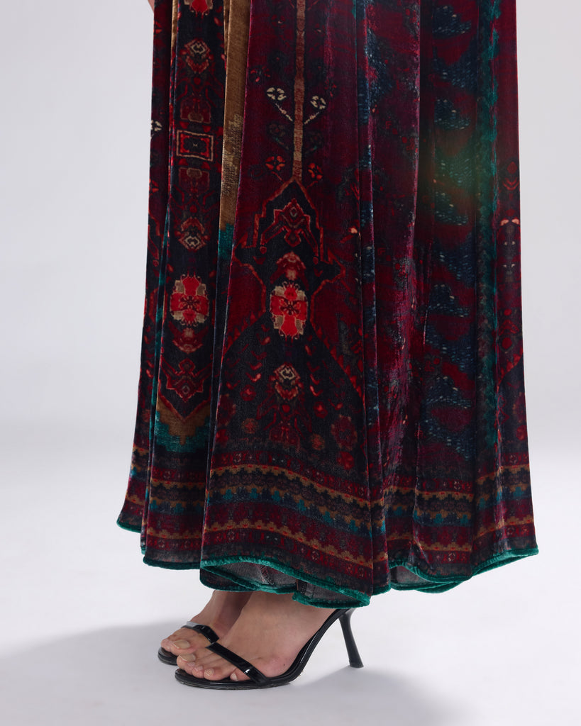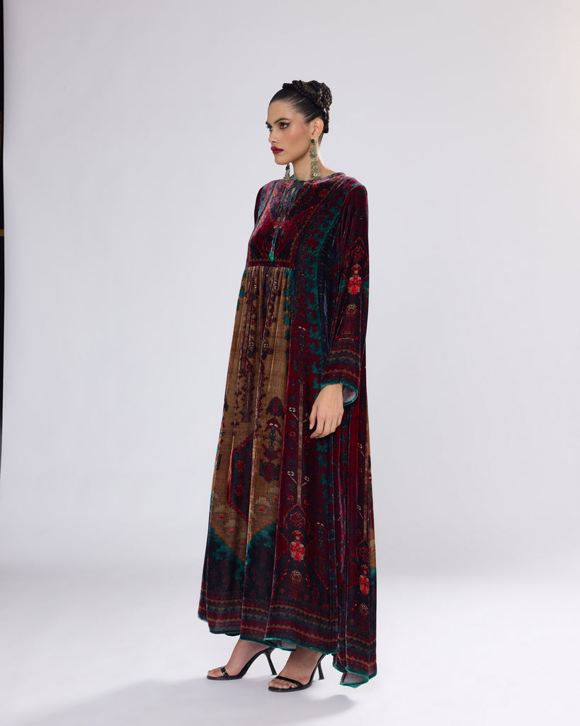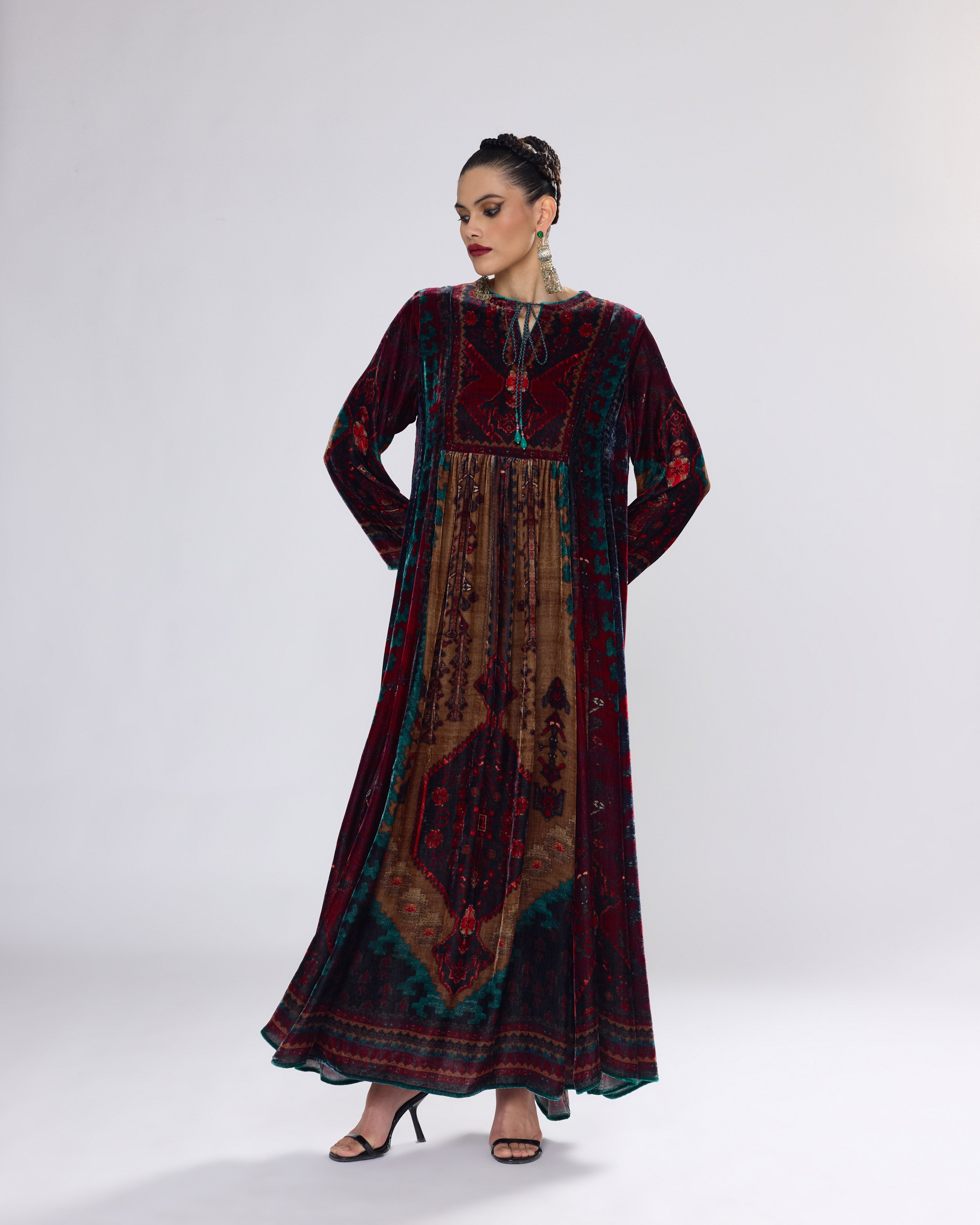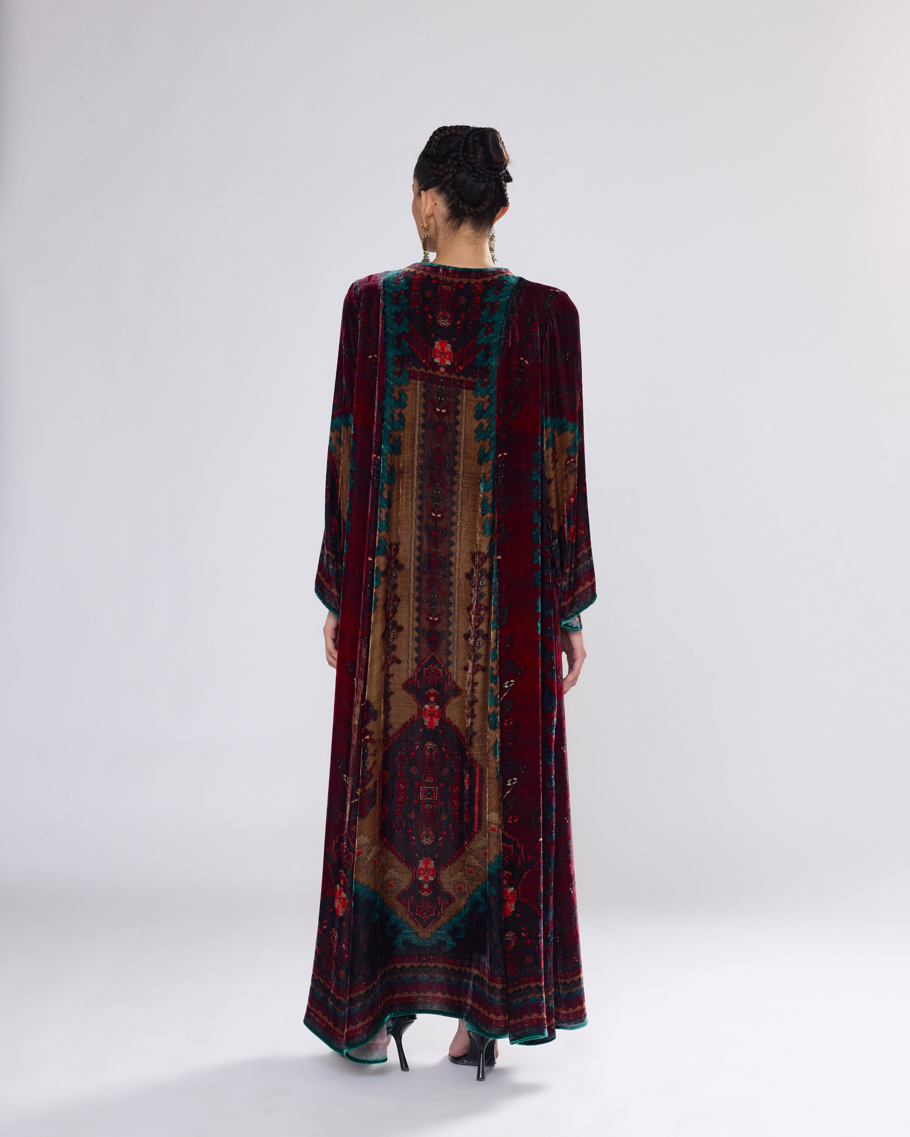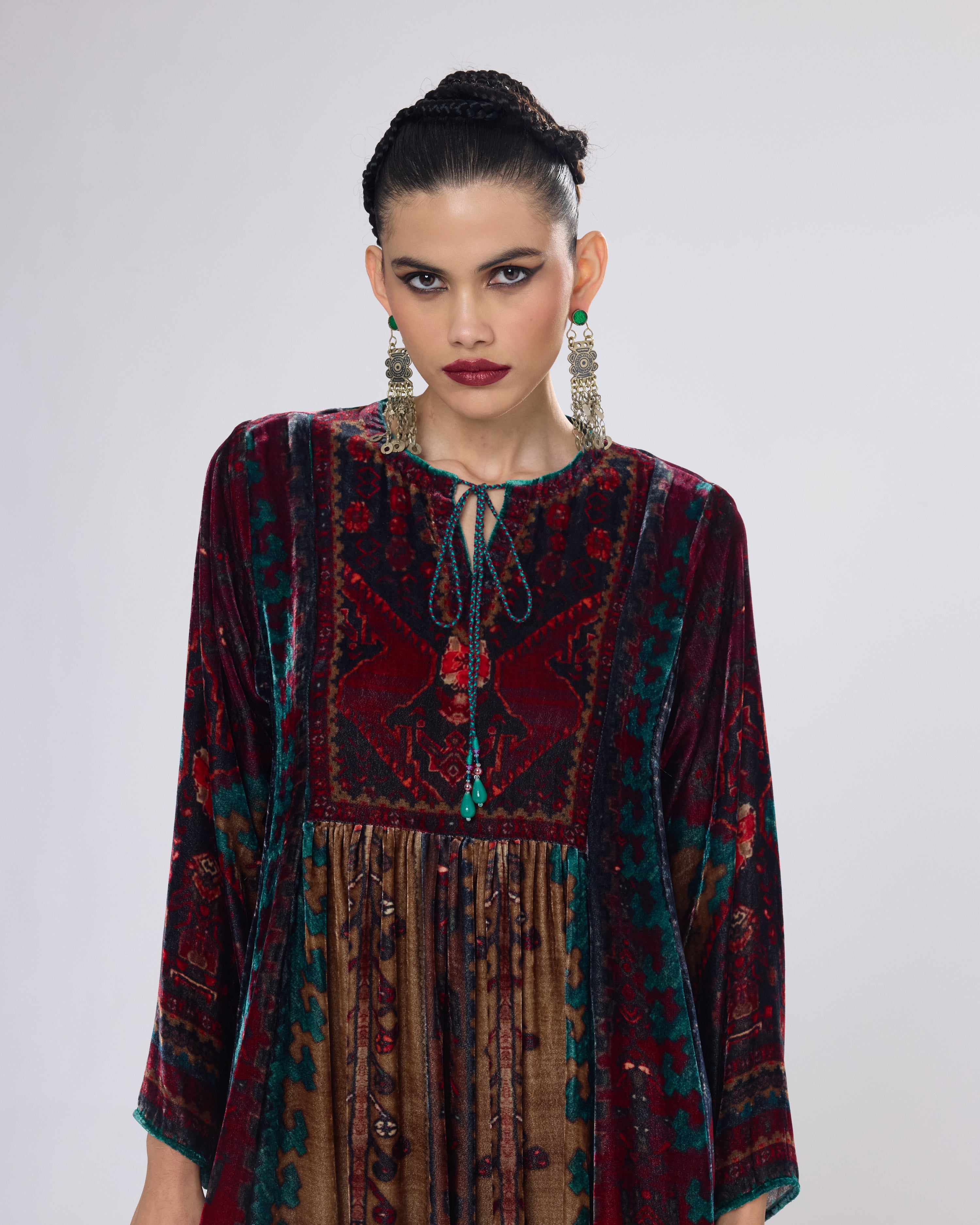 A printed silk kaftan dress with a yoke front and panels for a flare. The kaftan dress has full length sleeves.