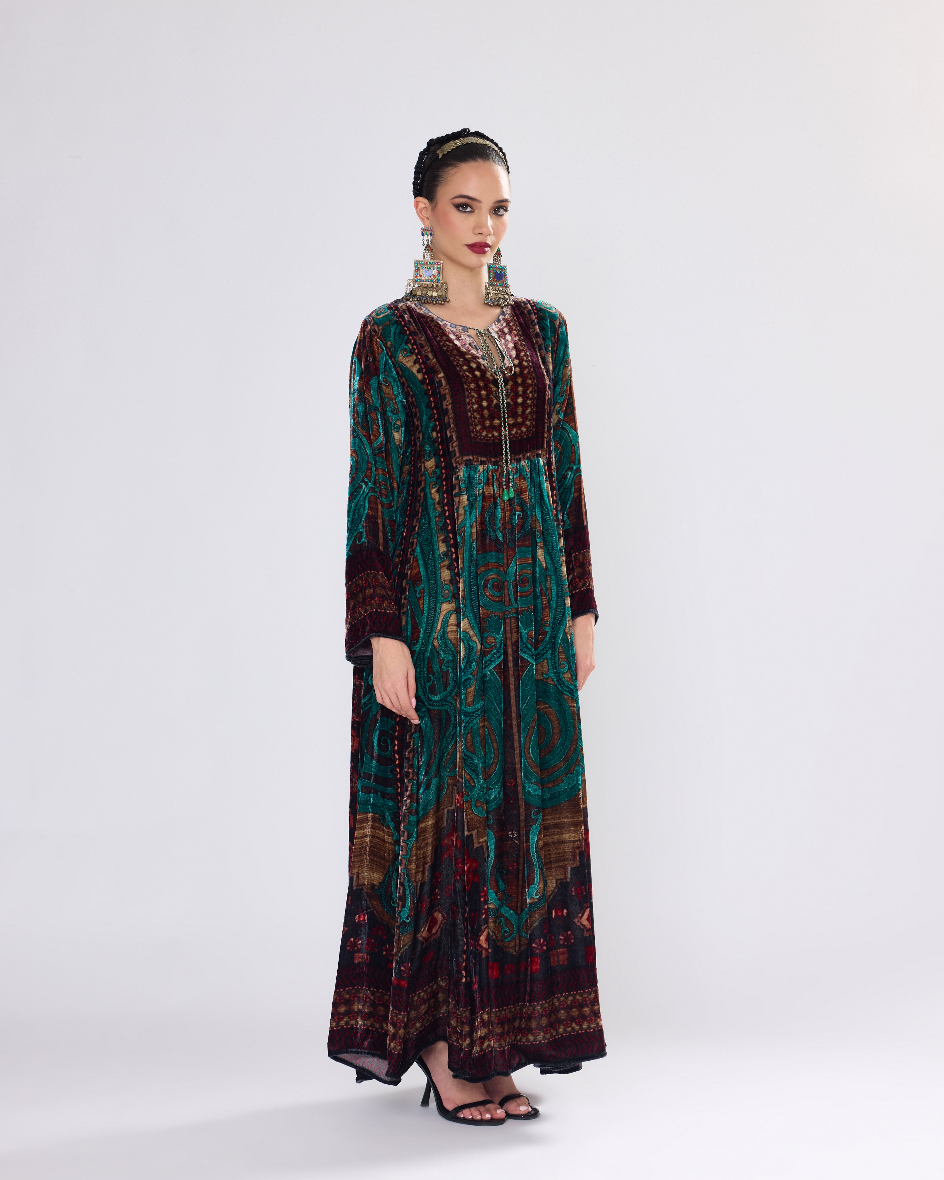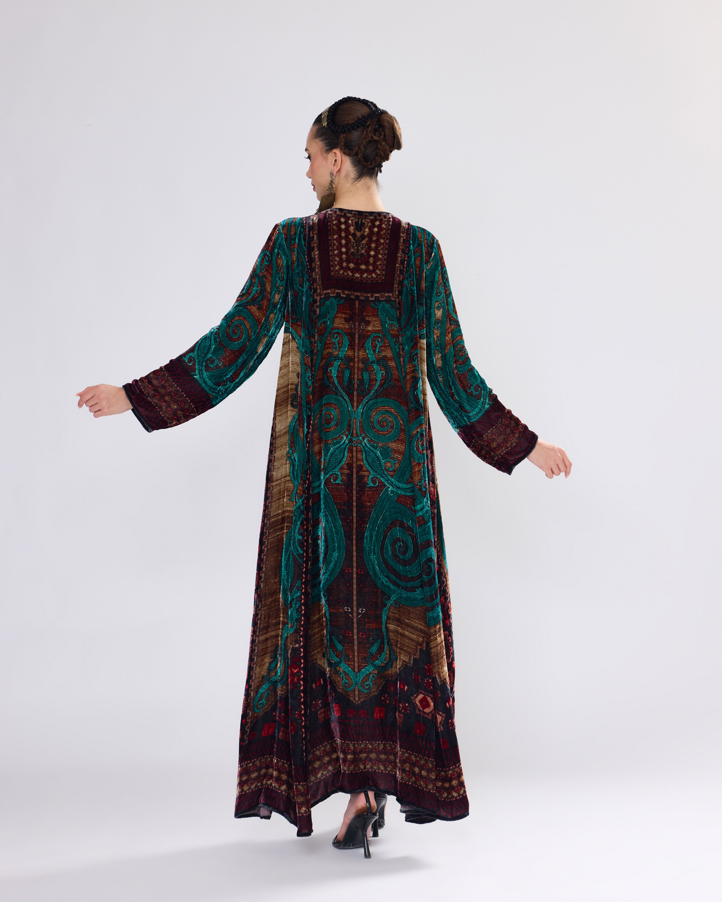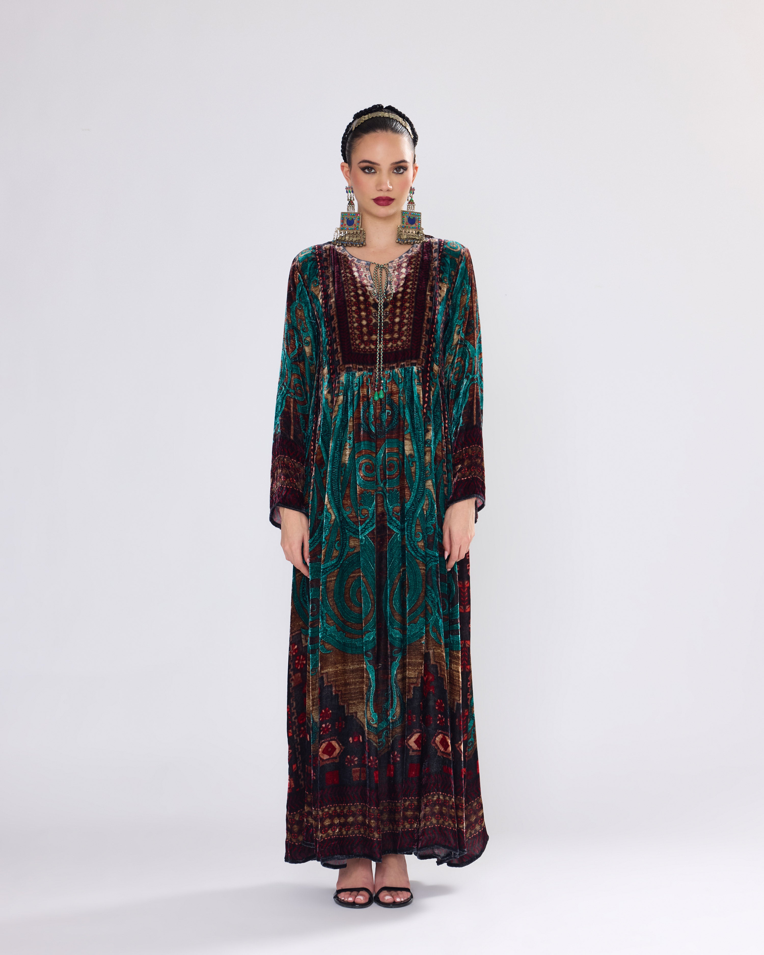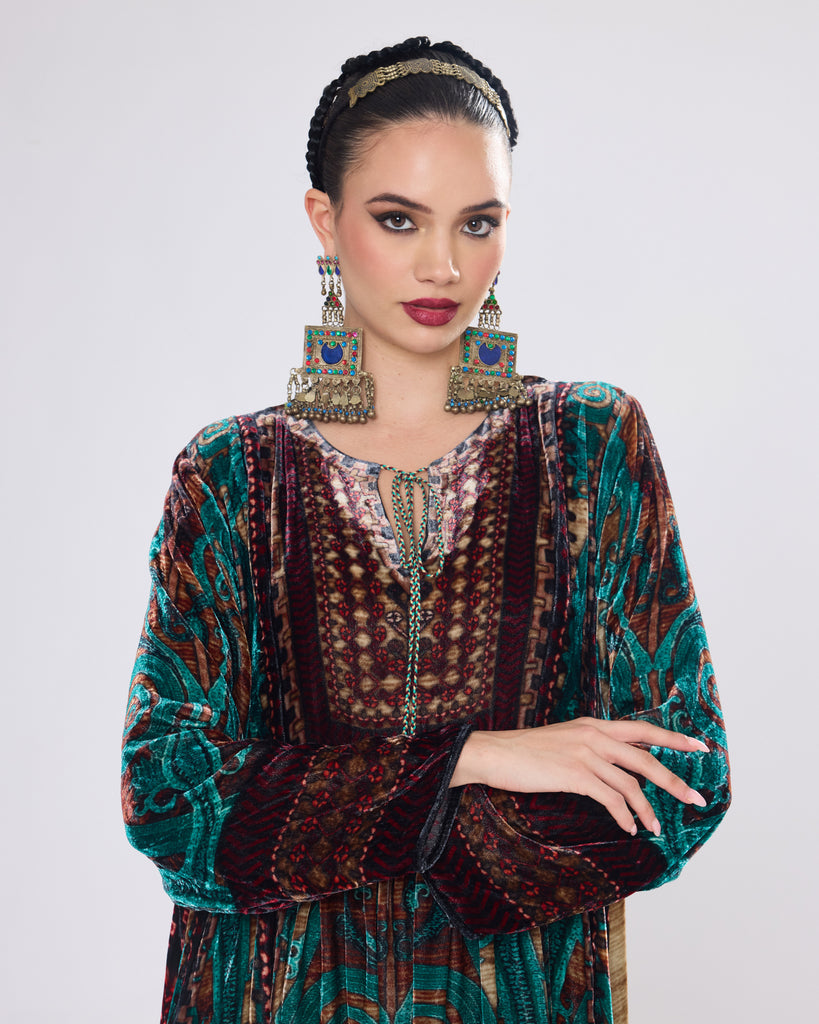 A printed silk kaftan dress with a yoke front and panels for a flare. The kaftan dress has full length sleeves.