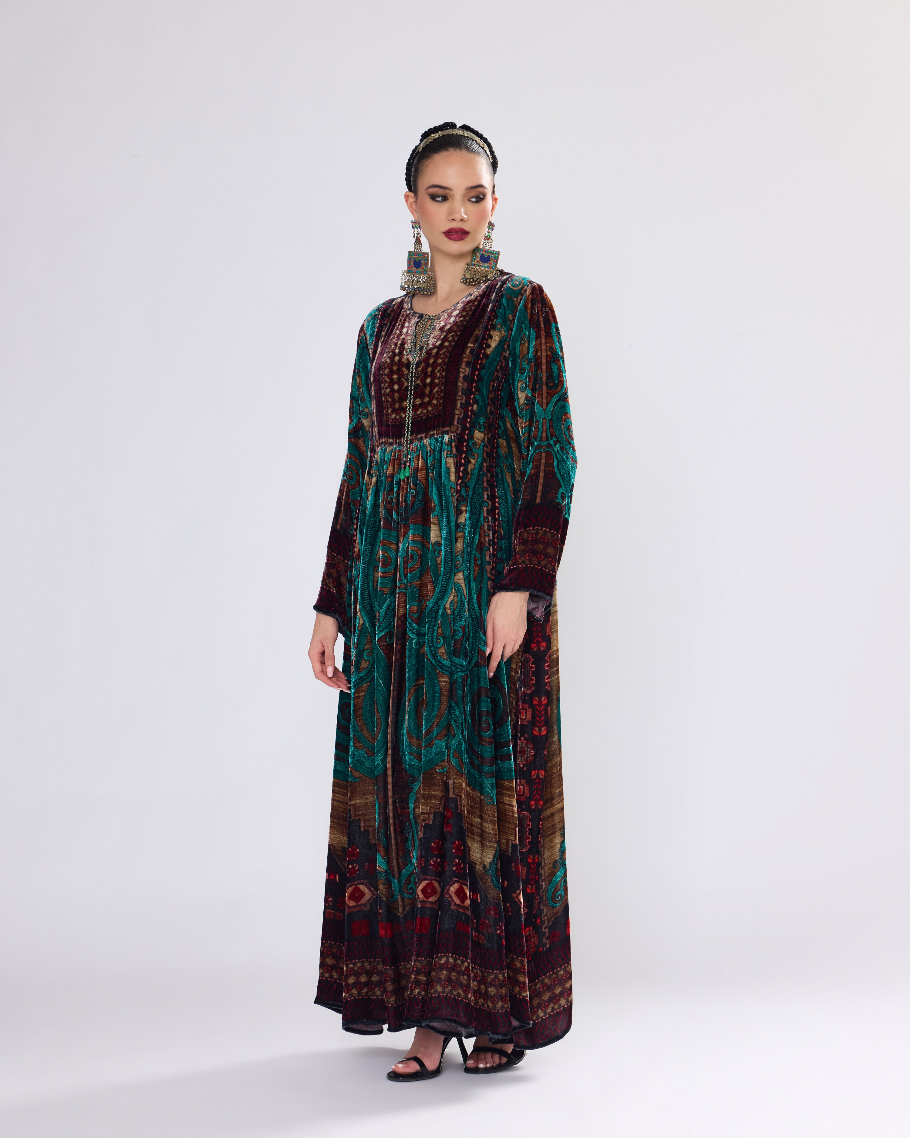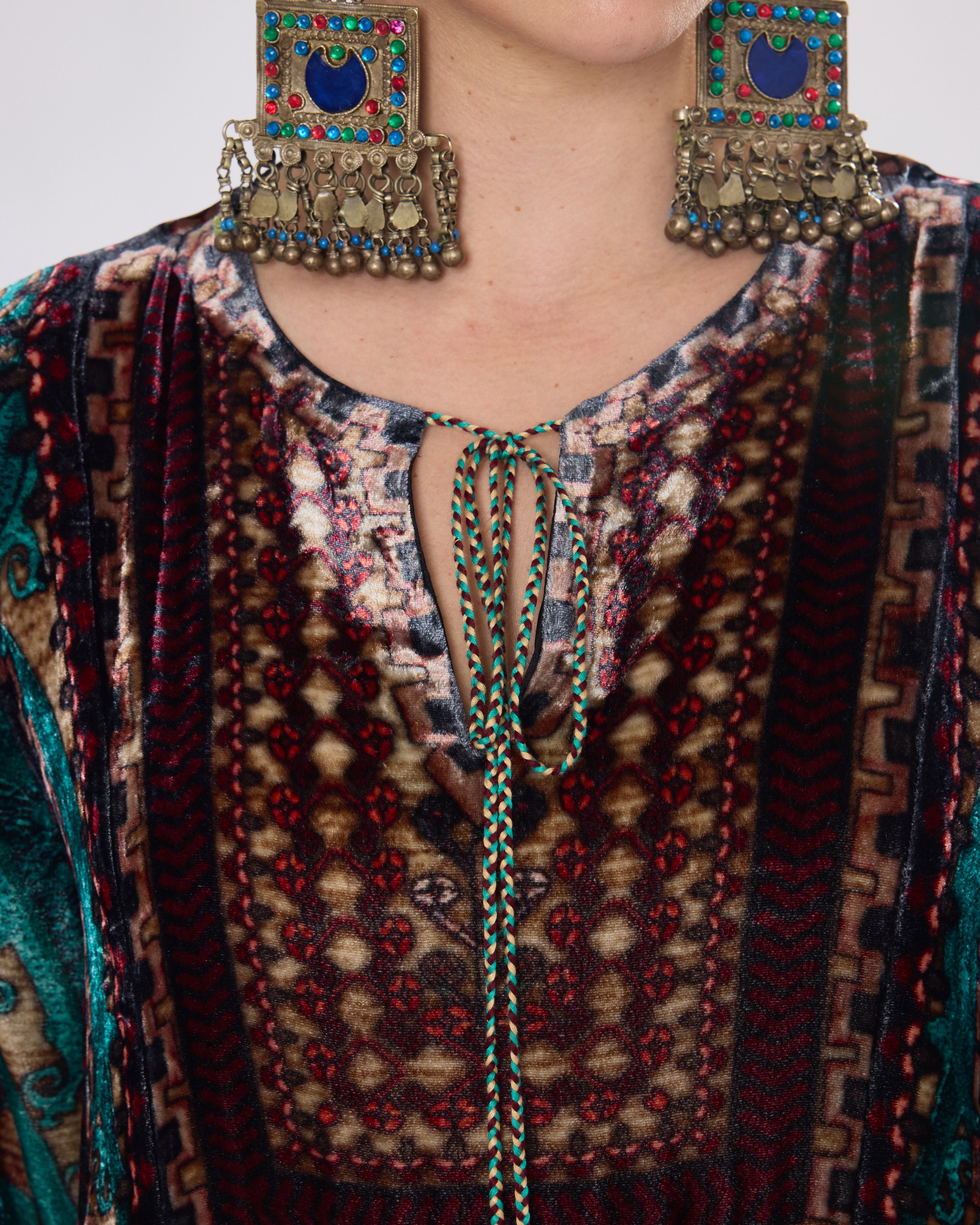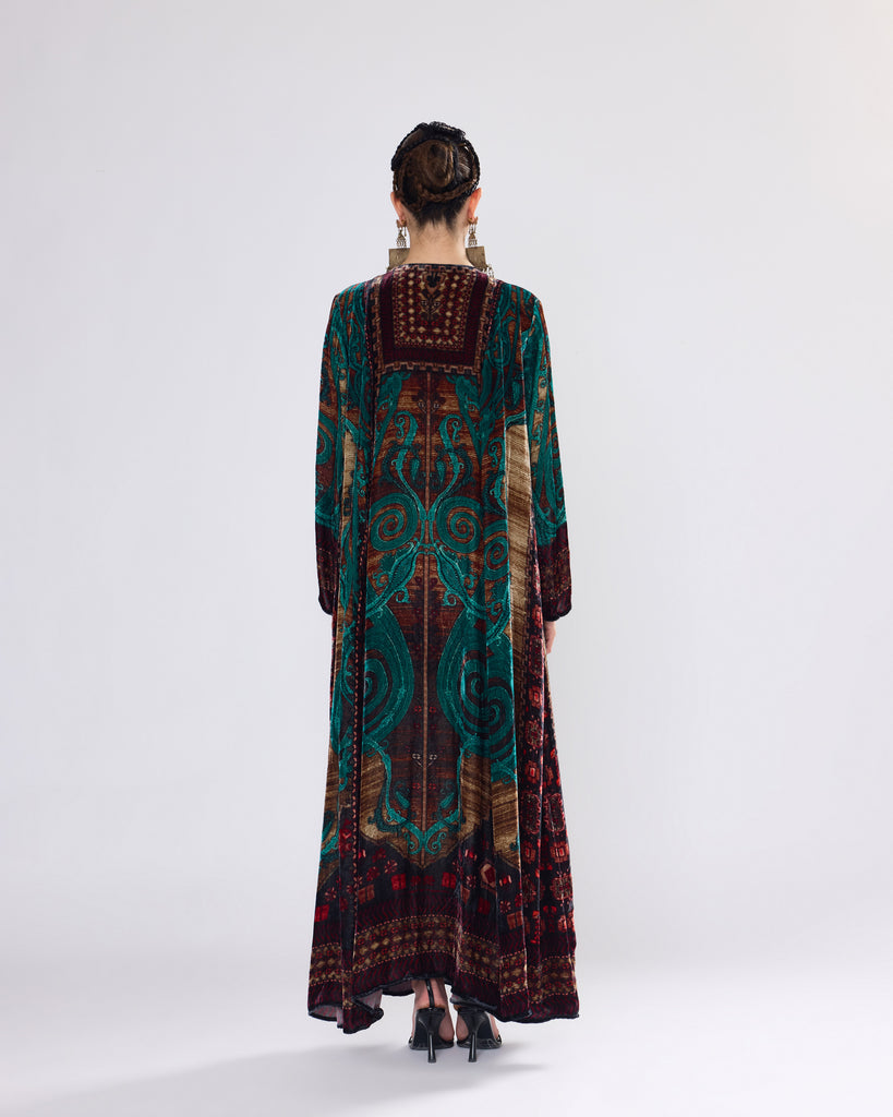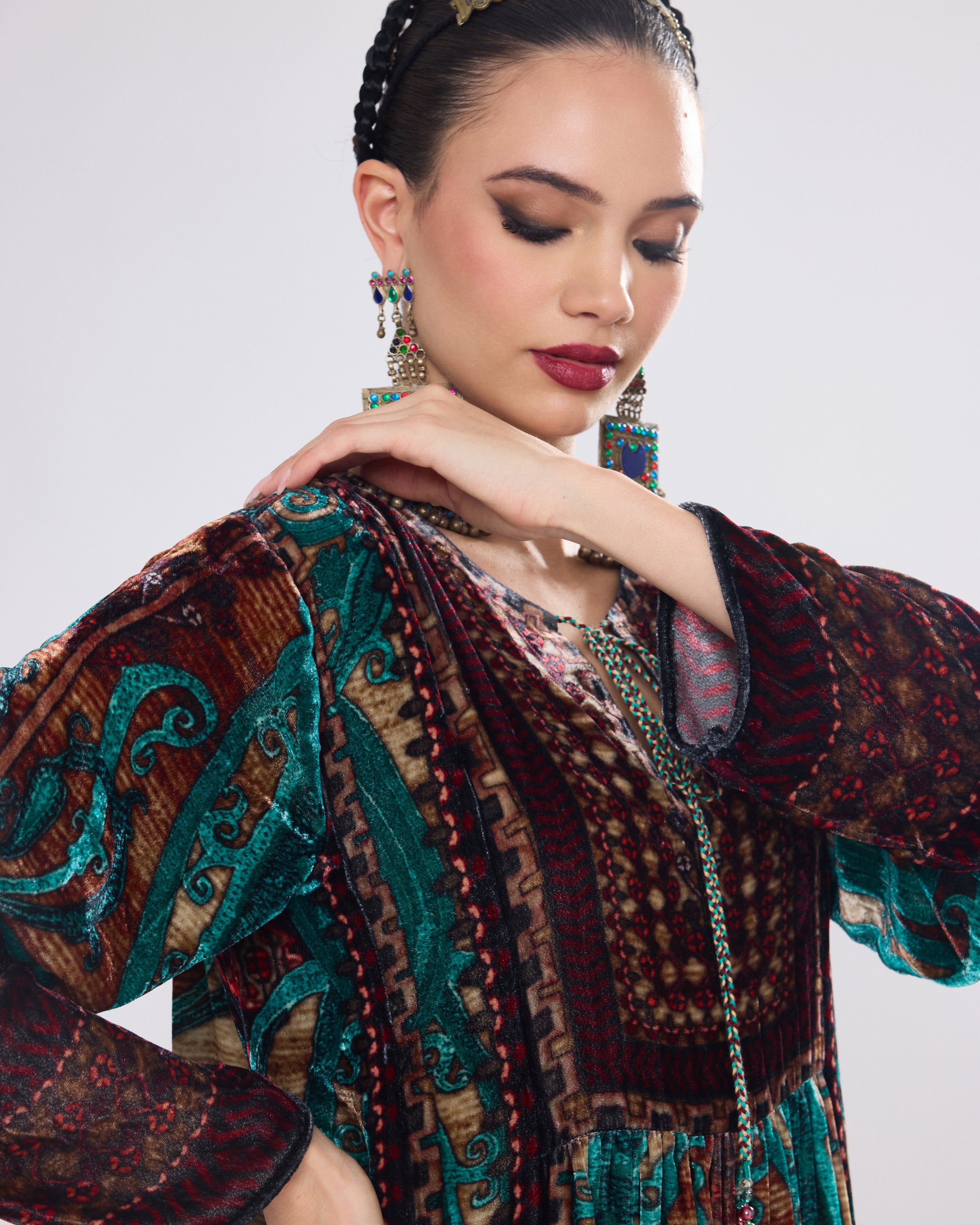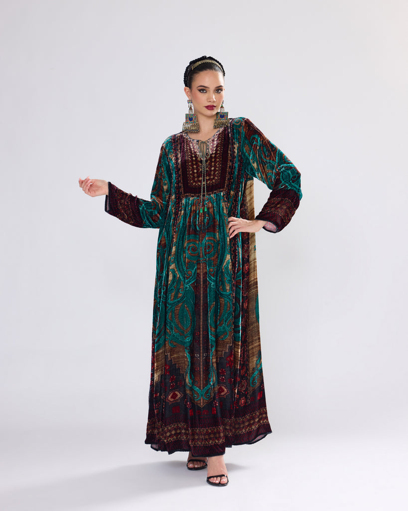 A printed silk kaftan dress with a yoke front and panels for a flare. The kaftan dress has full length sleeves.