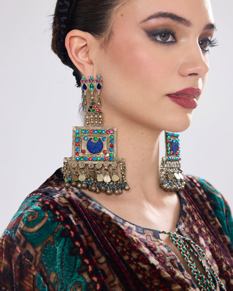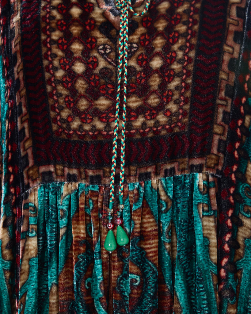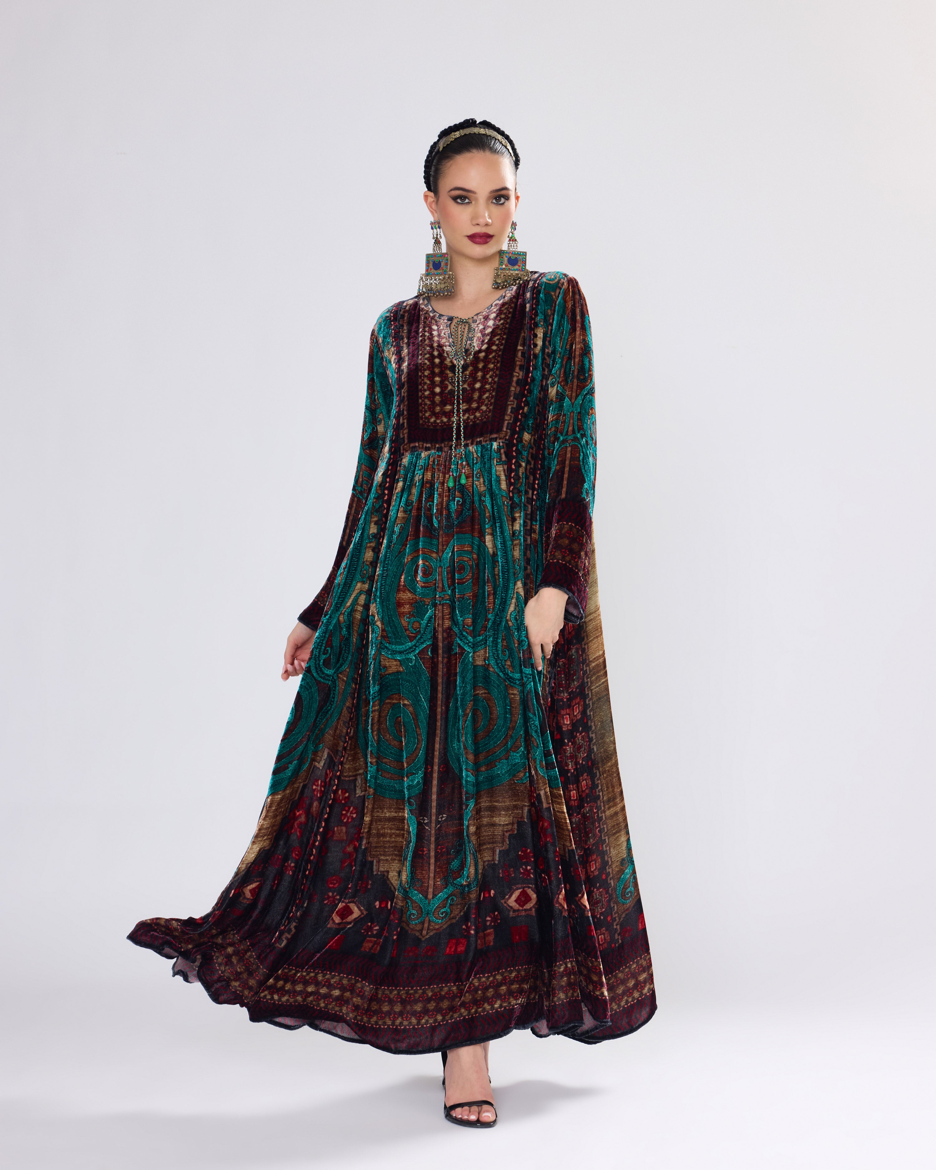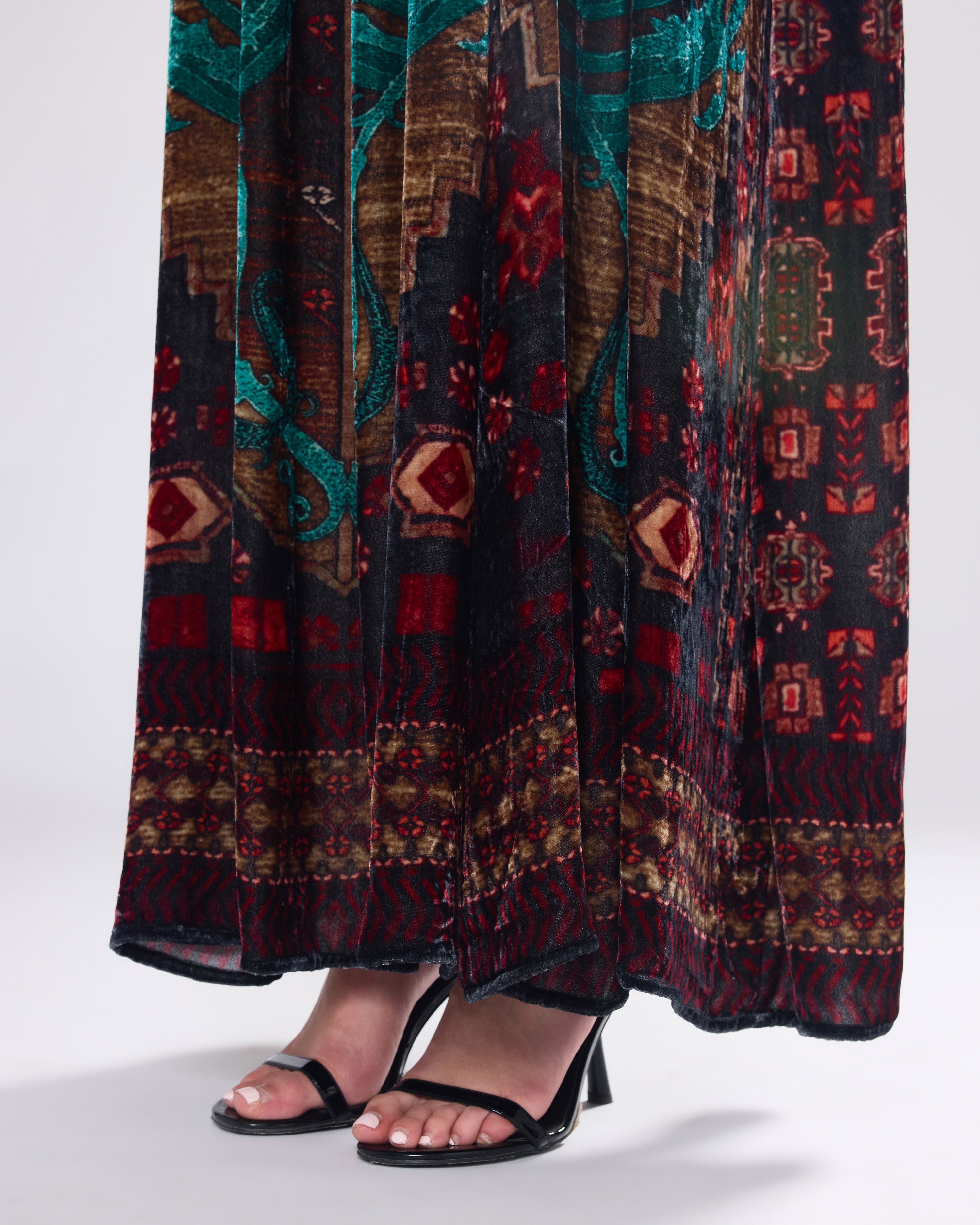 A printed silk kaftan dress with a yoke front and panels for a flare. The kaftan dress has full length sleeves.