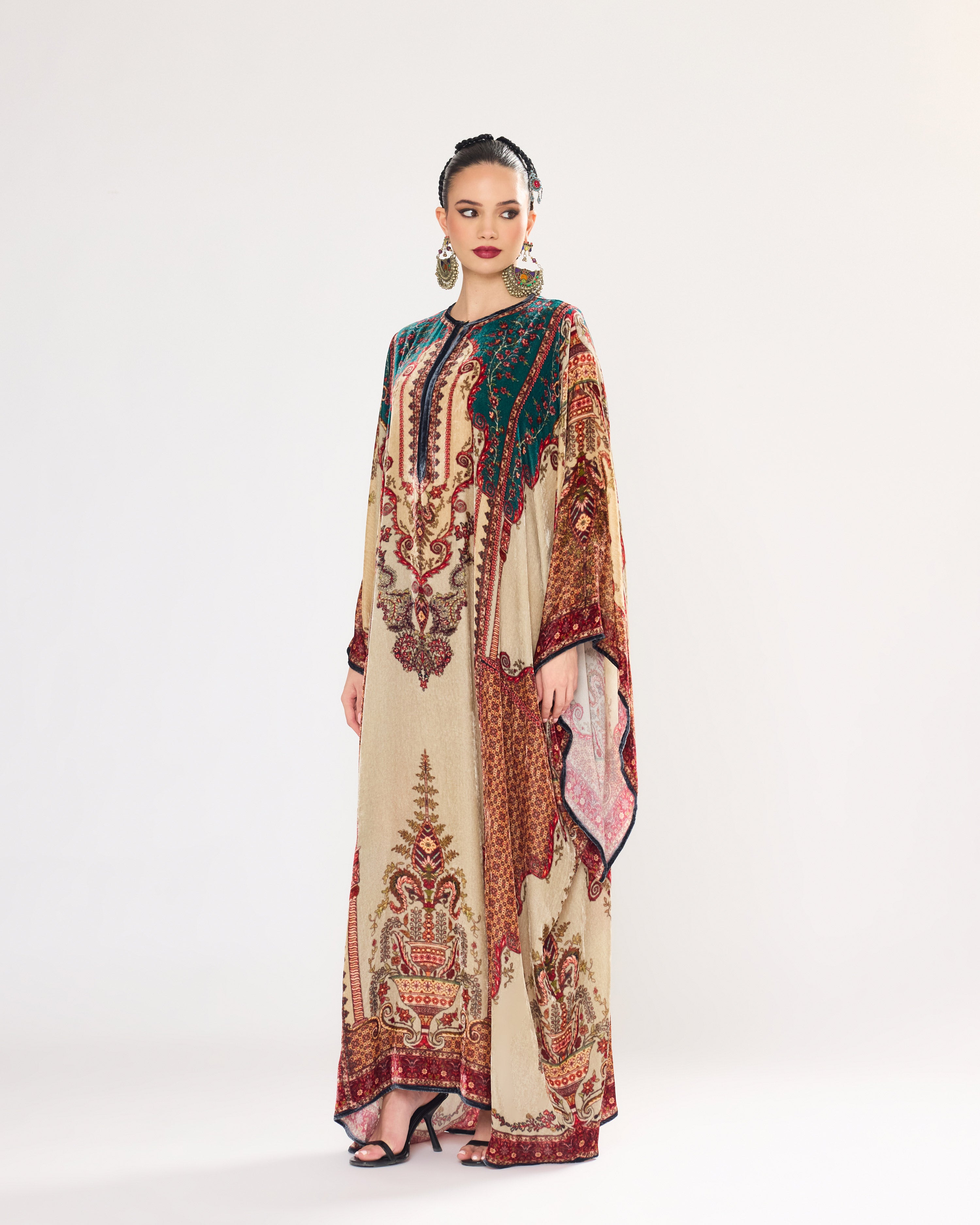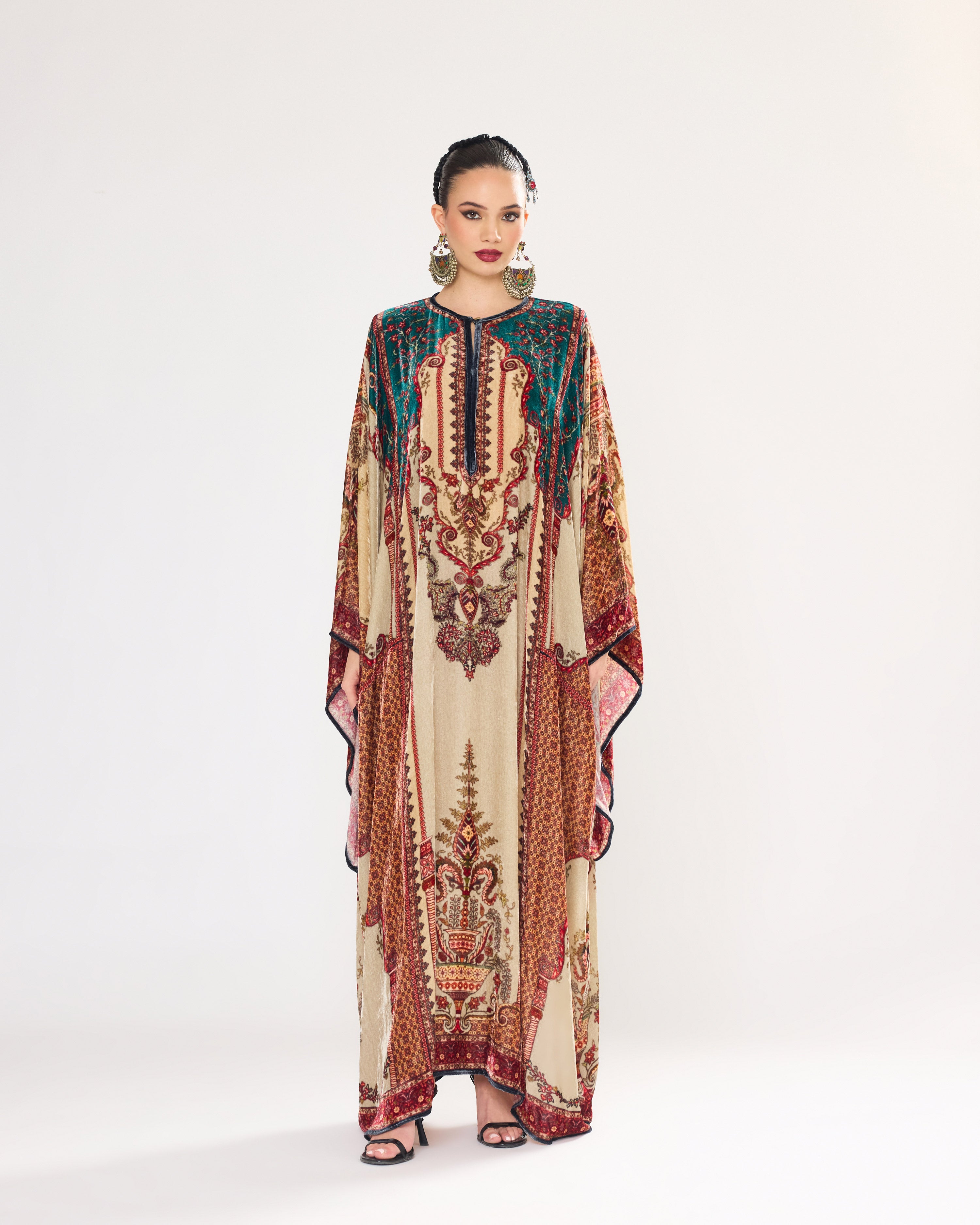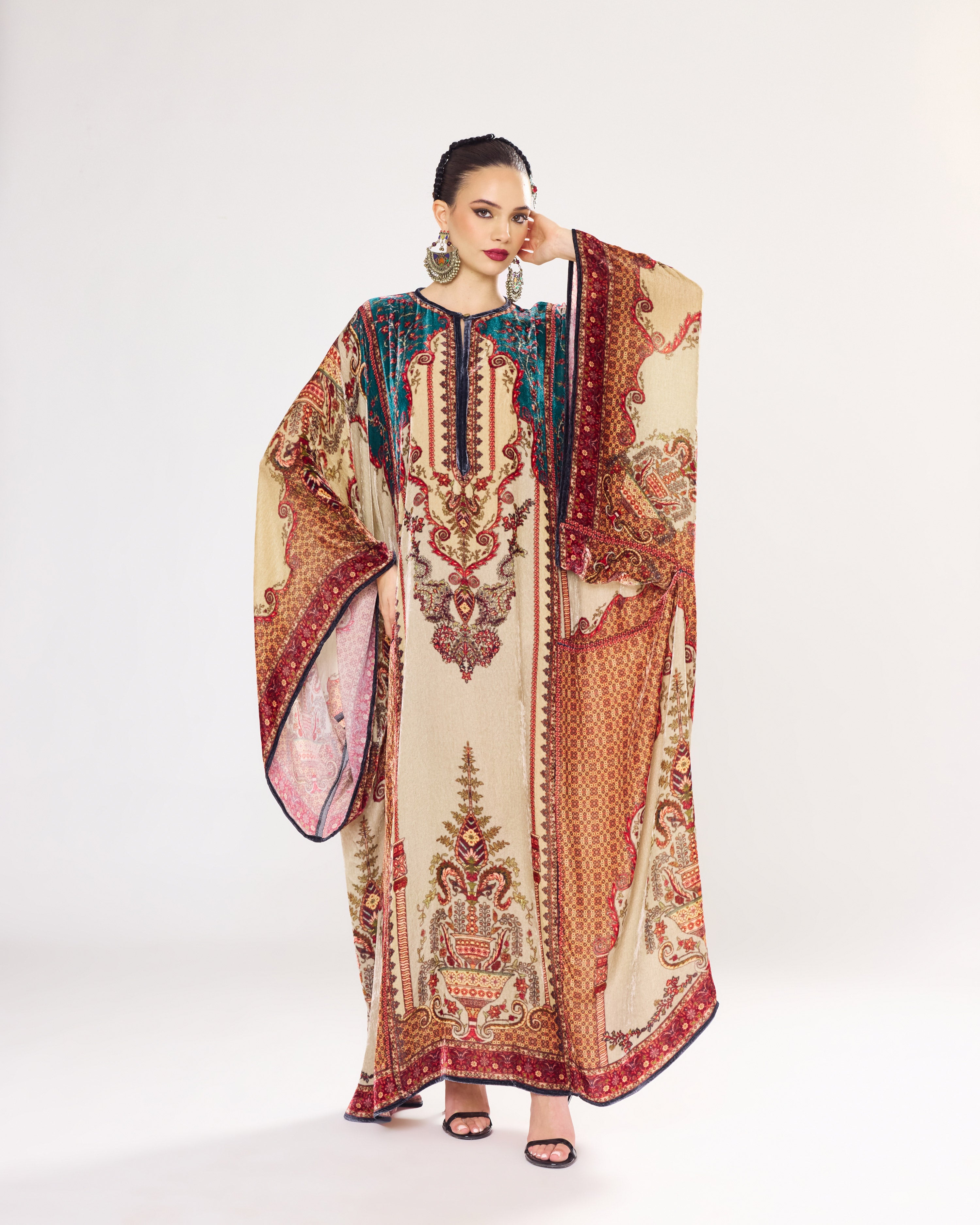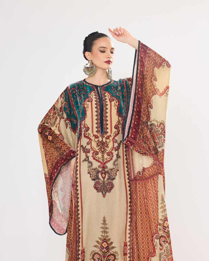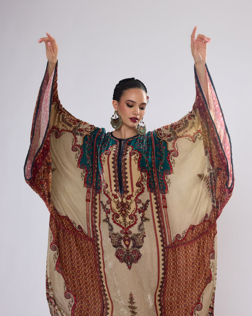 This Kaftan has straight boxy kimono sleeves and panels on the sides.