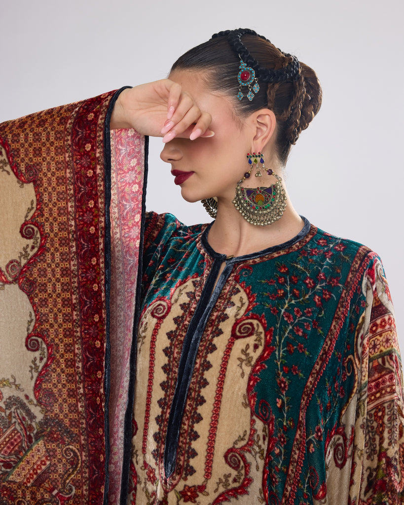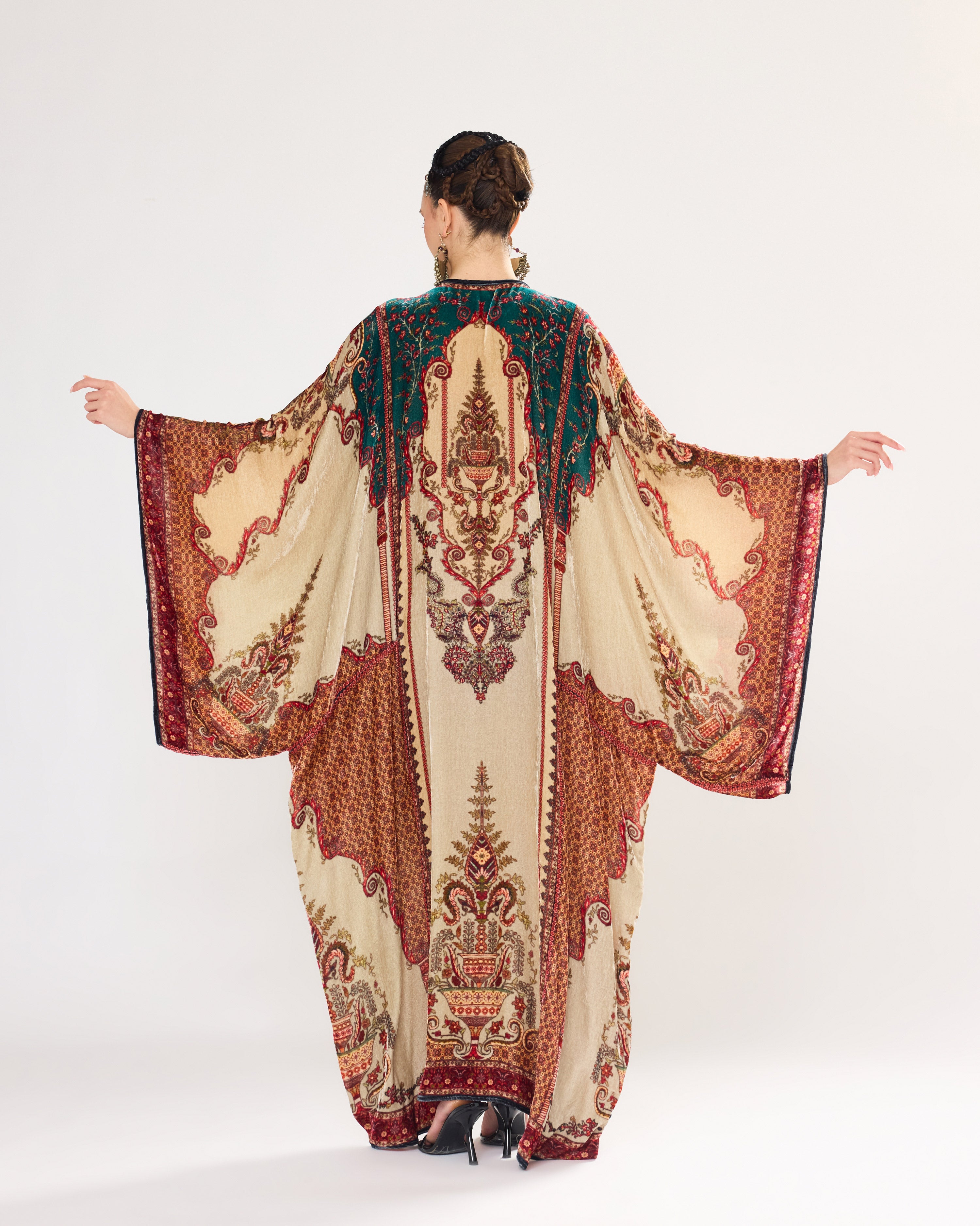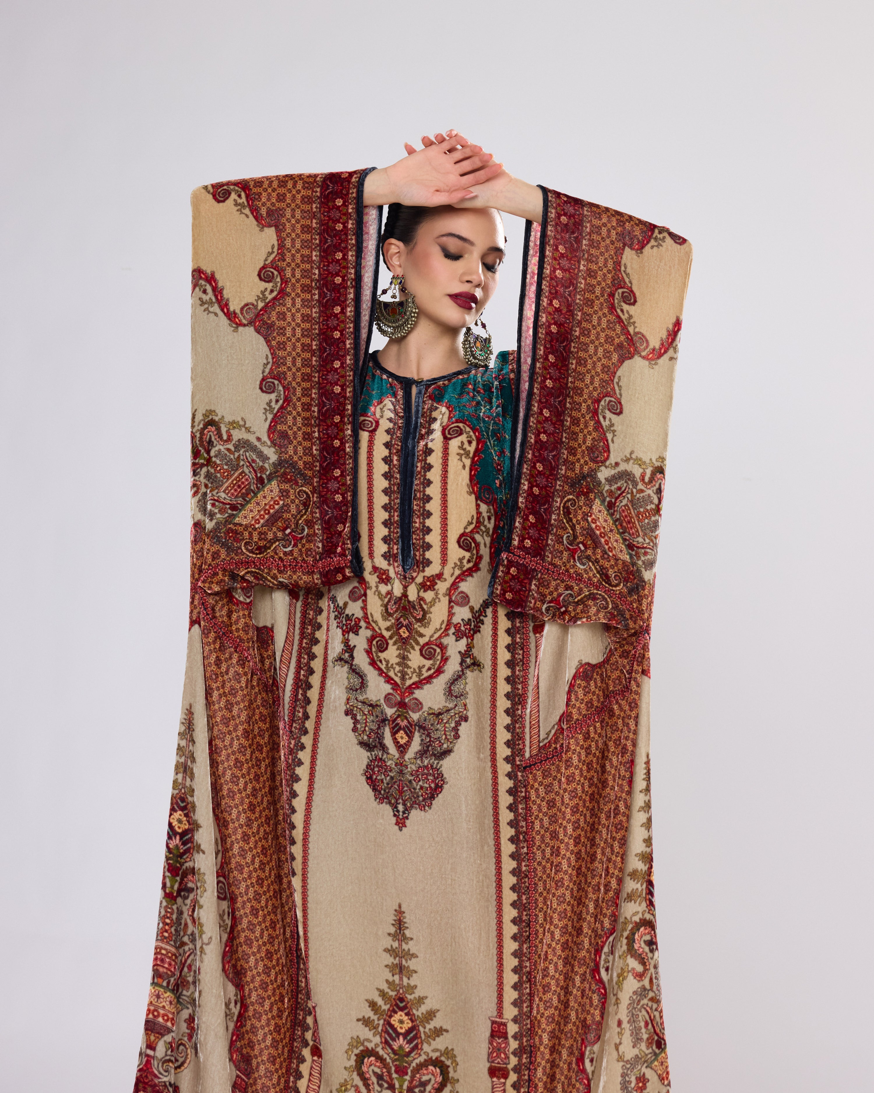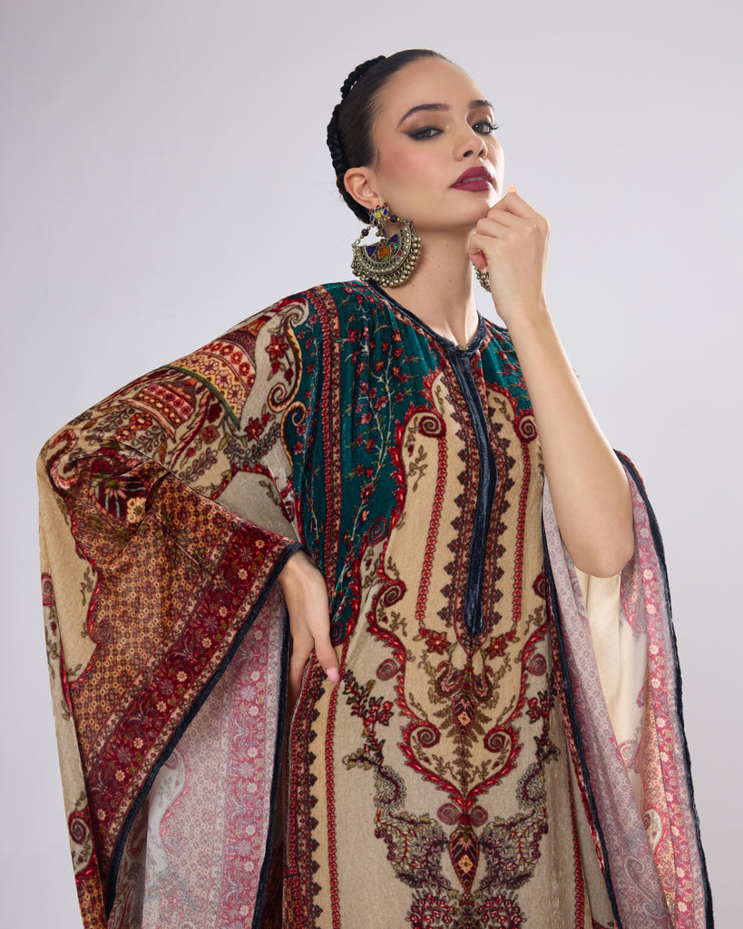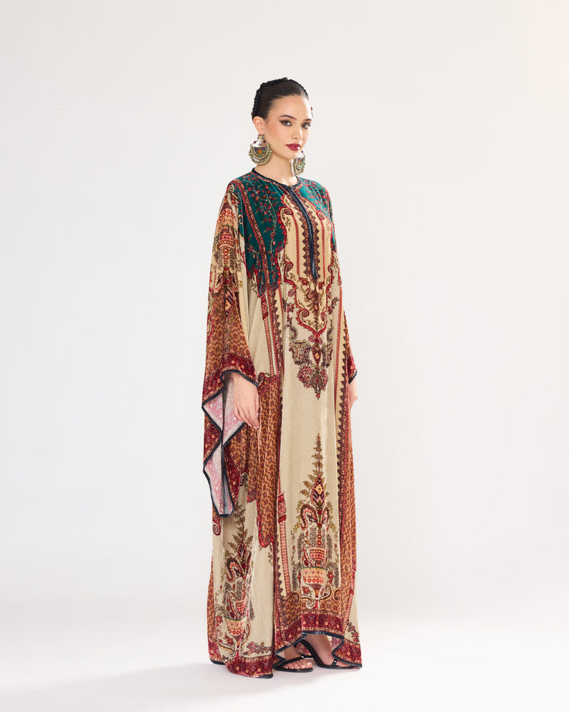 This Kaftan has straight boxy kimono sleeves and panels on the sides.