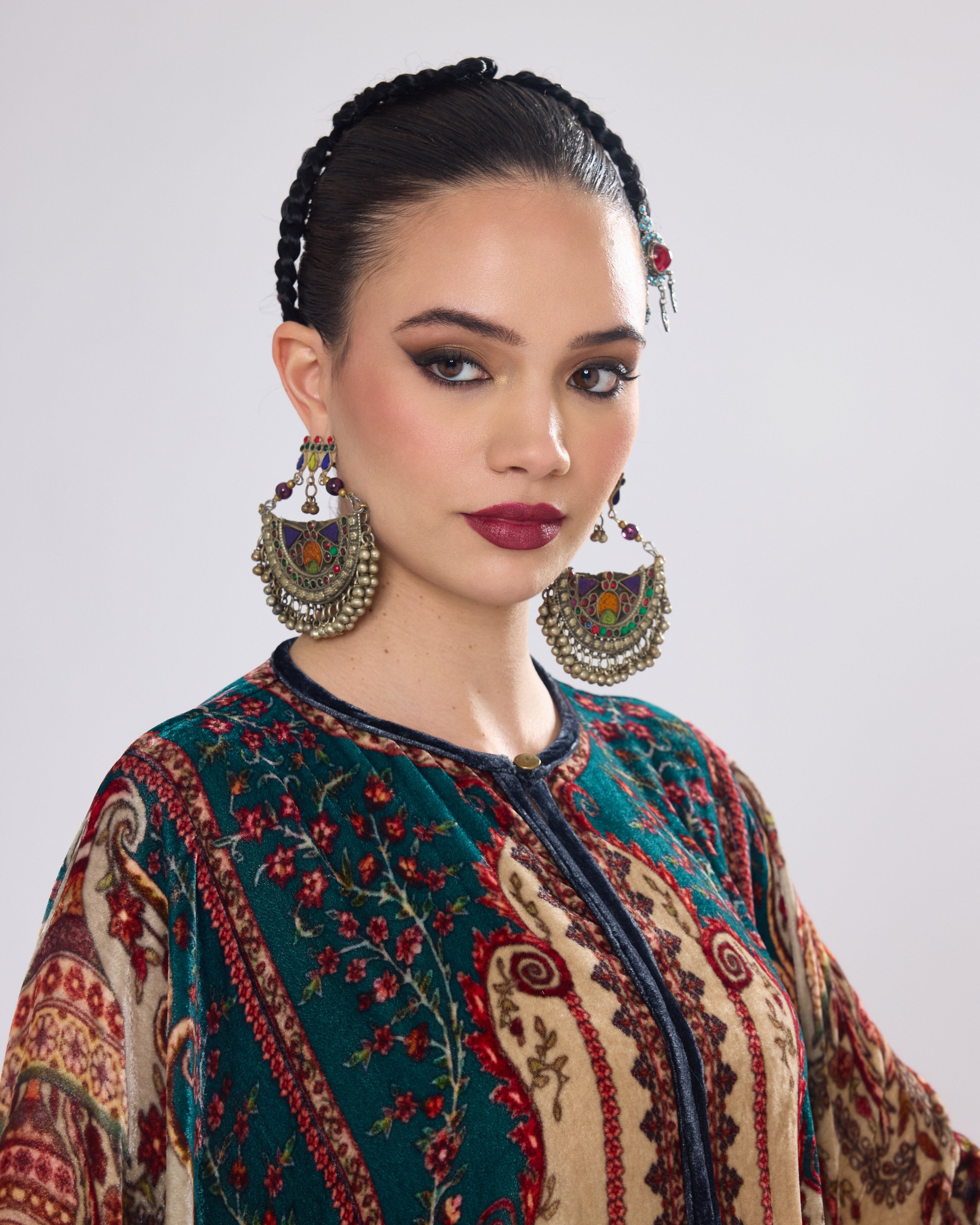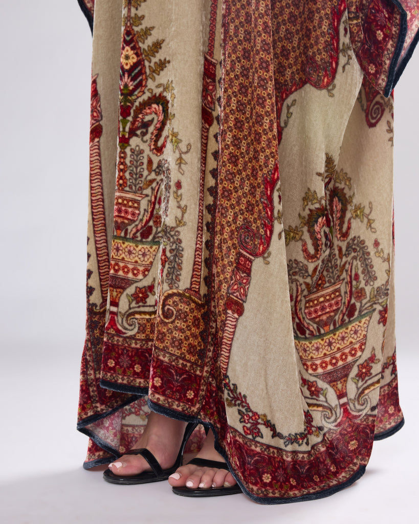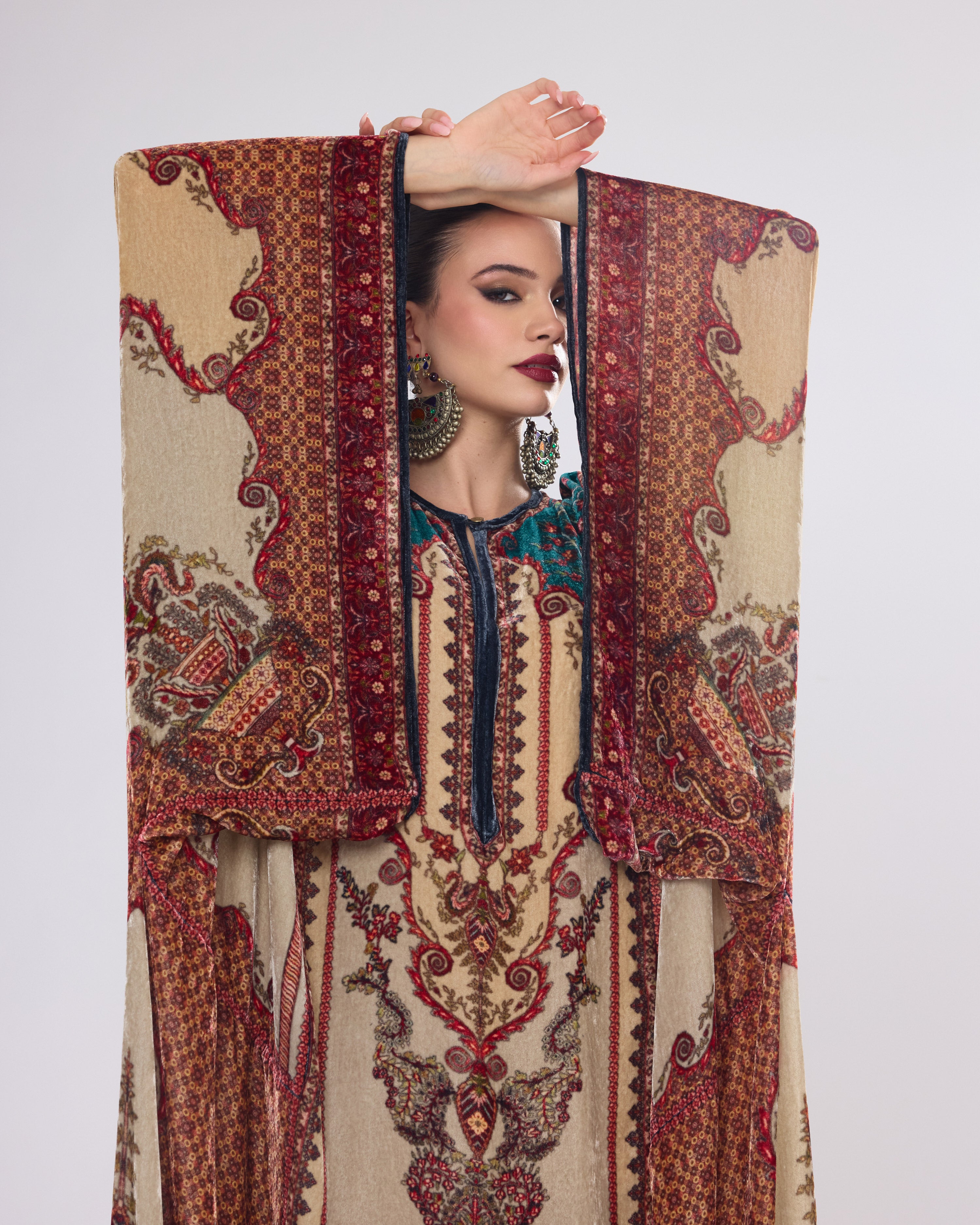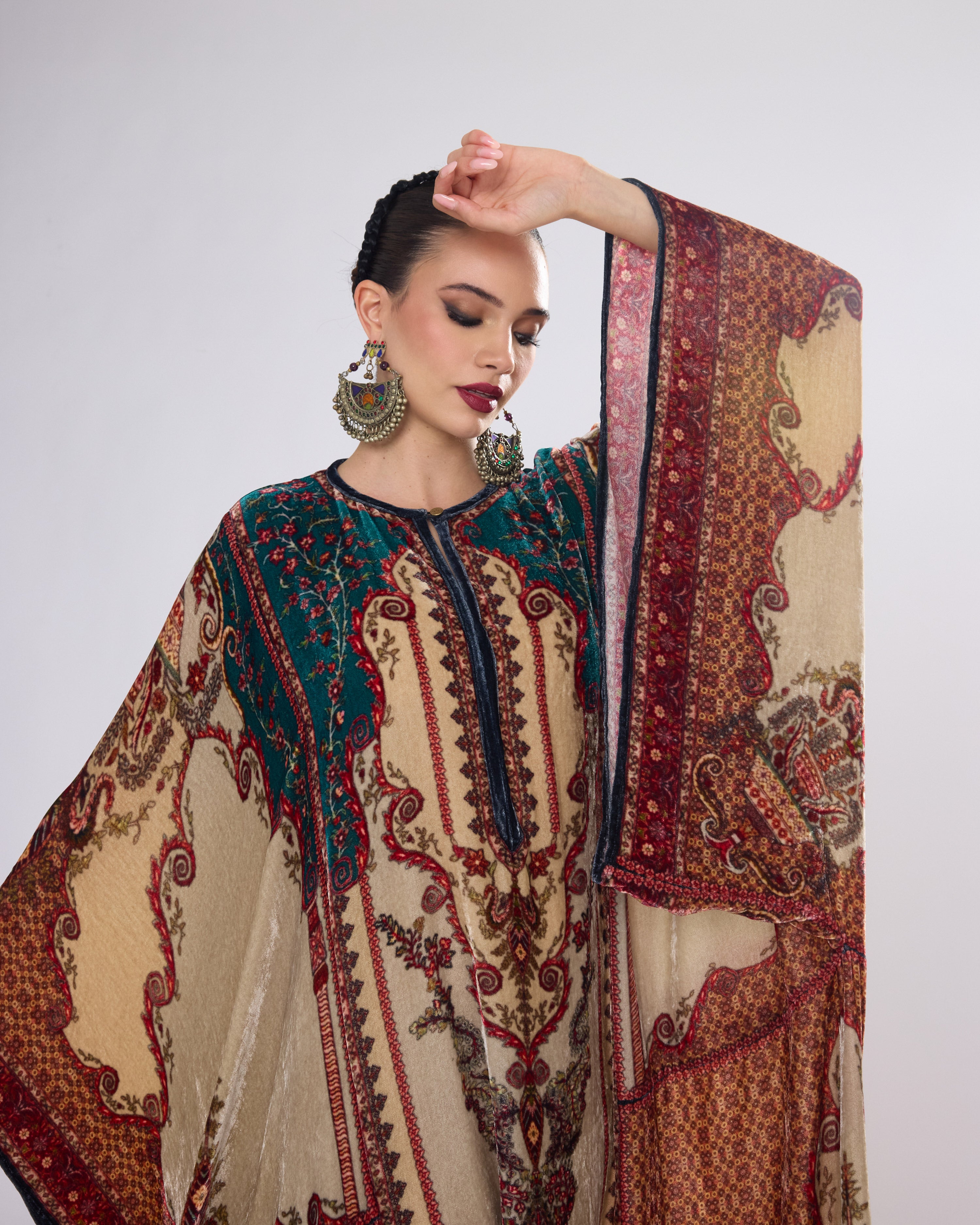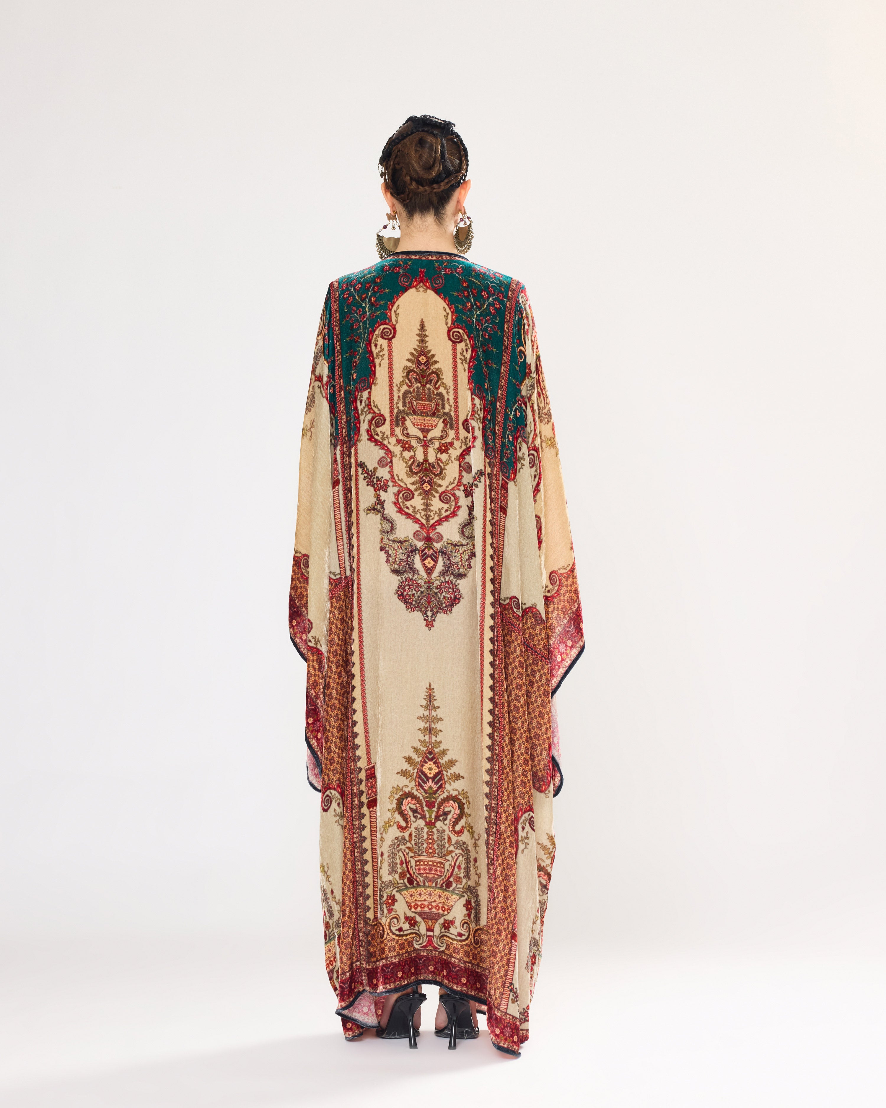 This Kaftan has straight boxy kimono sleeves and panels on the sides.
