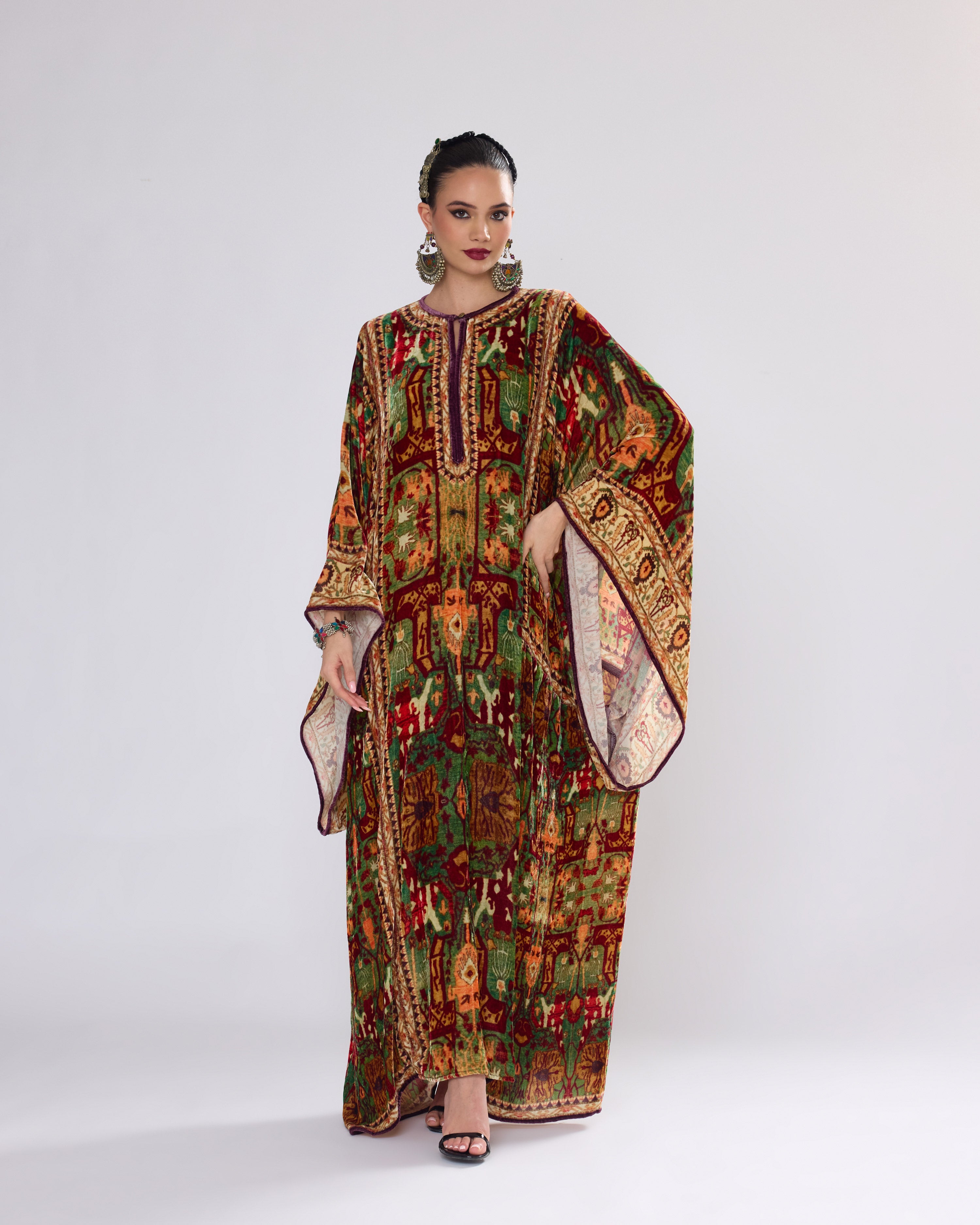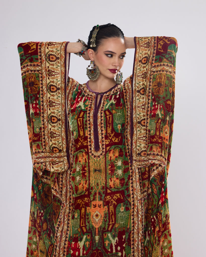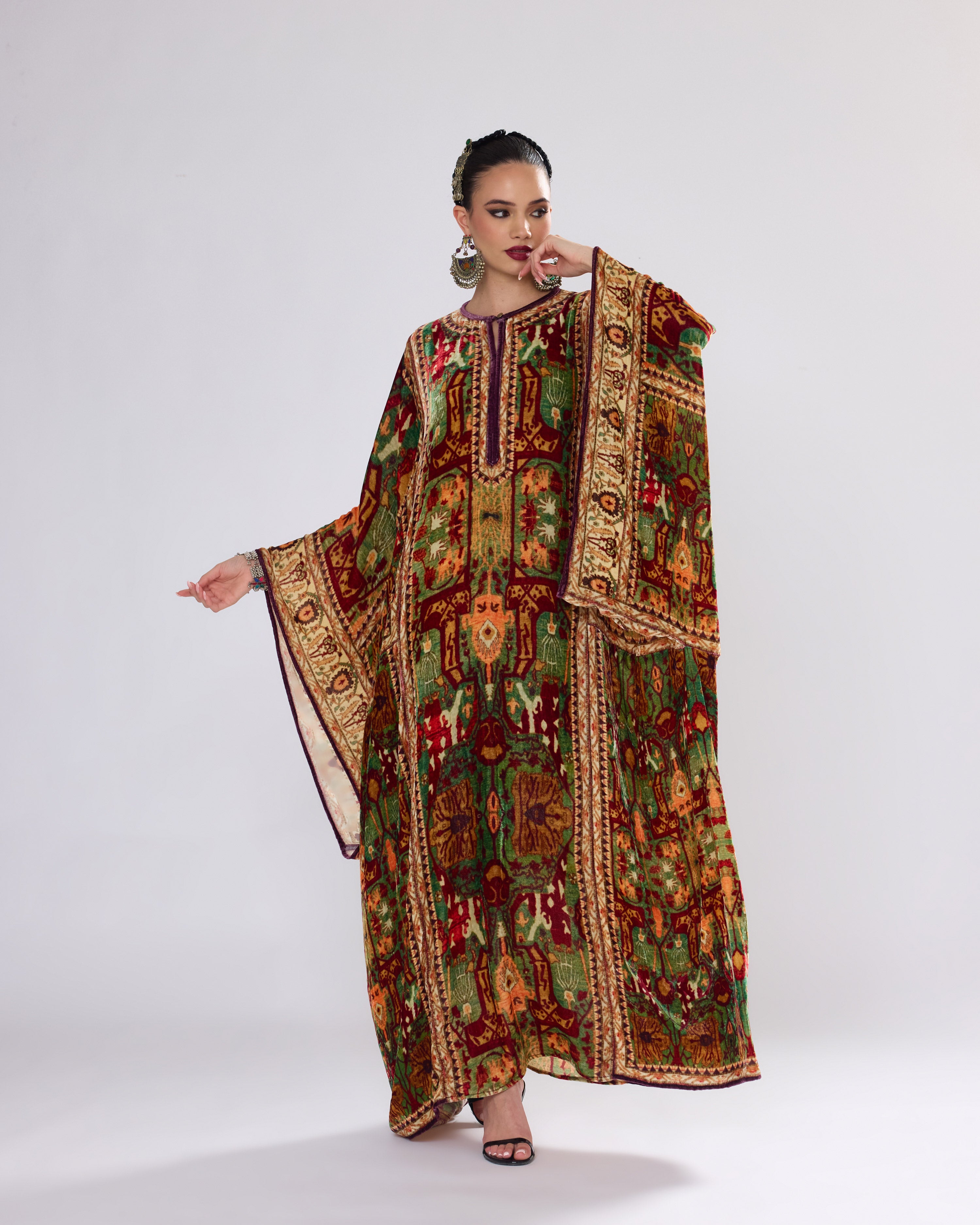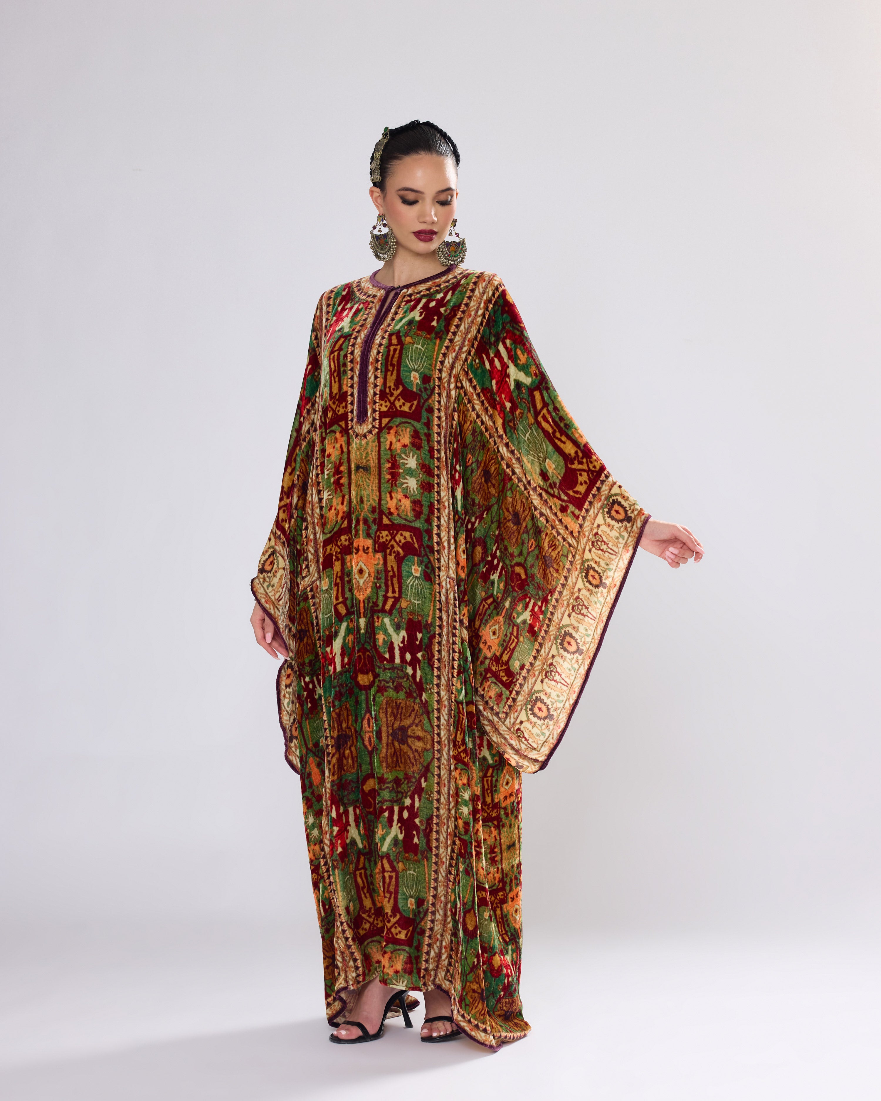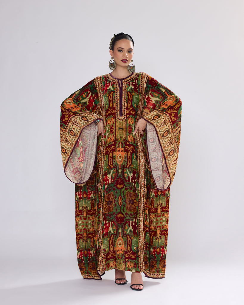 This Kaftan has straight boxy kimono sleeves and panels on the sides.