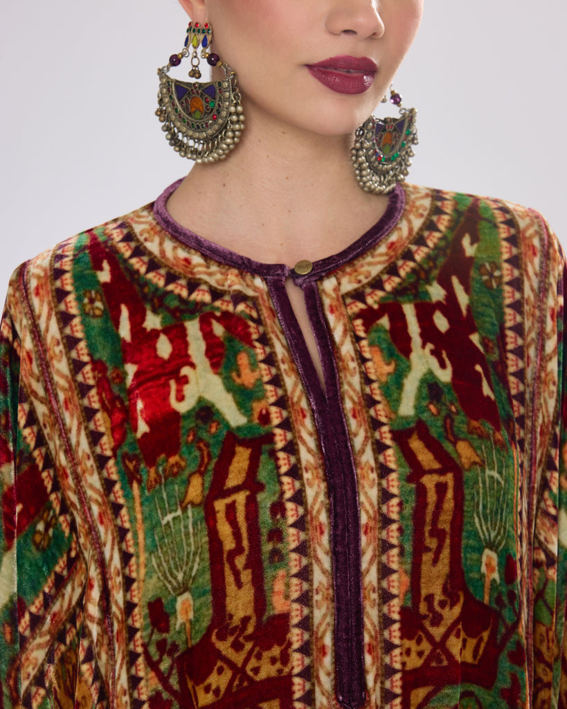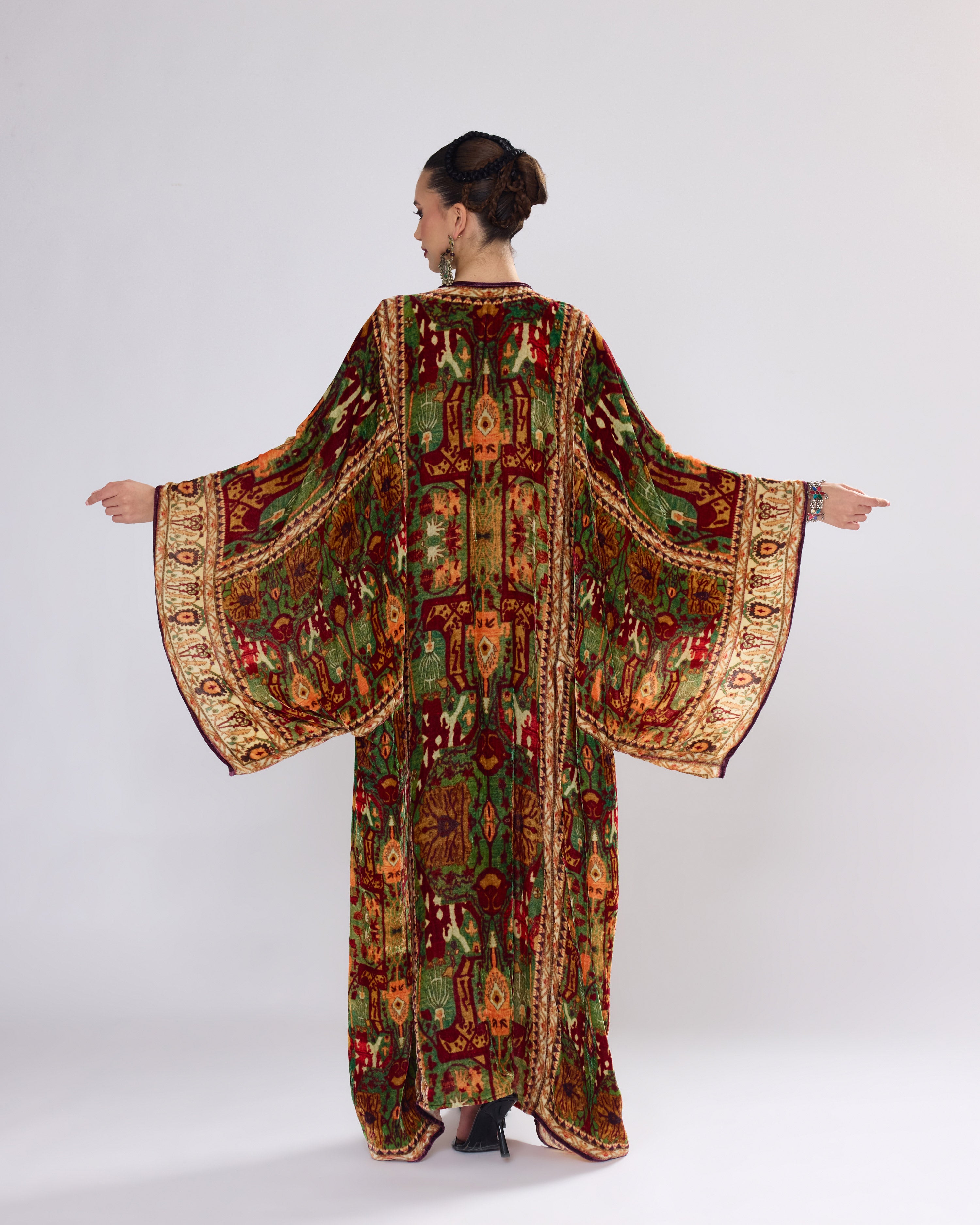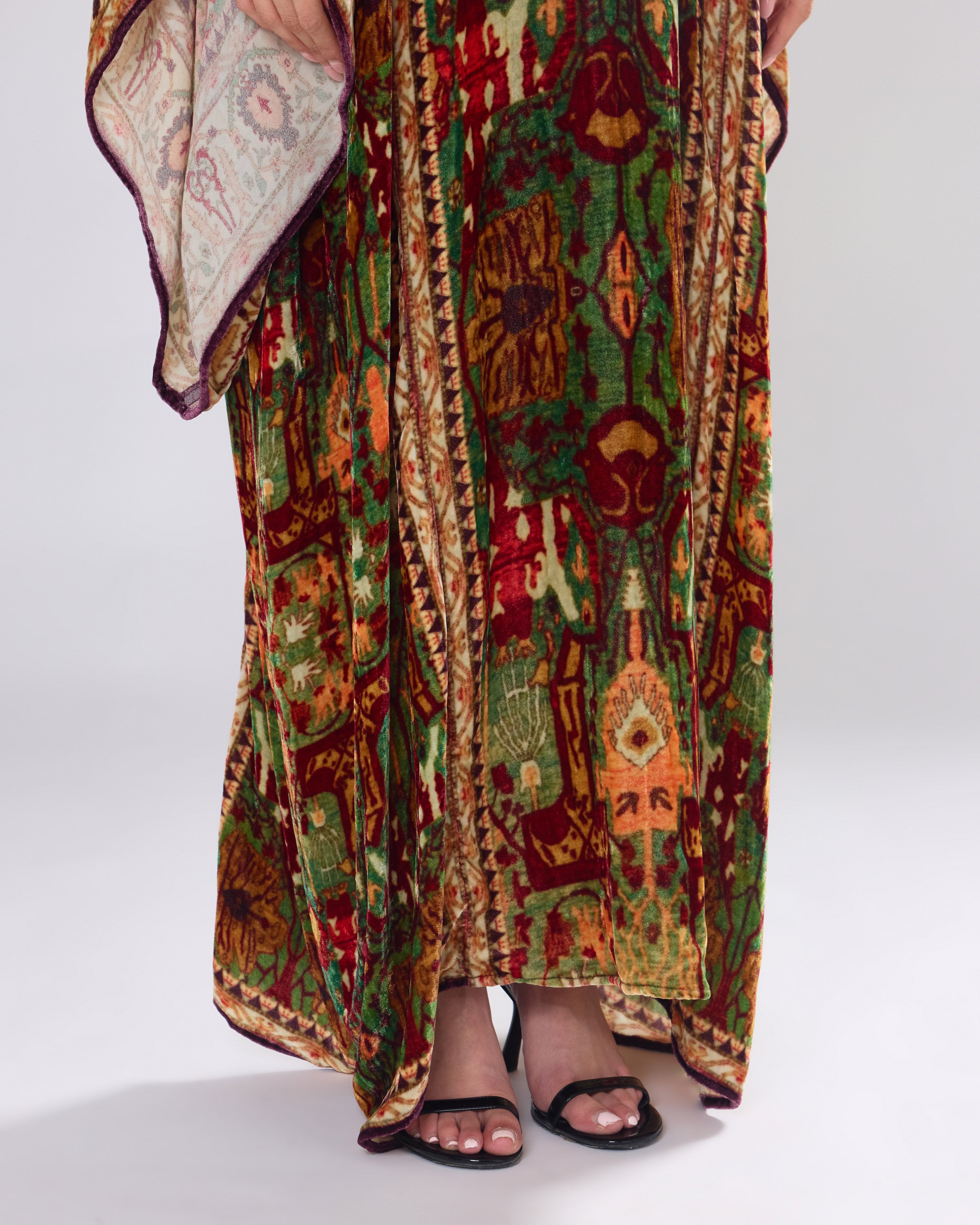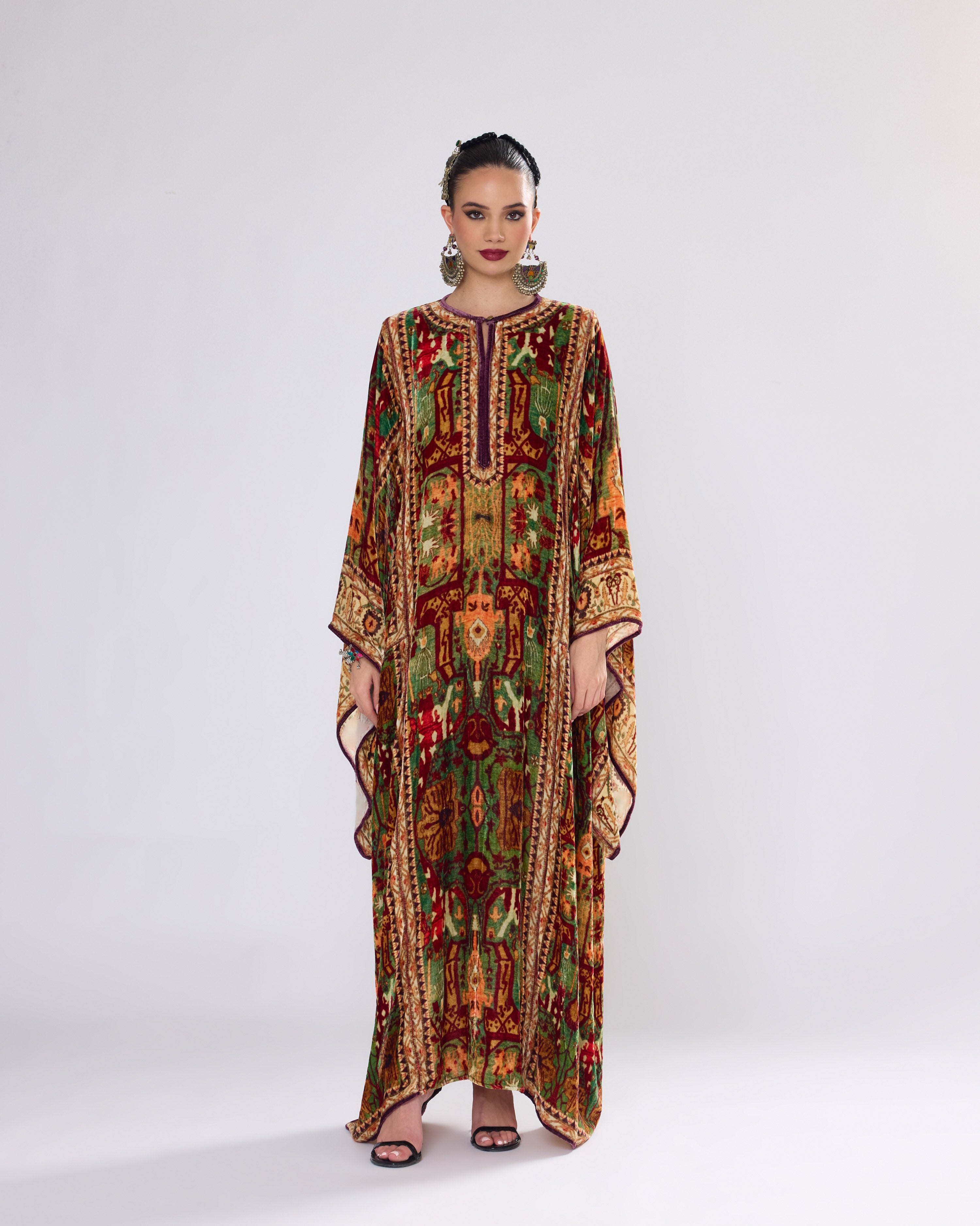 This Kaftan has straight boxy kimono sleeves and panels on the sides.