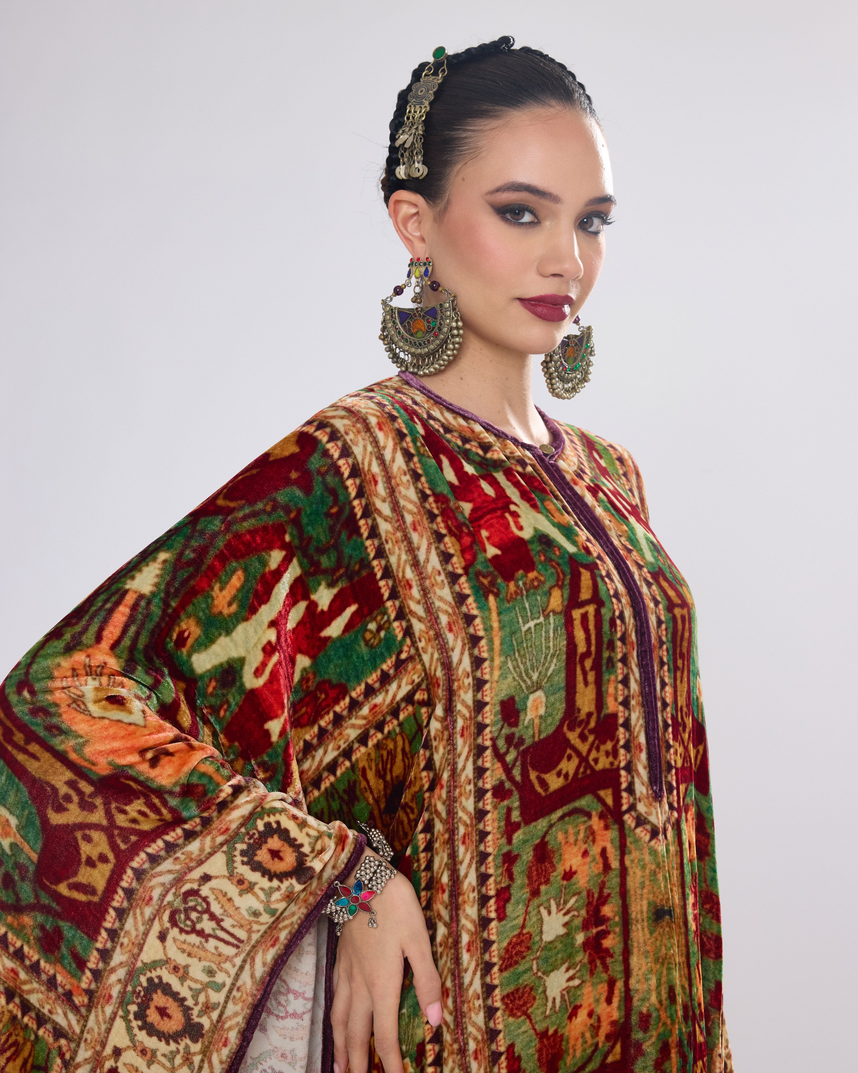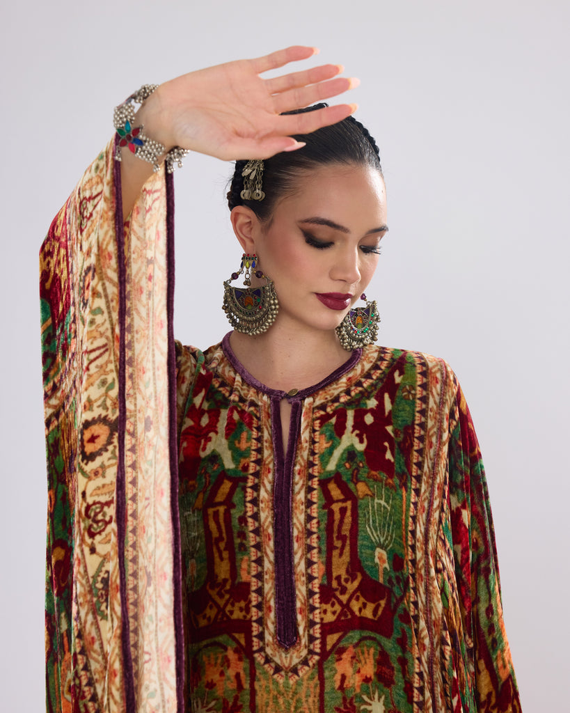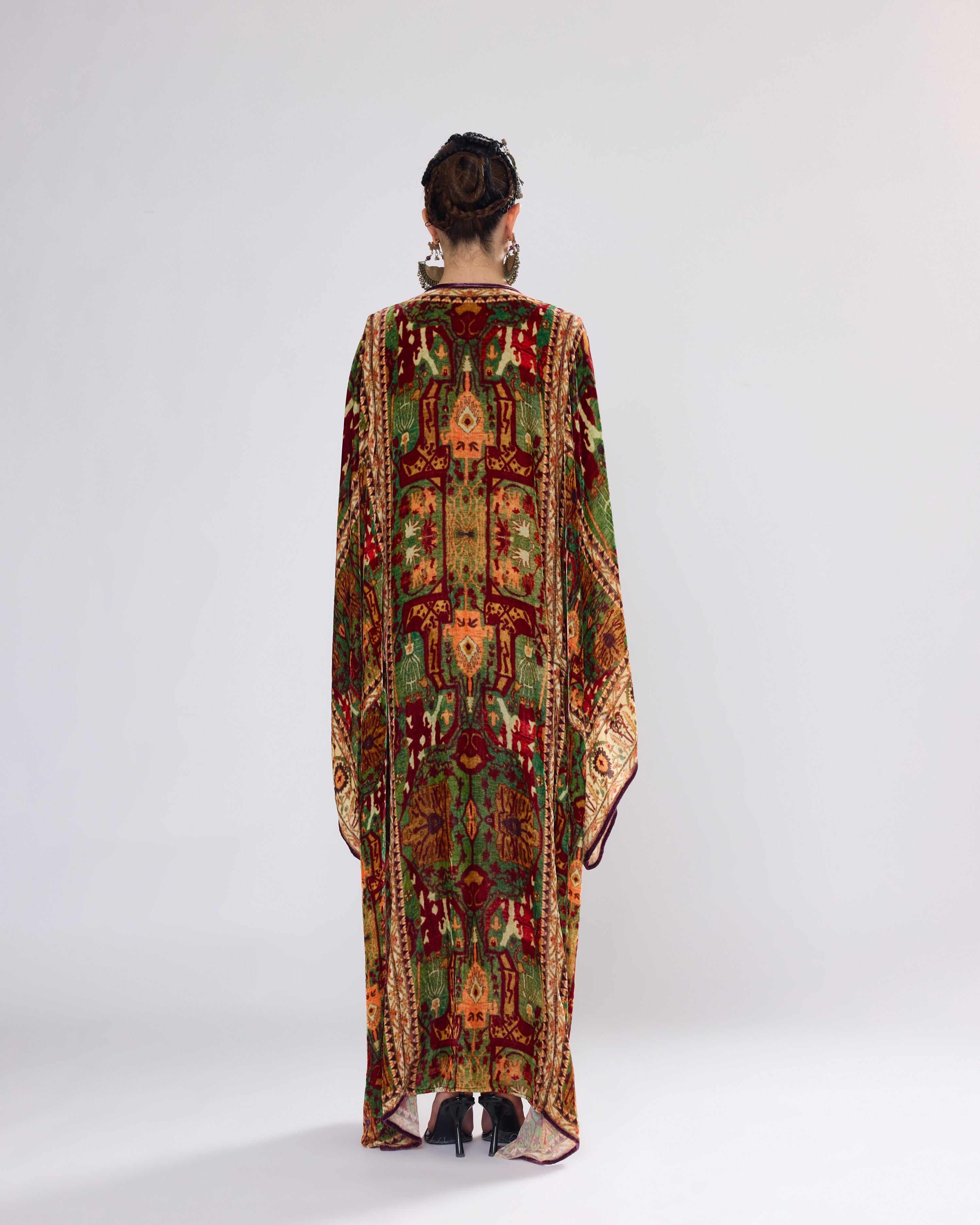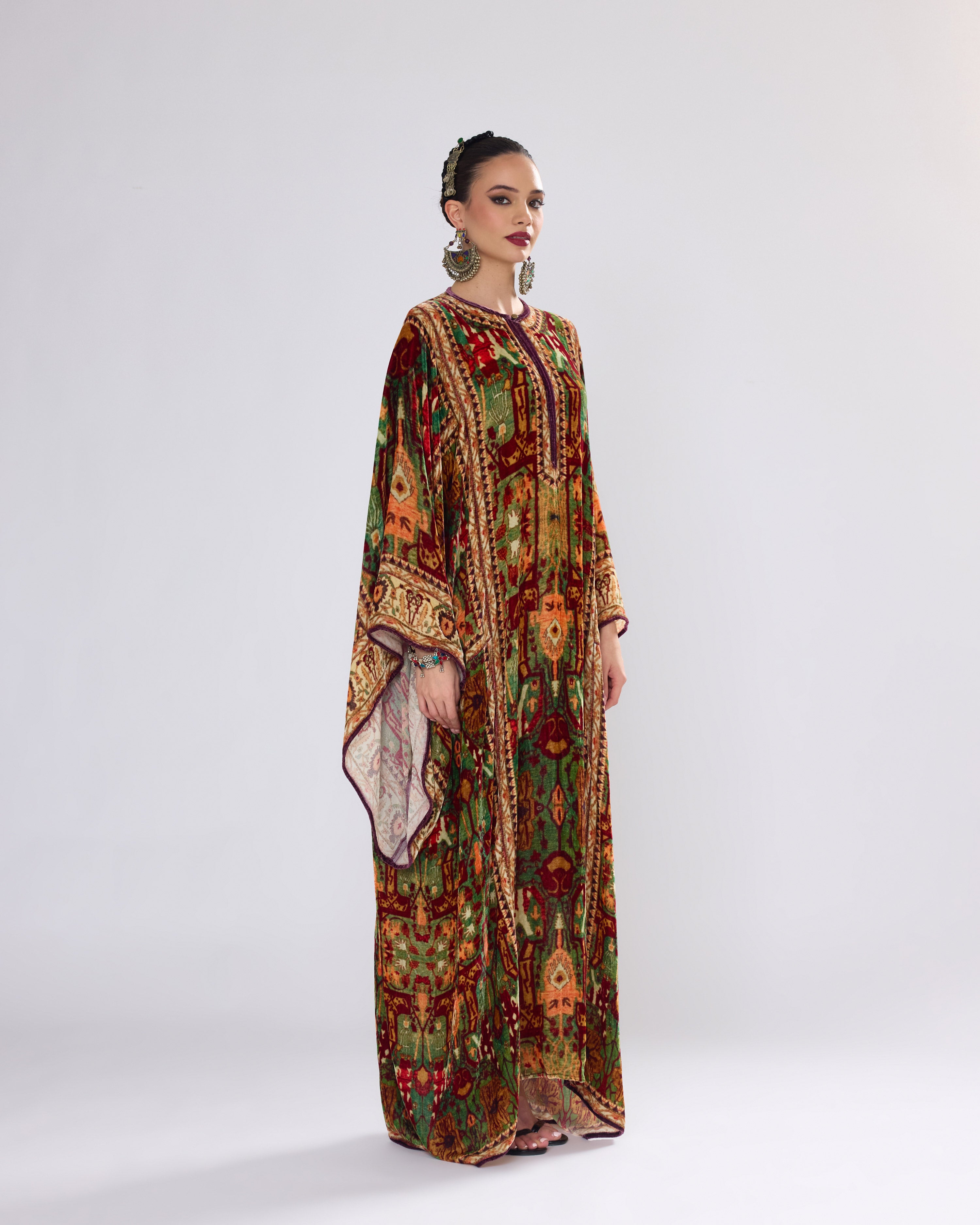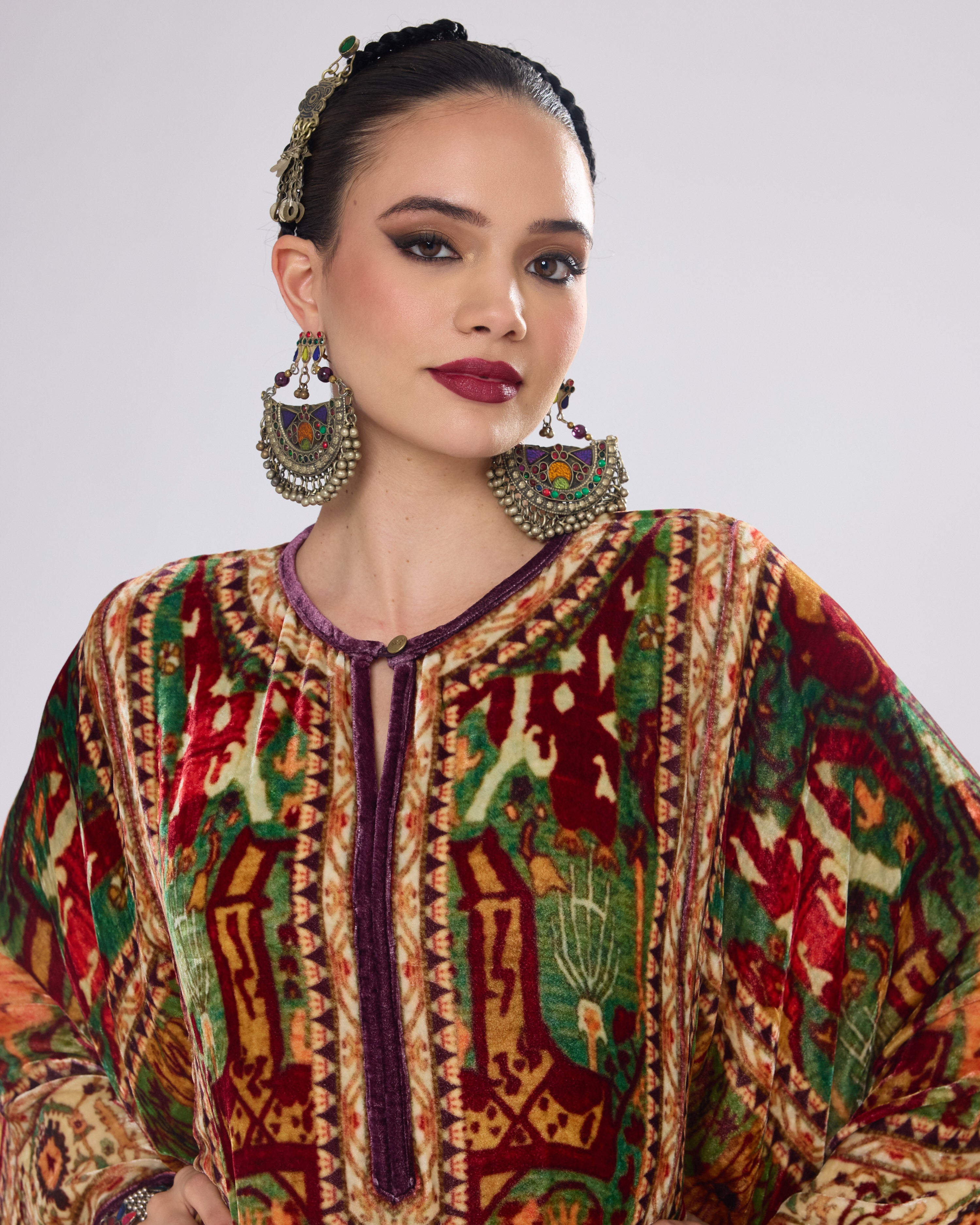 This Kaftan has straight boxy kimono sleeves and panels on the sides.