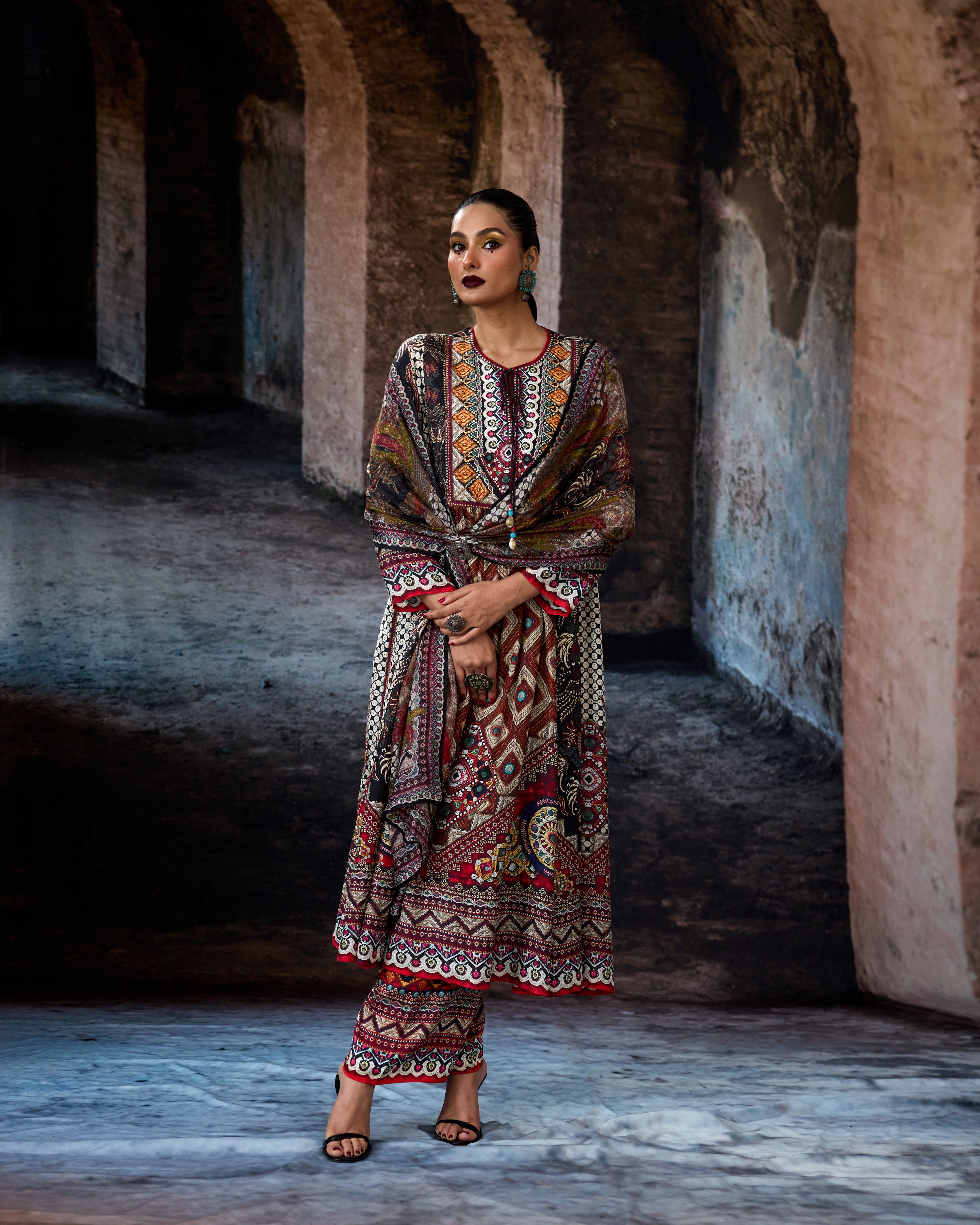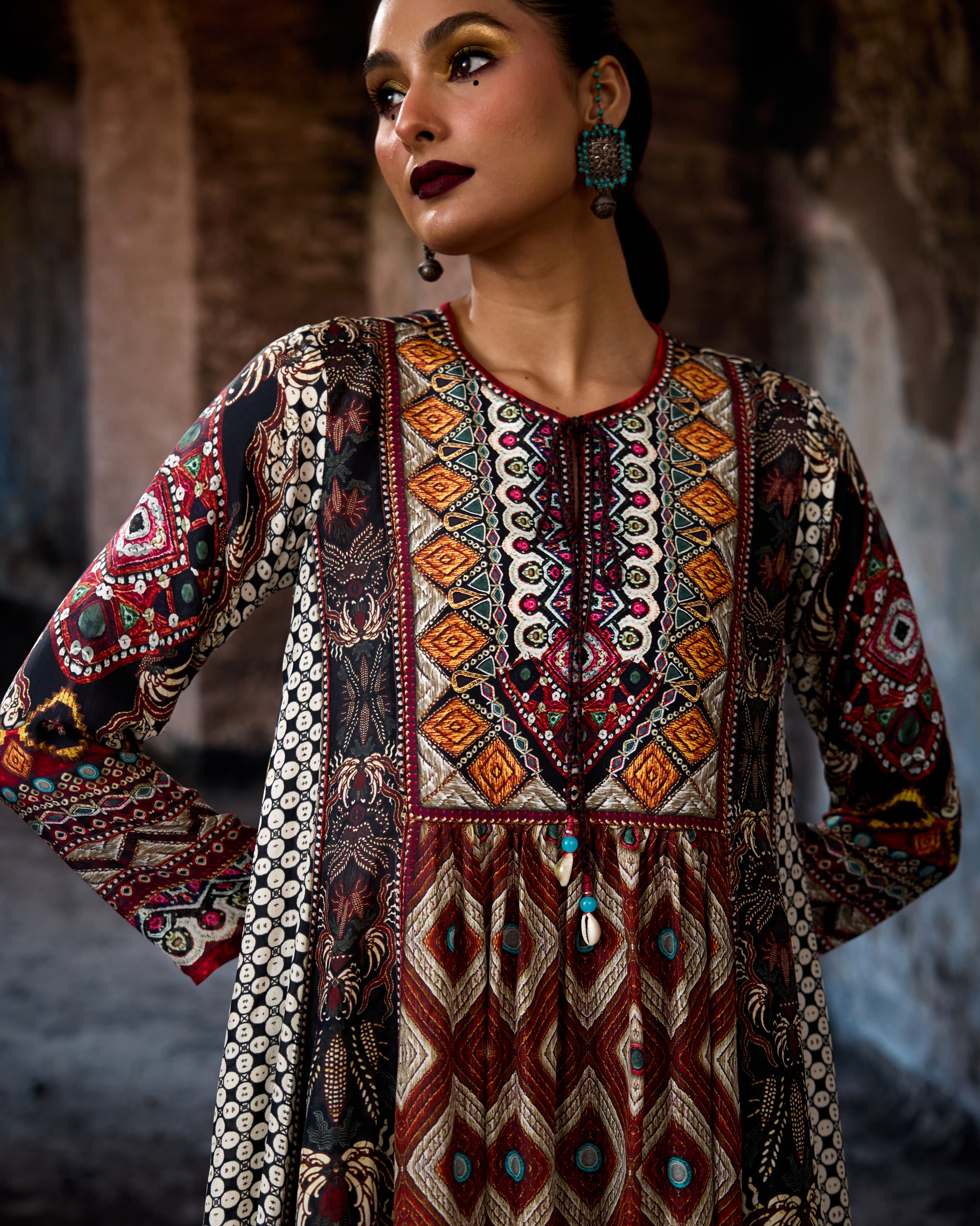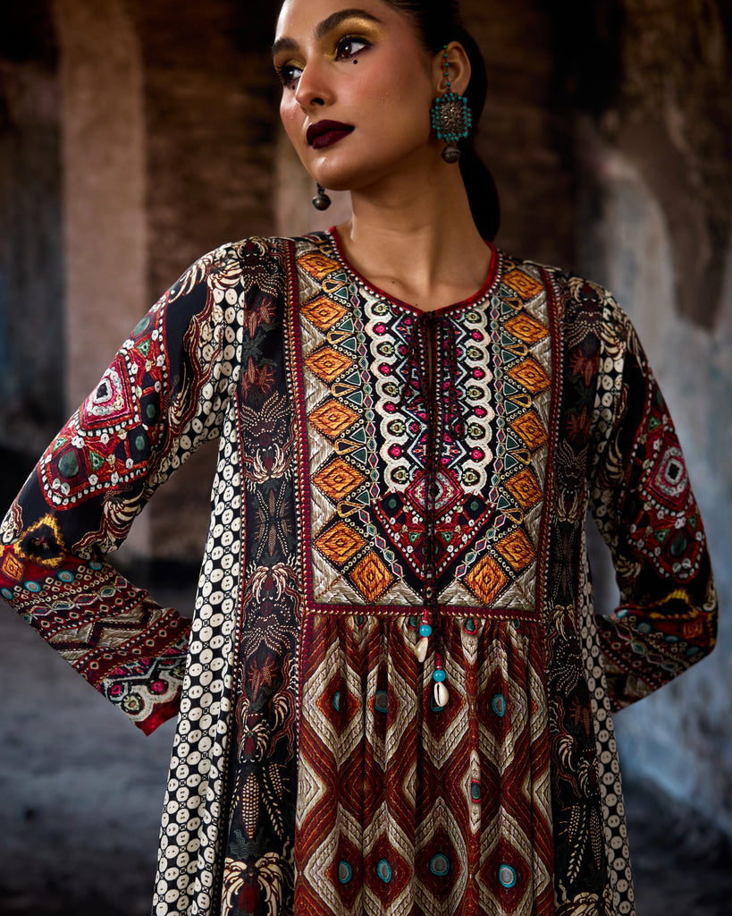 This tunic comes with a coordinating printed palazzo pant and a silk kota printed Stole of size 20"x100" which can be ordered as per the drop down menu as a set.