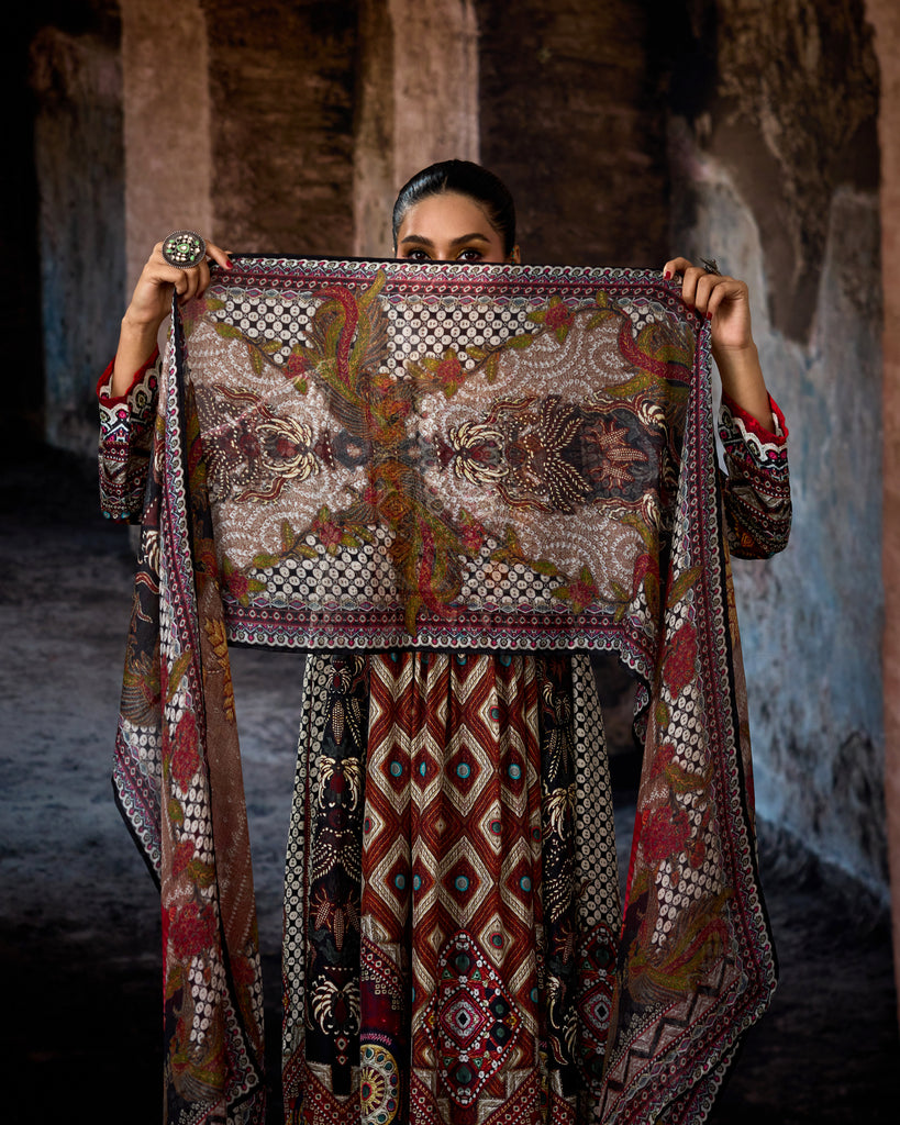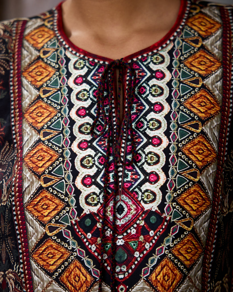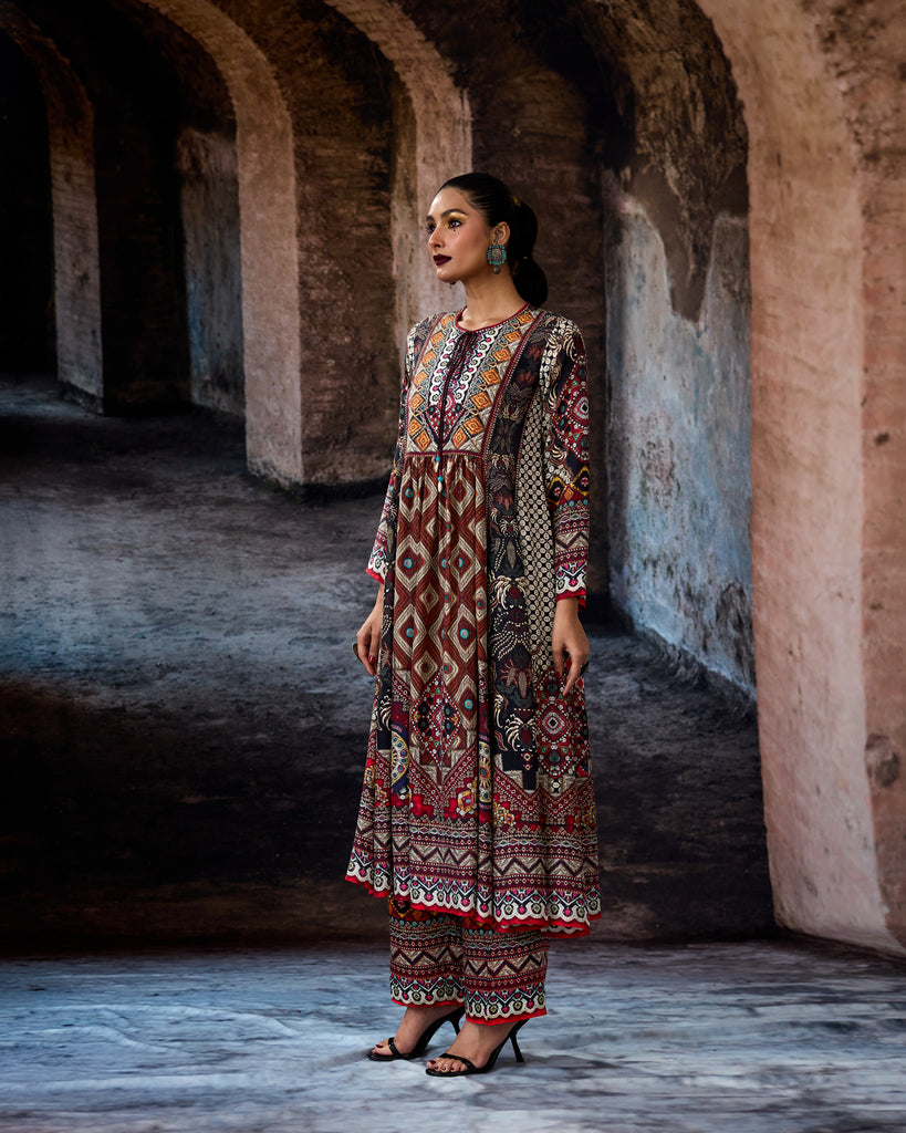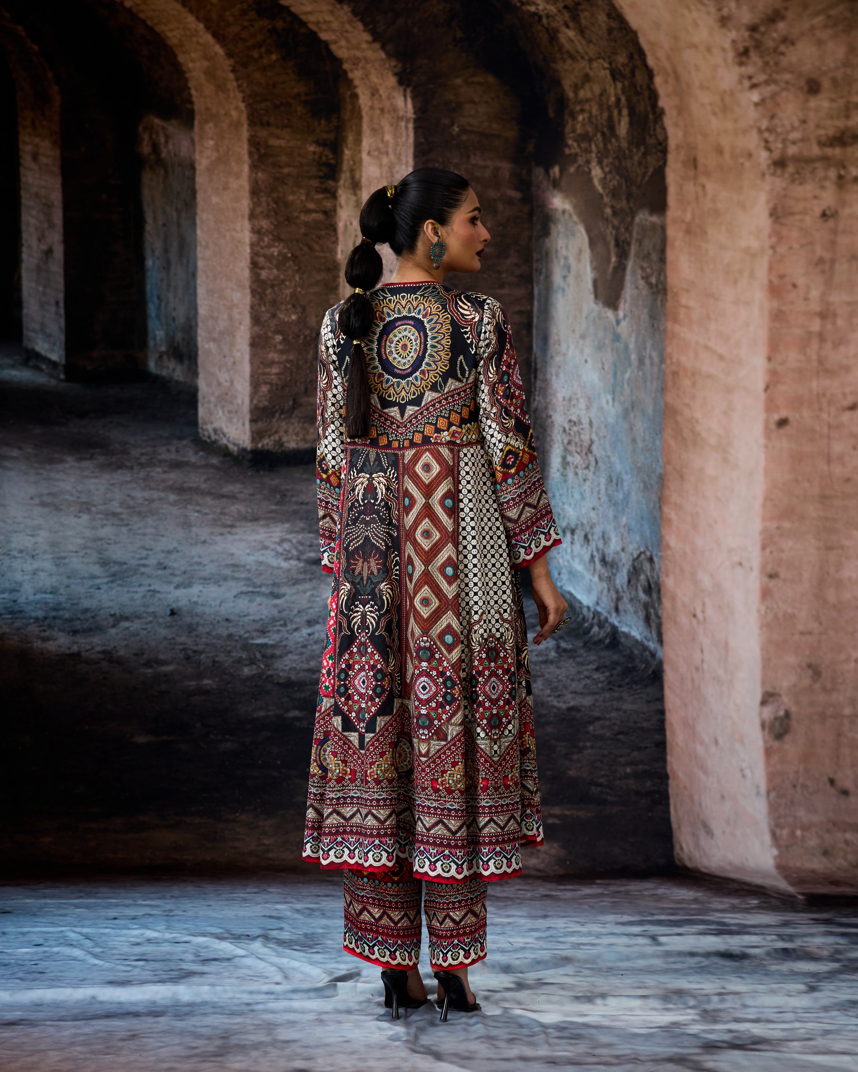 This tunic comes with a coordinating printed palazzo pant and a silk kota printed Stole of size 20"x100" which can be ordered as per the drop down menu as a set.
