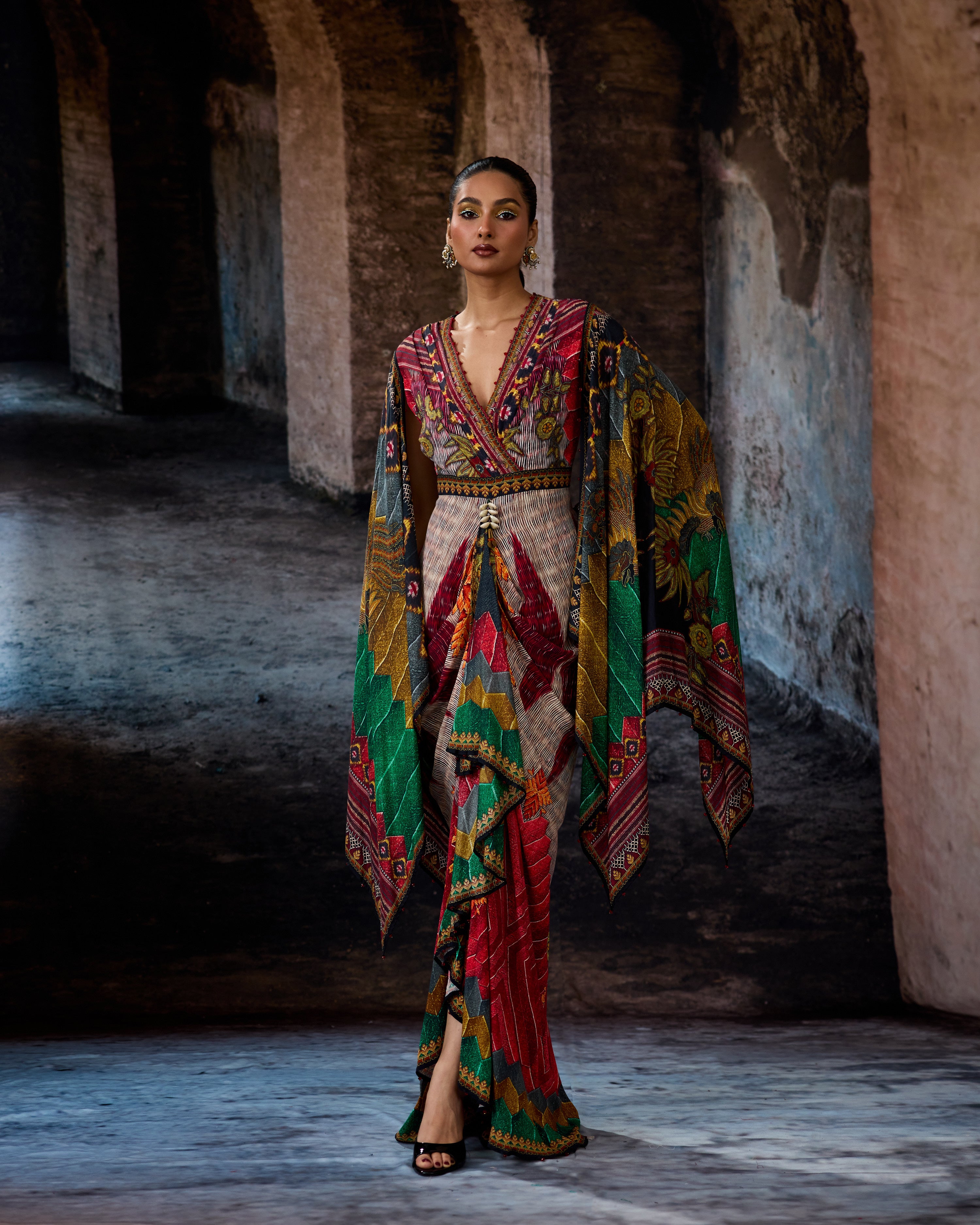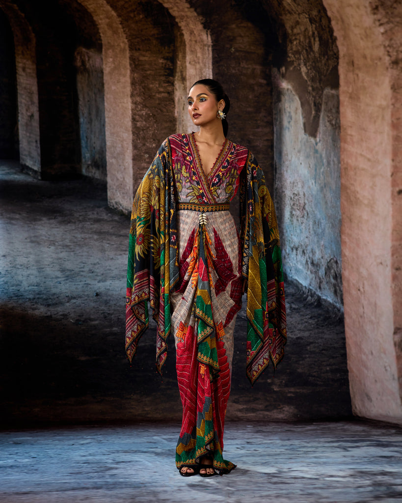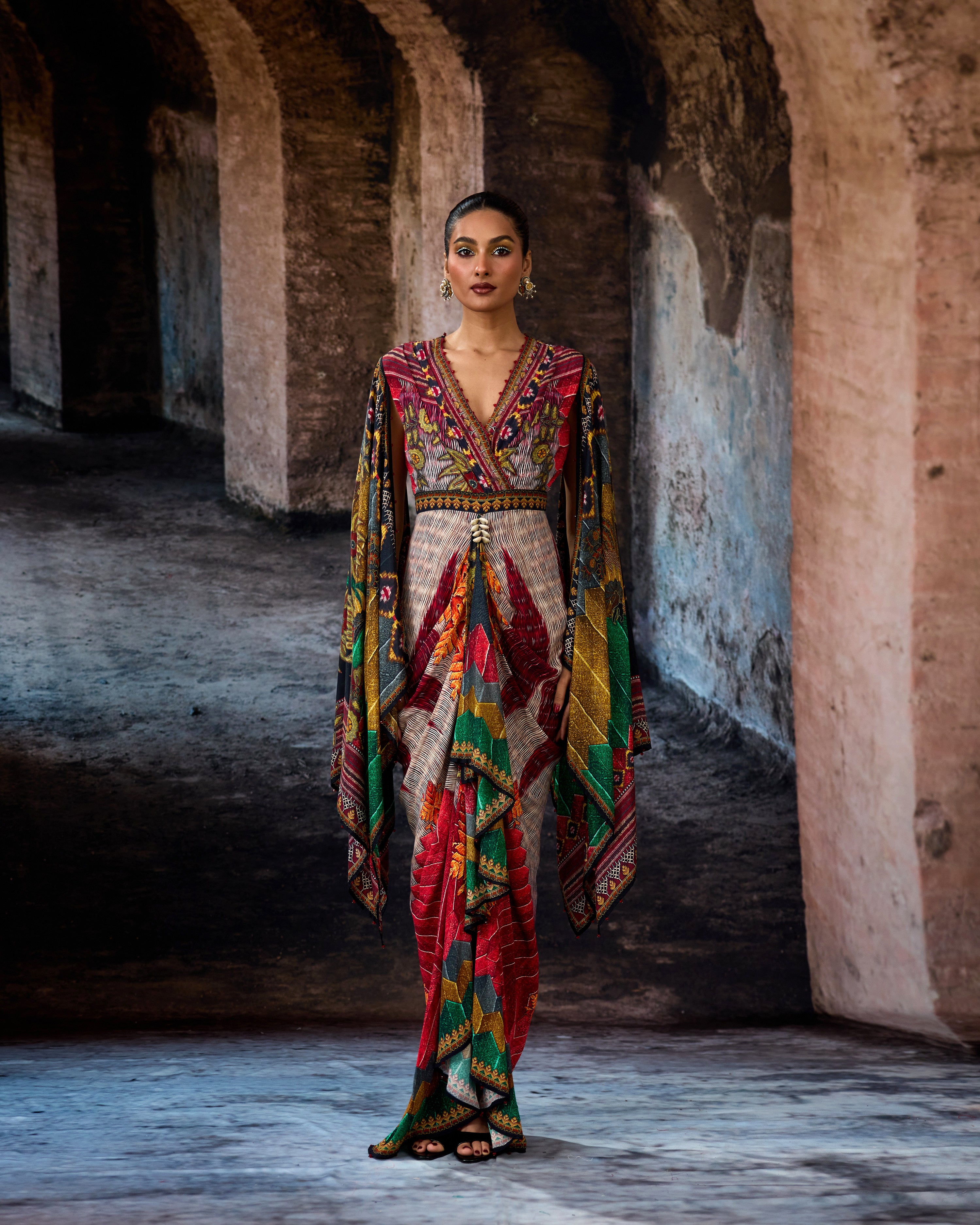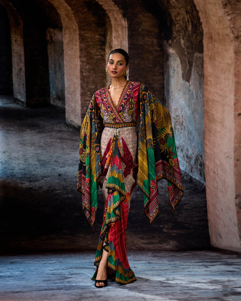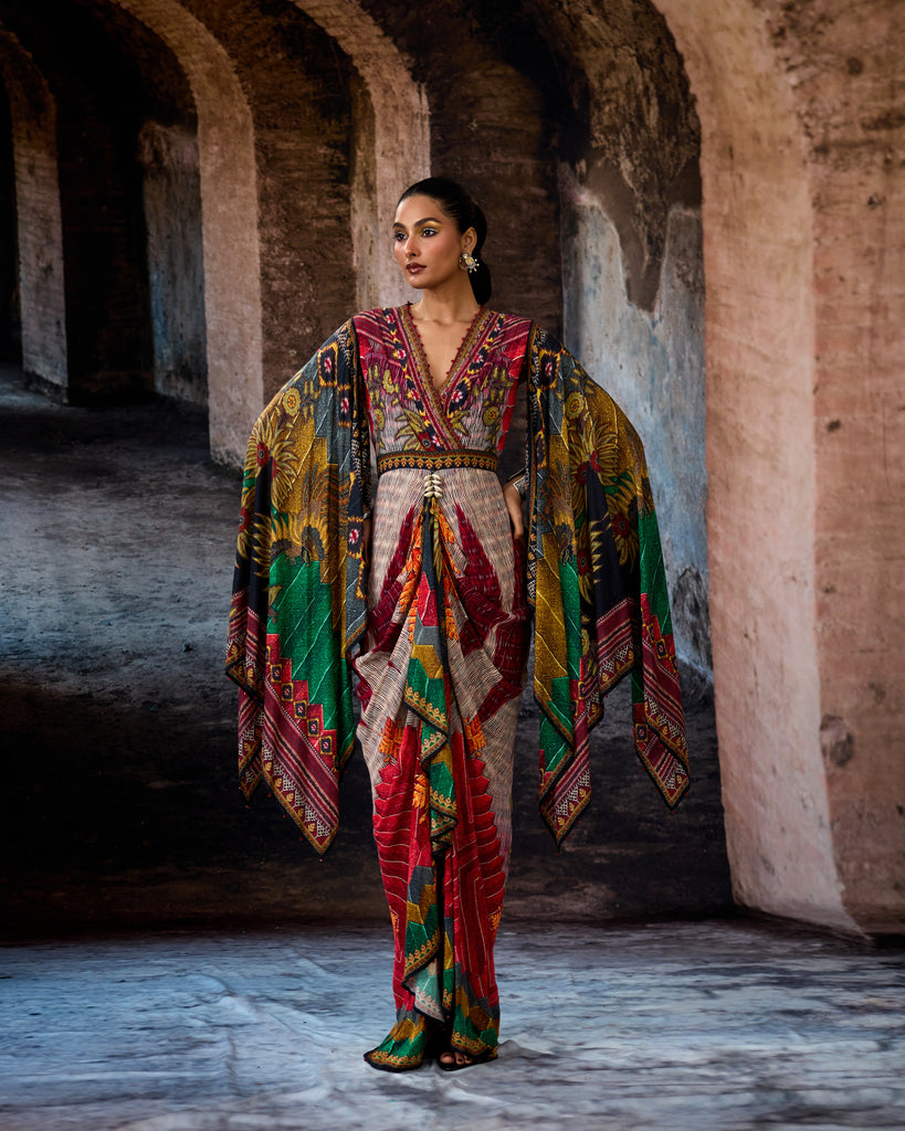 A printed overlap bodice draped dress with silk kimono sleeves. The dress is true to size and is fitted as per measurements. The Dress has a center back zipper fastener.