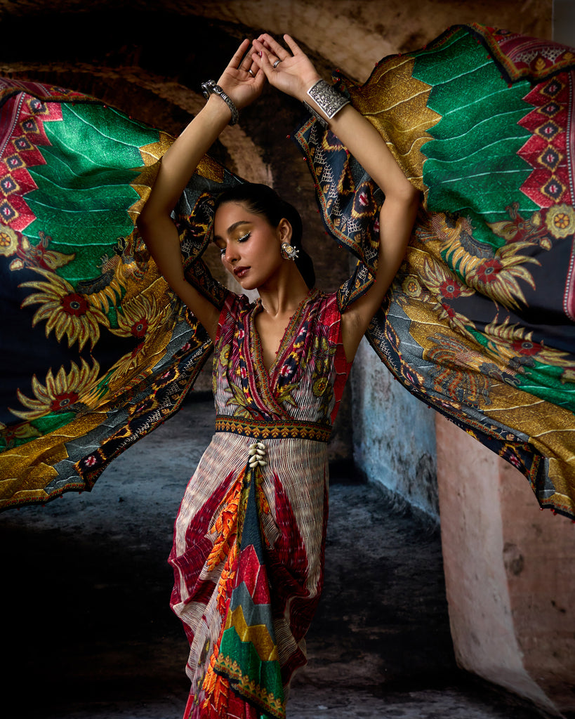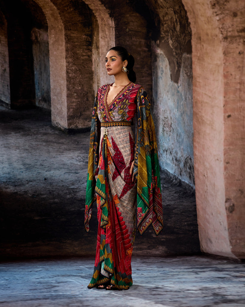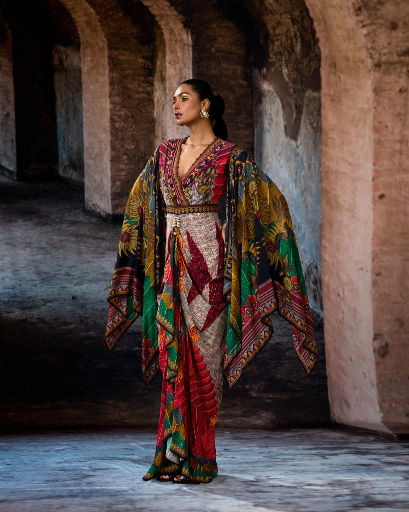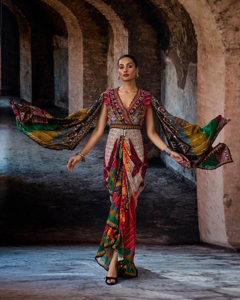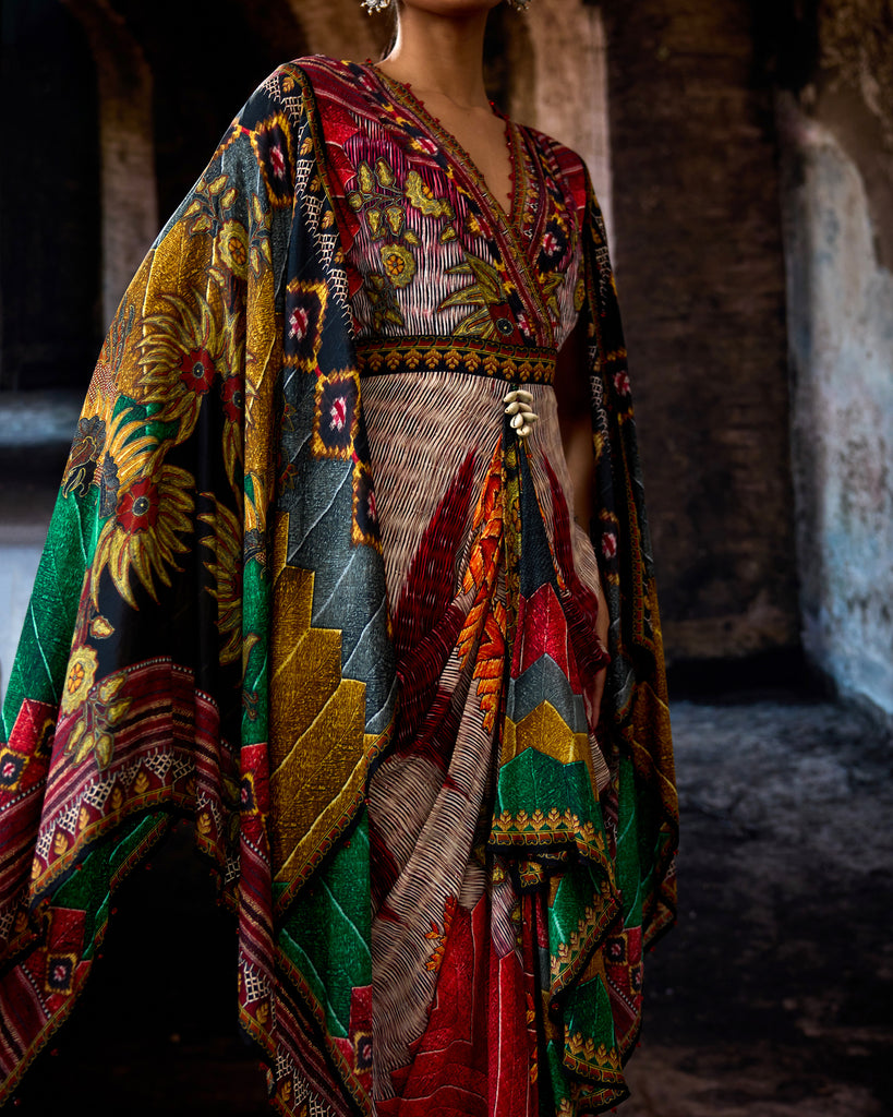A printed overlap bodice draped dress with silk kimono sleeves. The dress is true to size and is fitted as per measurements. The Dress has a center back zipper fastener.