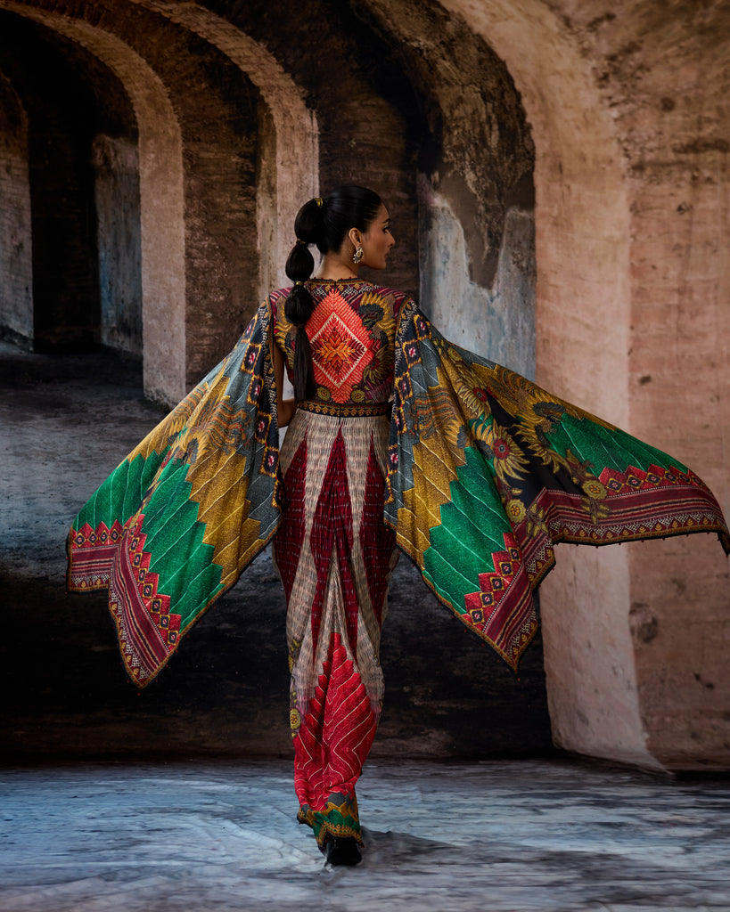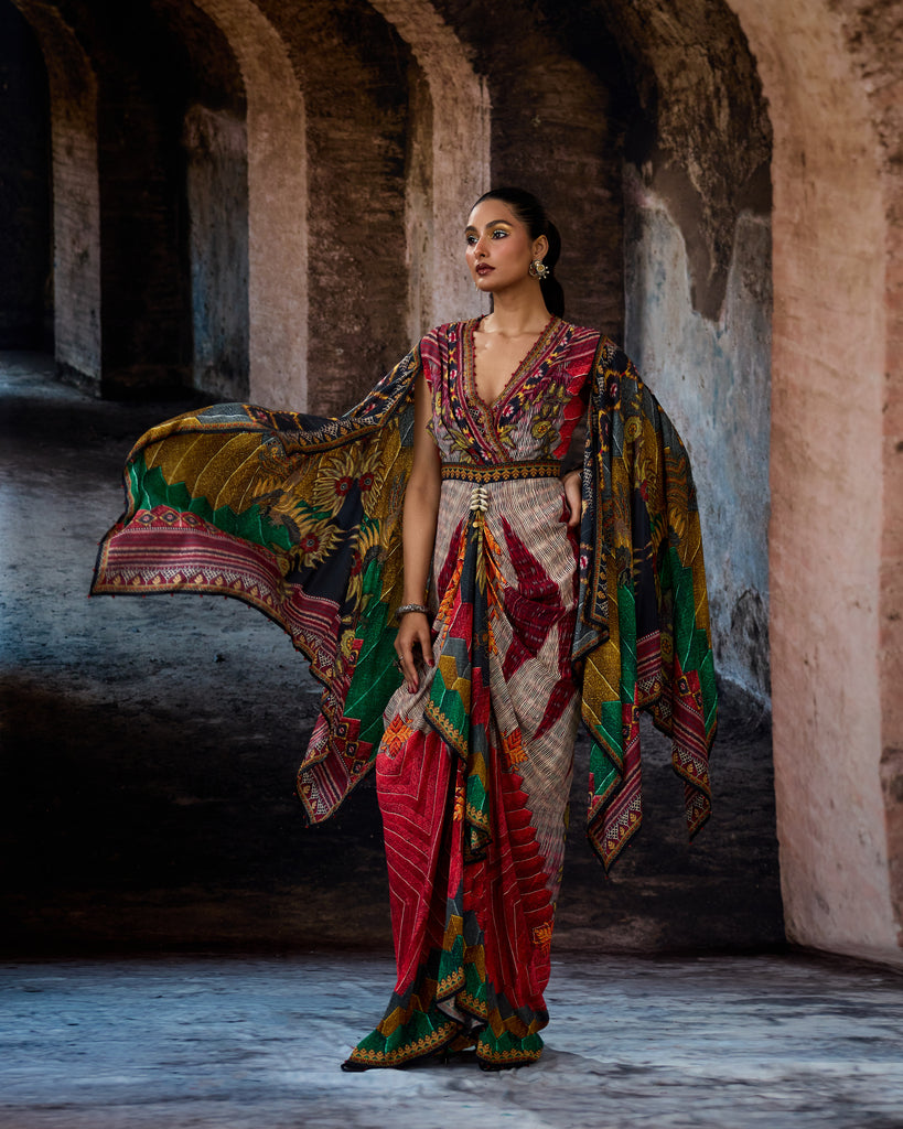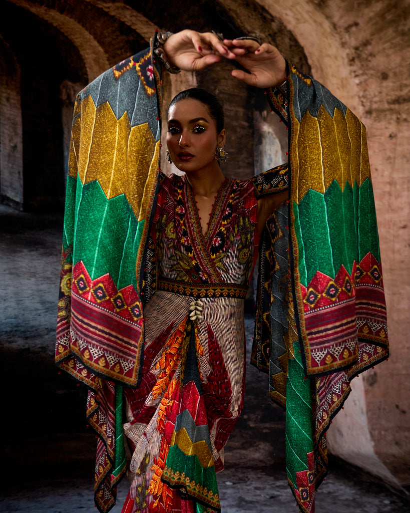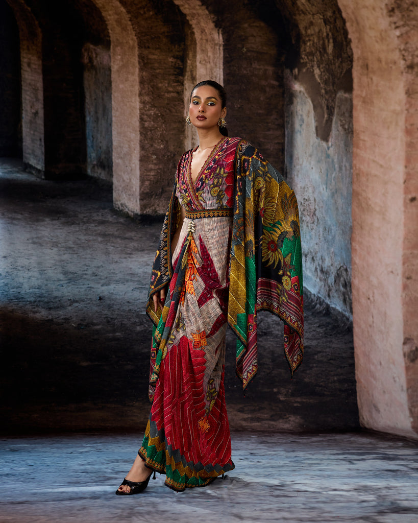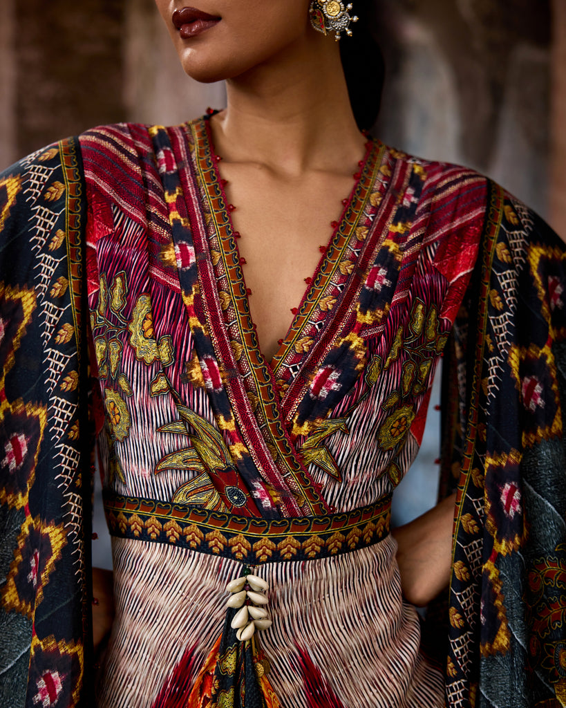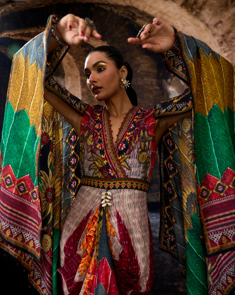 A printed overlap bodice draped dress with silk kimono sleeves. The dress is true to size and is fitted as per measurements. The Dress has a center back zipper fastener.