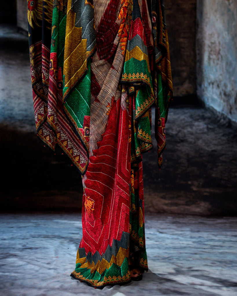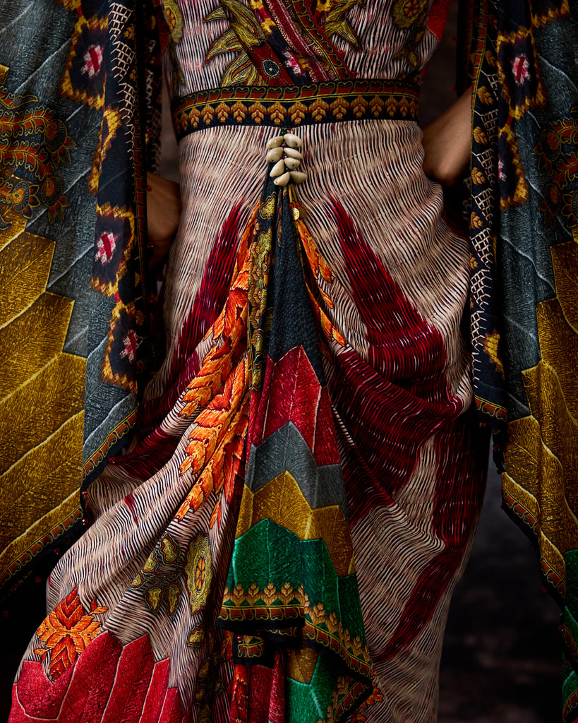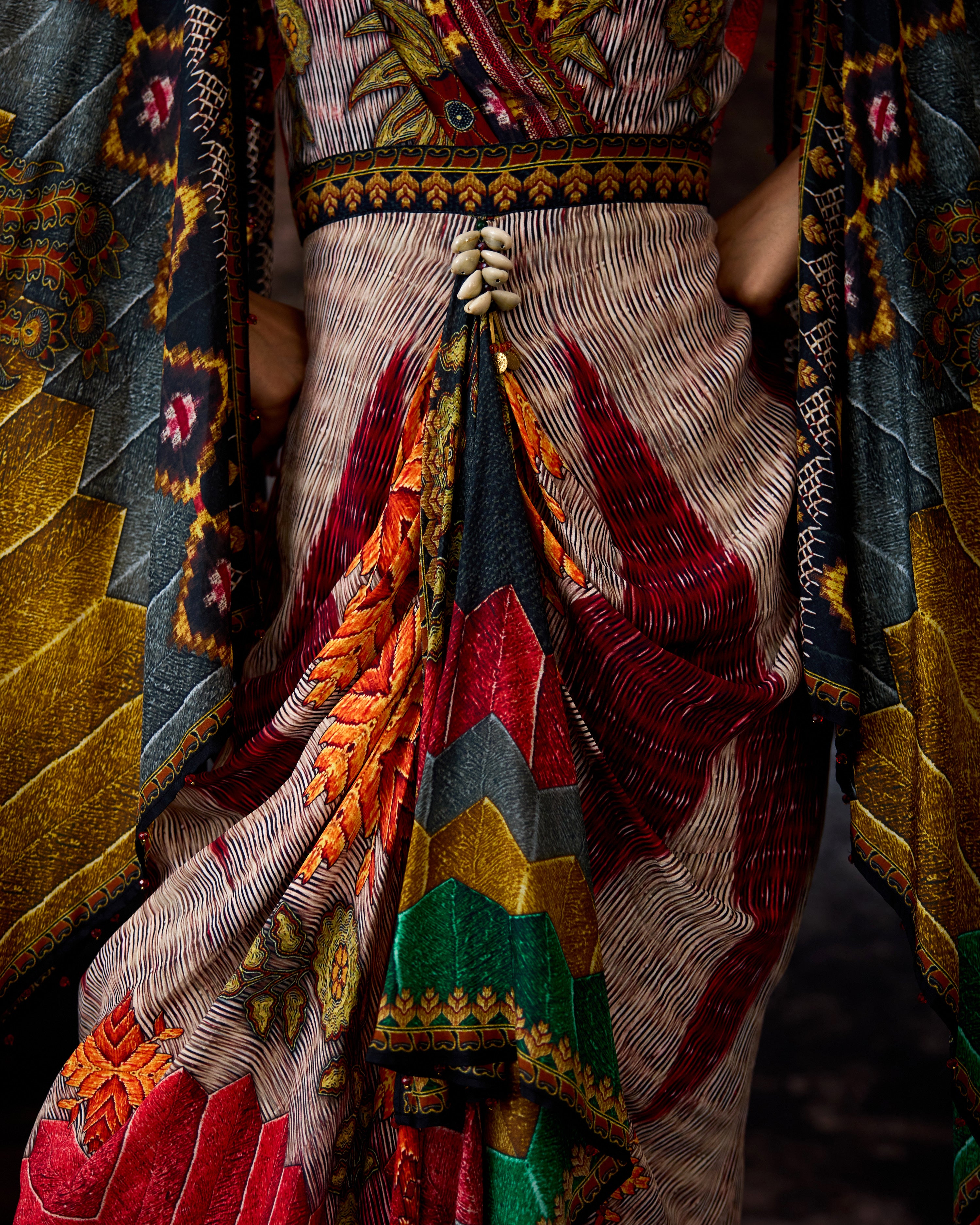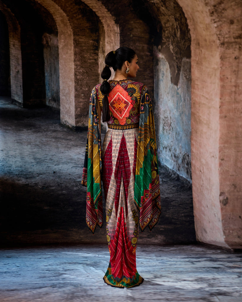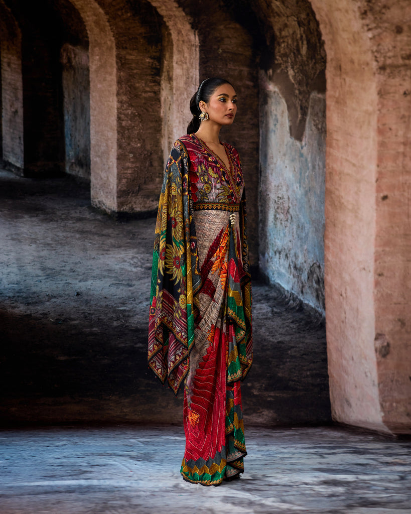 A printed overlap bodice draped dress with silk kimono sleeves. The dress is true to size and is fitted as per measurements. The Dress has a center back zipper fastener.