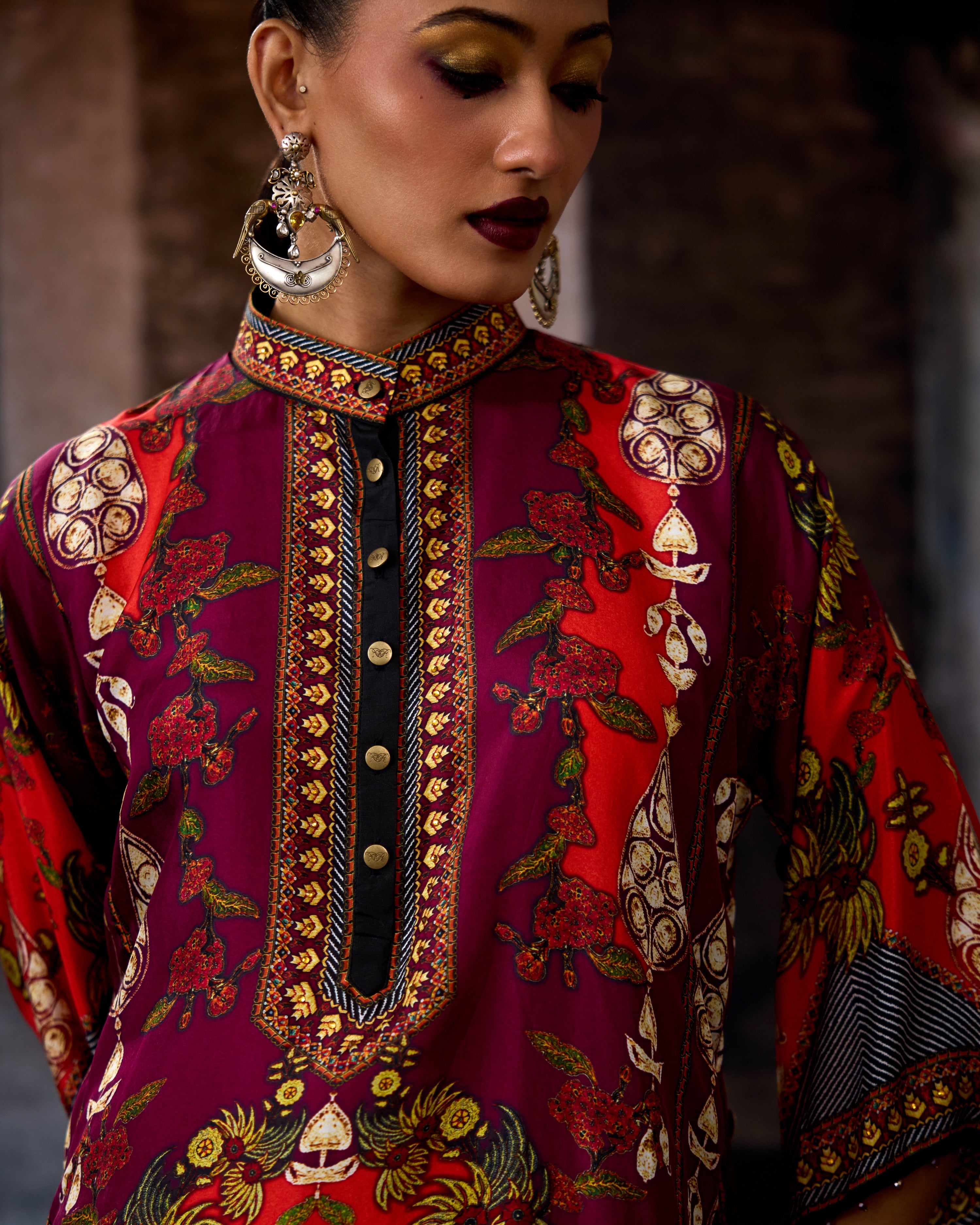 The tunic has a lovely mandarin collar with a front button placket neckline.