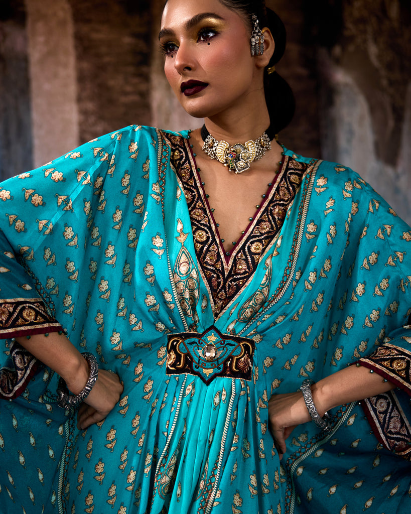 The belt in the kaftan is tied from inside to shape the waist and has a flared loose back.