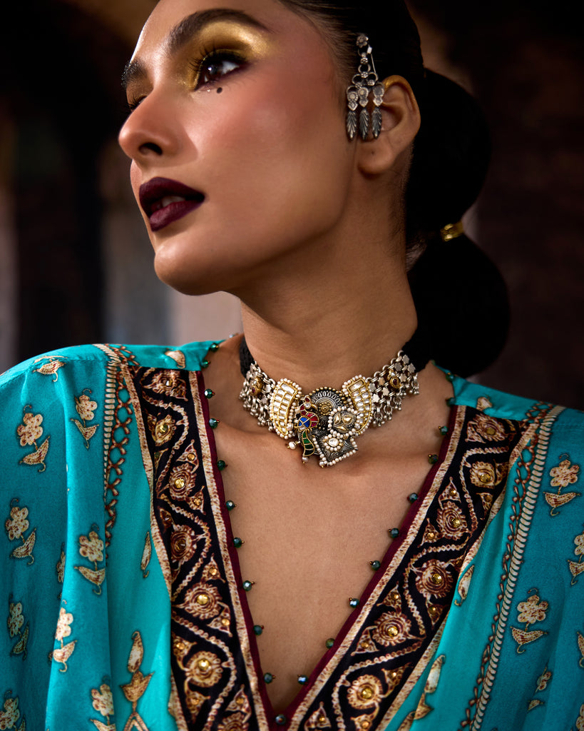 A Printed Silk kaftan dress with a belted empire, embroidered with our insignia broach and Swarovski crystals.