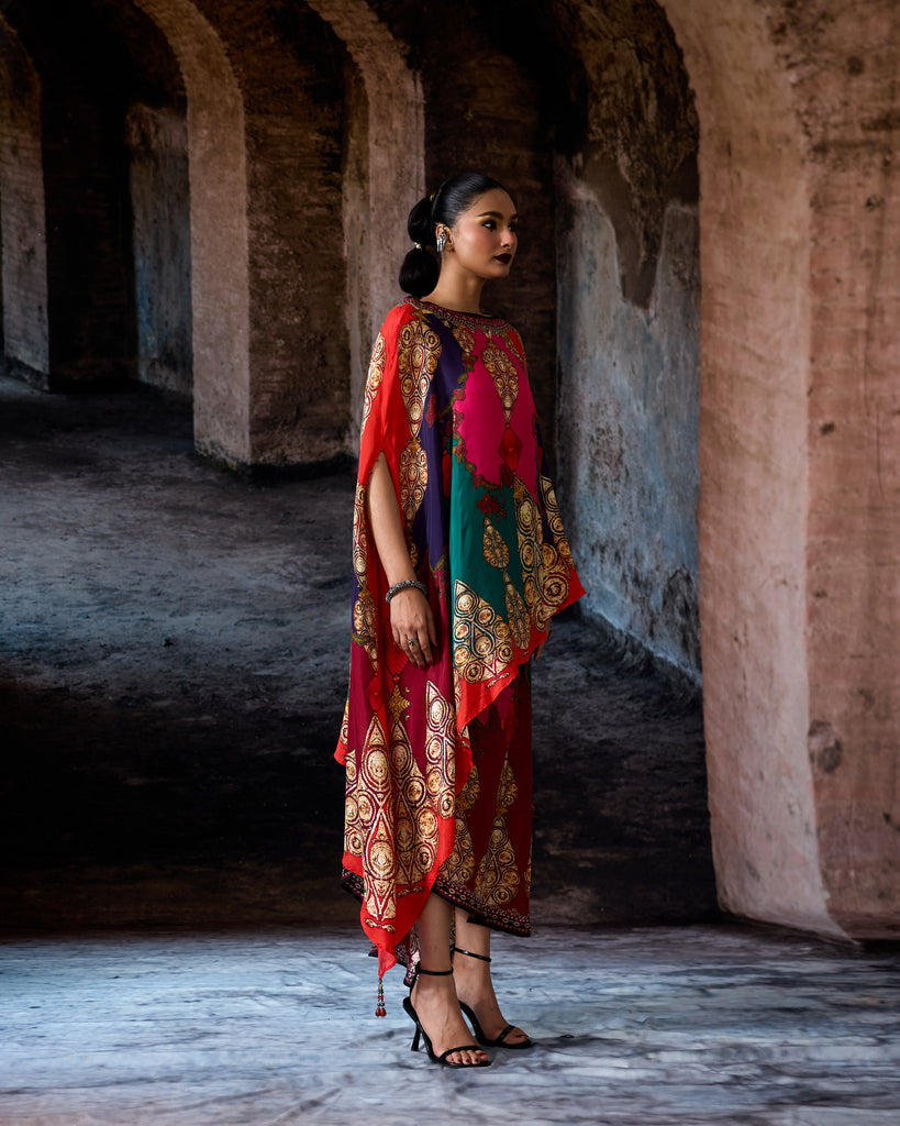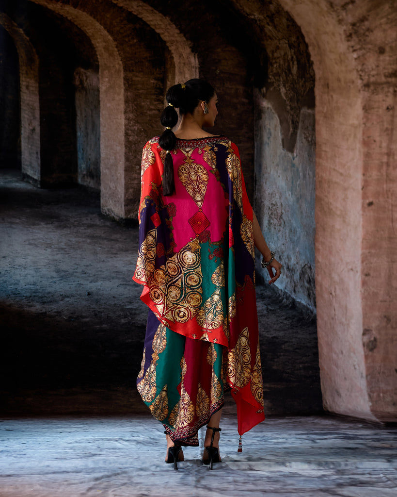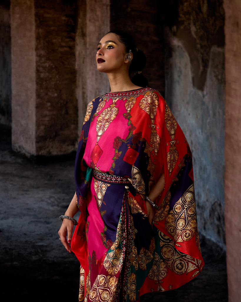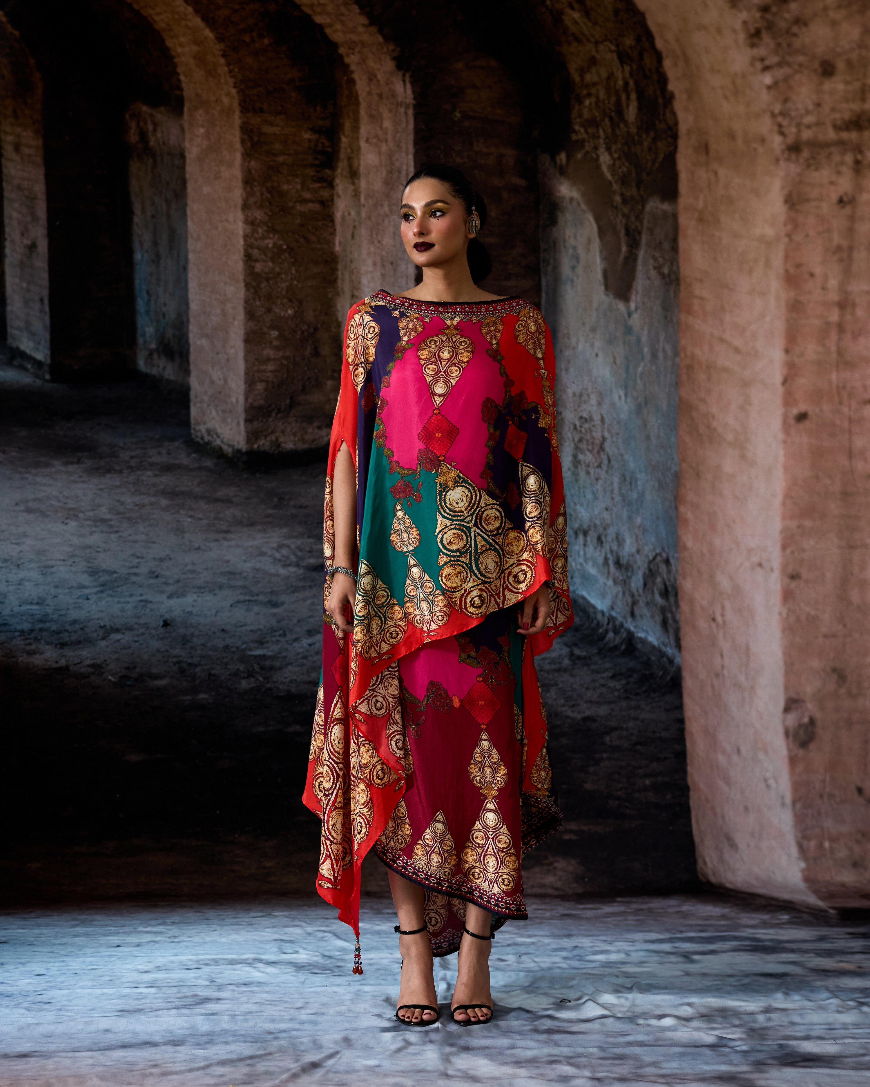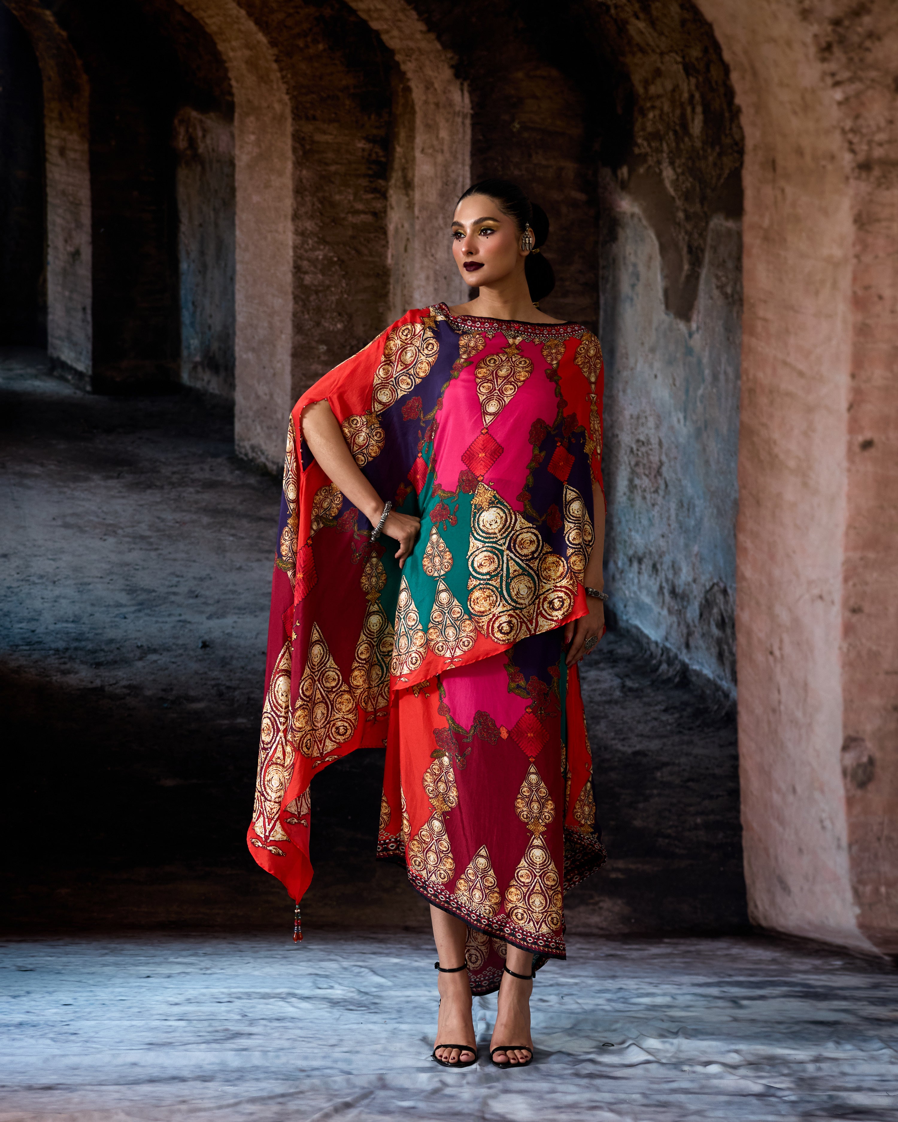 The Kamini set is a draped asymmetric cape with a wide boat neckline and armholes for the hands.
