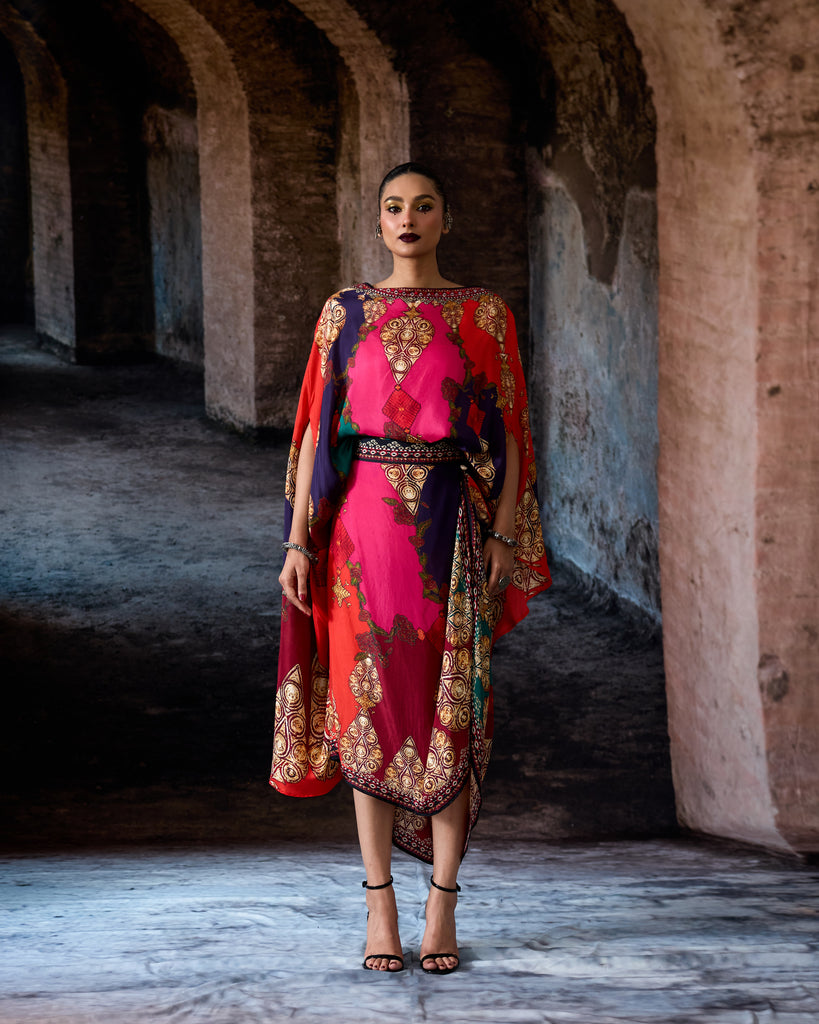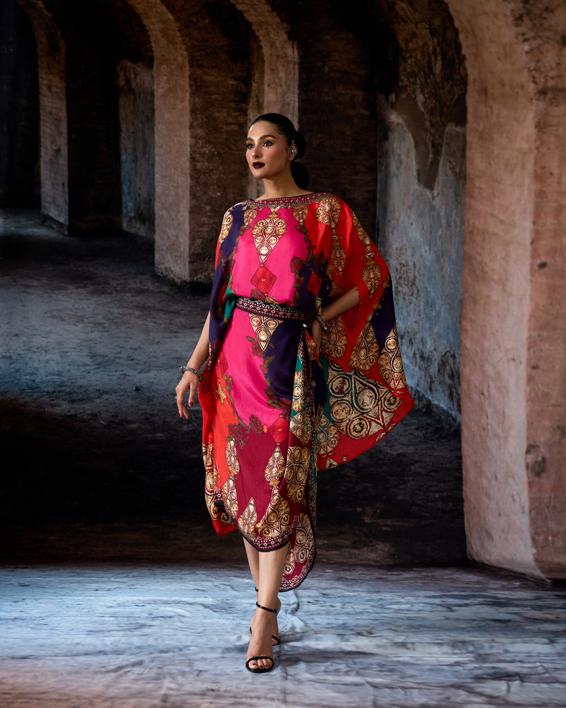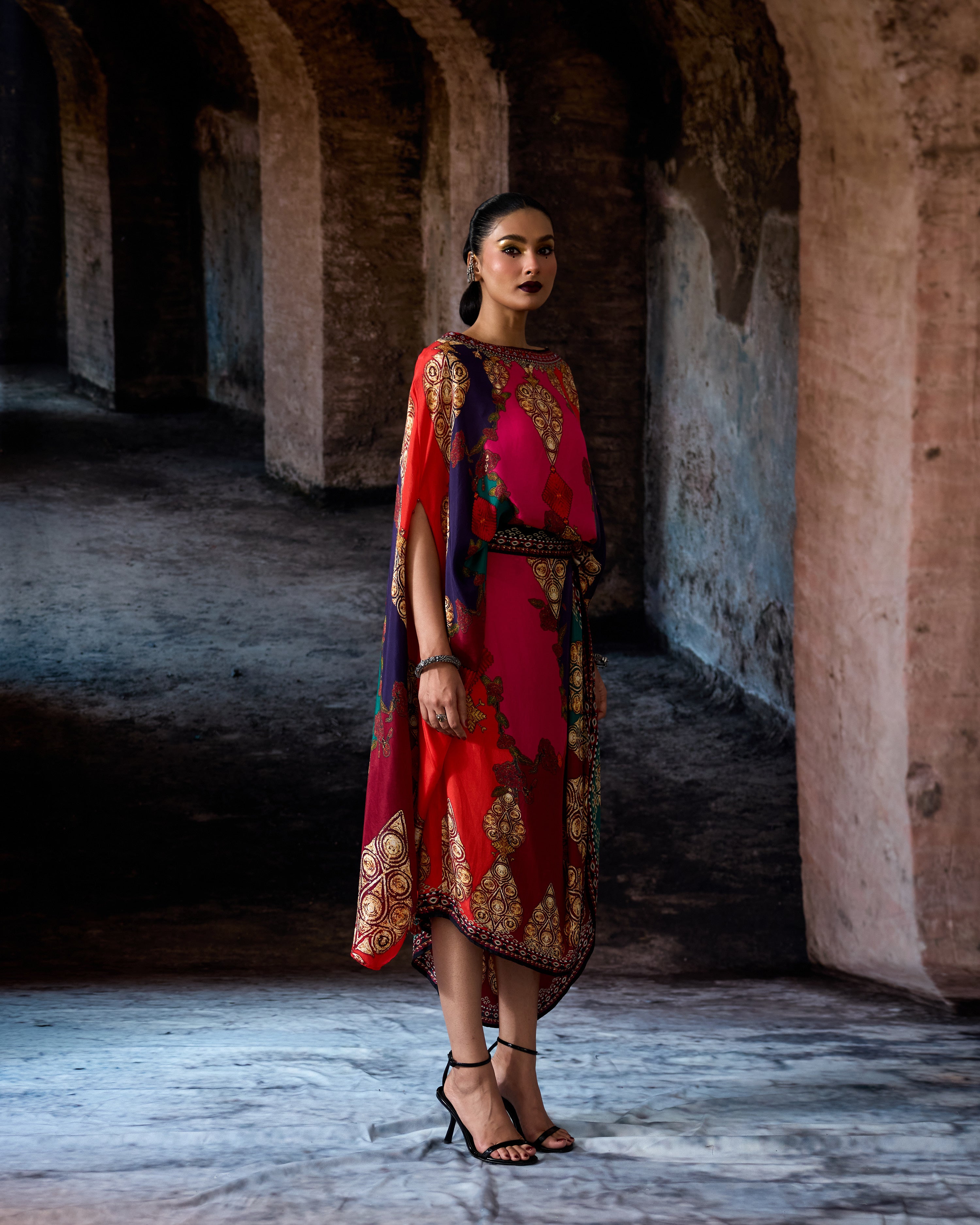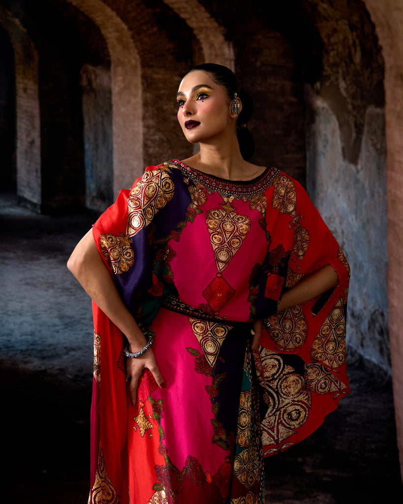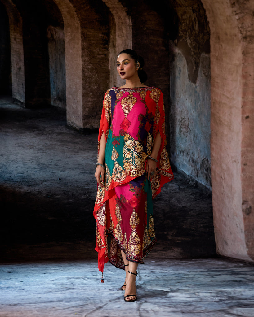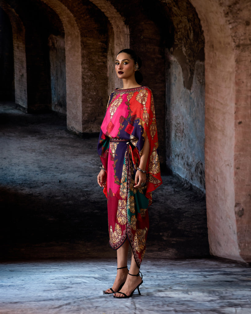 The Kamini set is a draped asymmetric cape with a wide boat neckline and armholes for the hands.