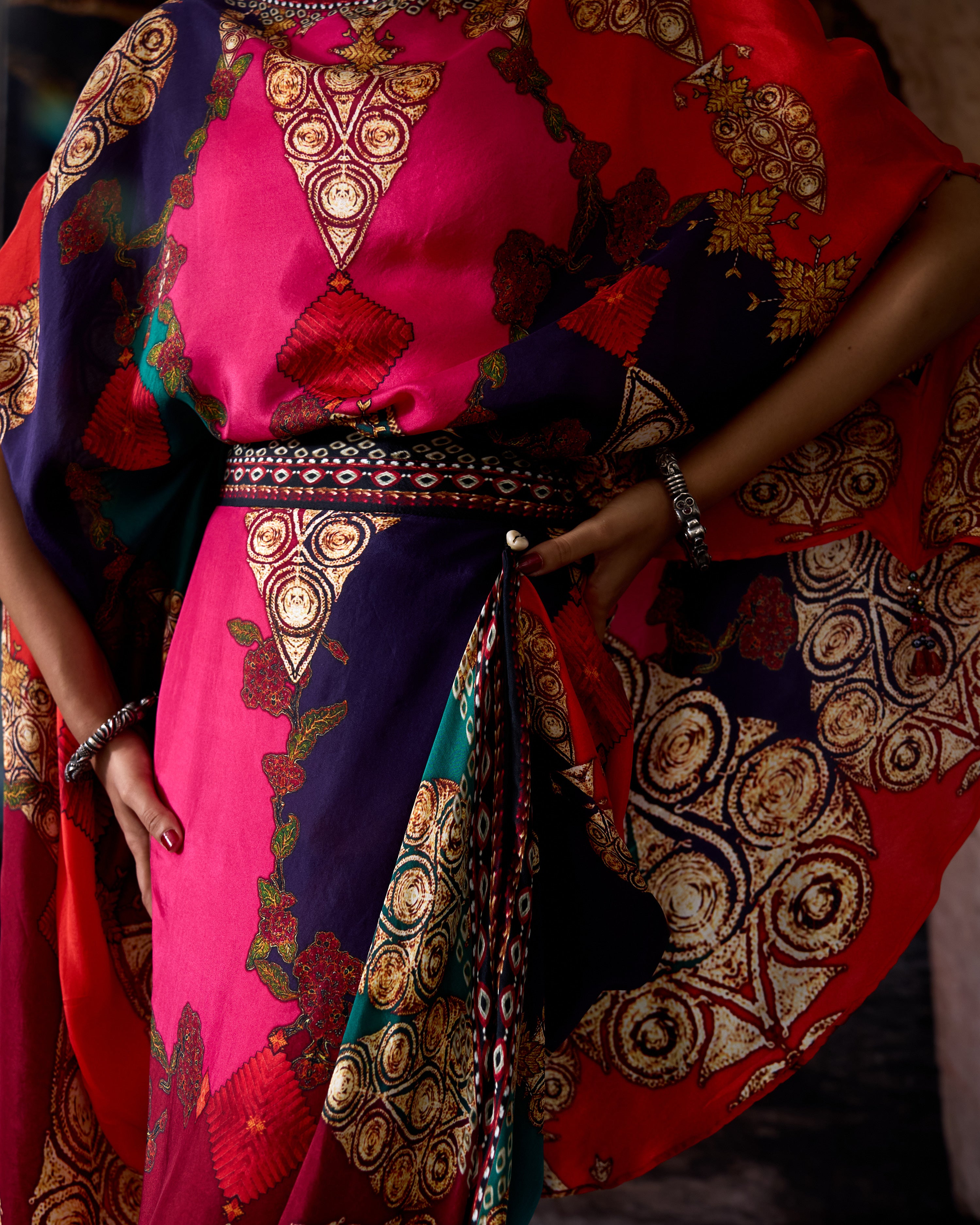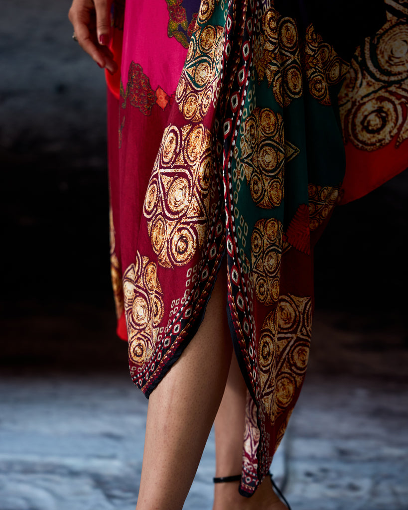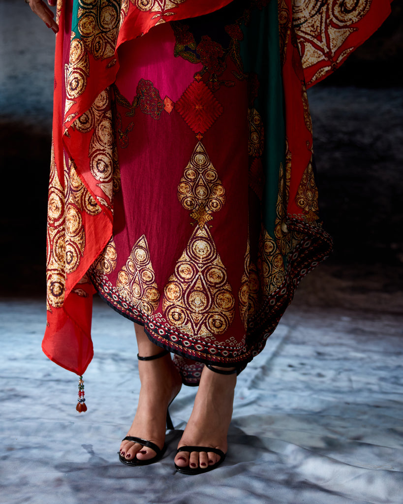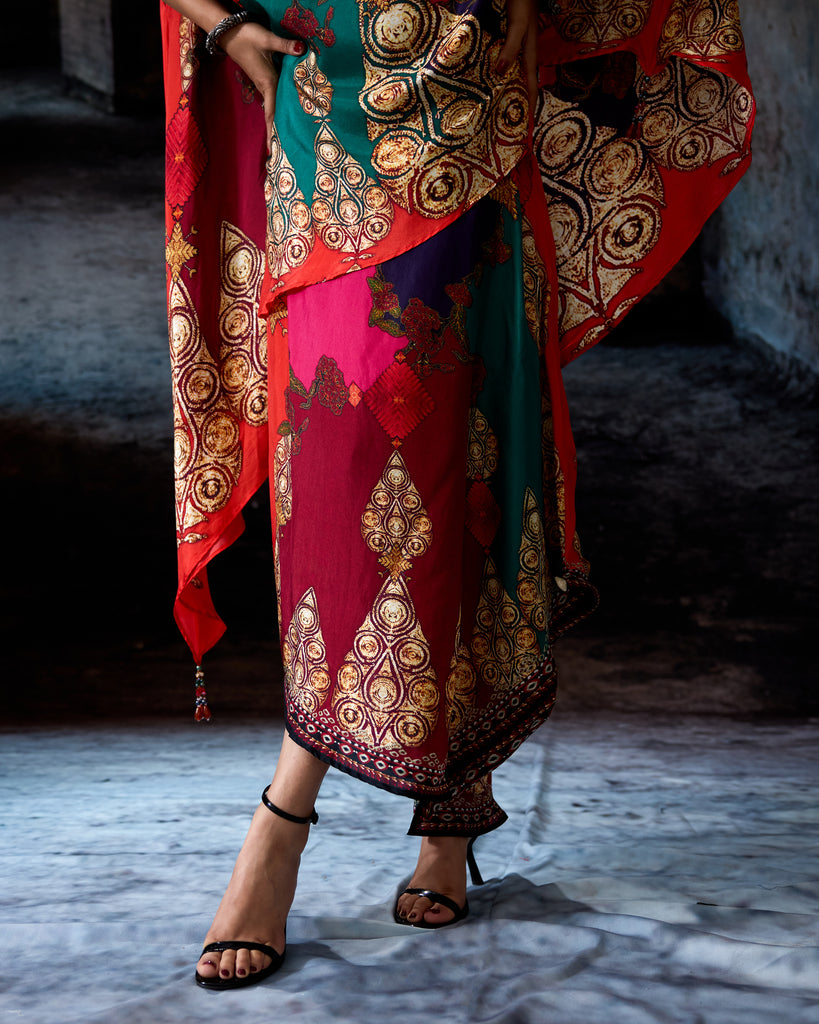 The set comes with an asymmetric draped skirt in the coordinating print that had a belt and back elastic. The skirt also has a loop on the waist band that allows a cowry shell at the bottom right hem of the skirt to be tucked into it to create a shorter drape for the same.
