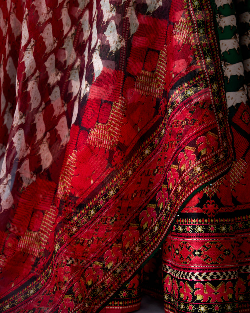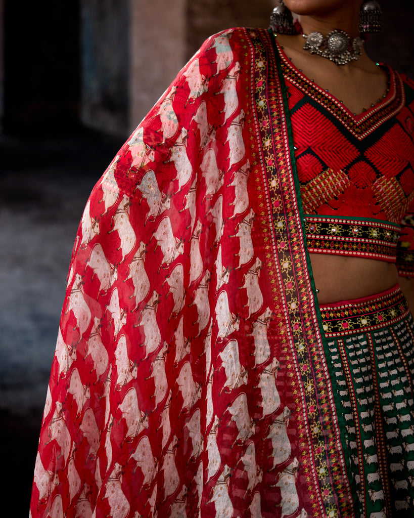 The dupatta is in a wispy and a soft silk kota printed in the coordinating print of the skirt set.