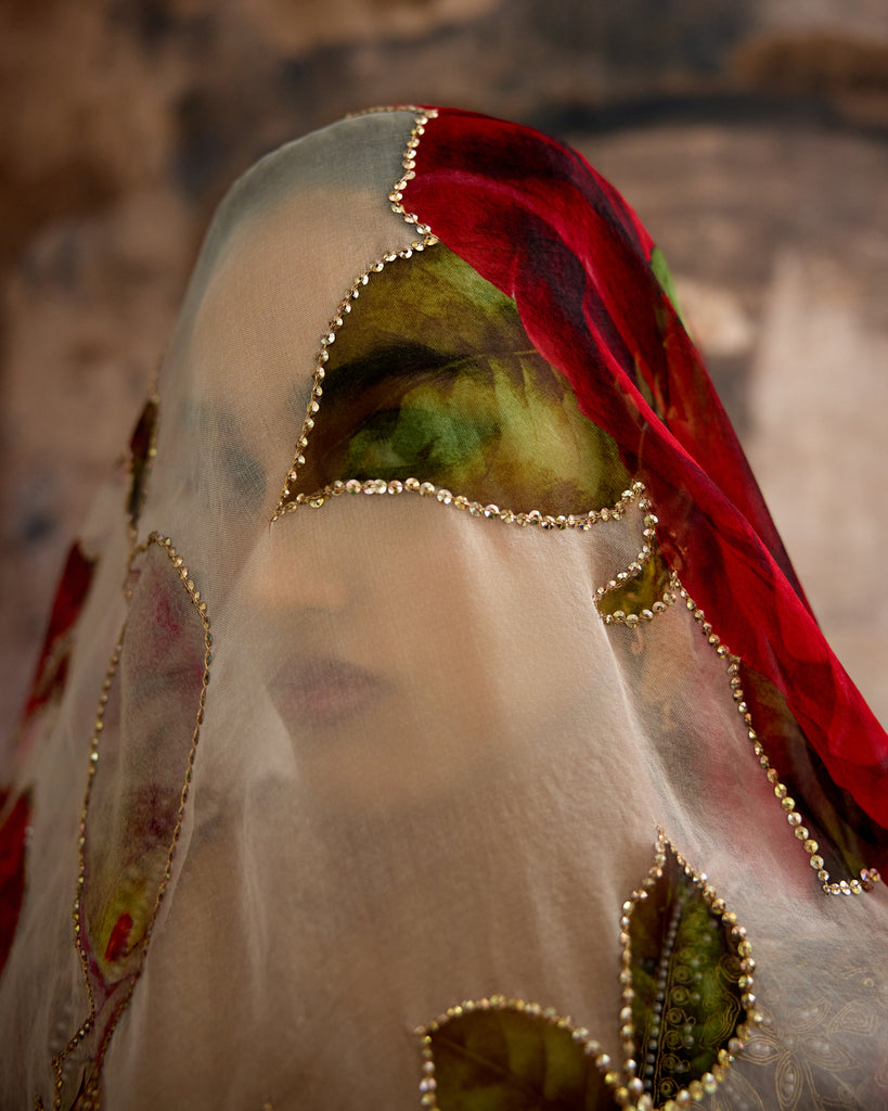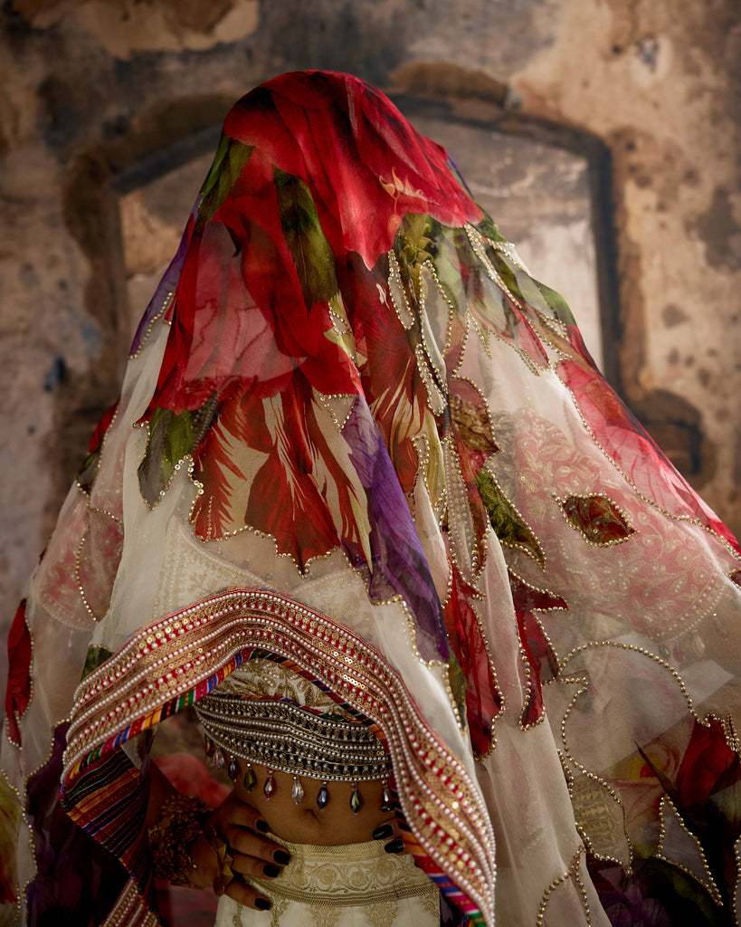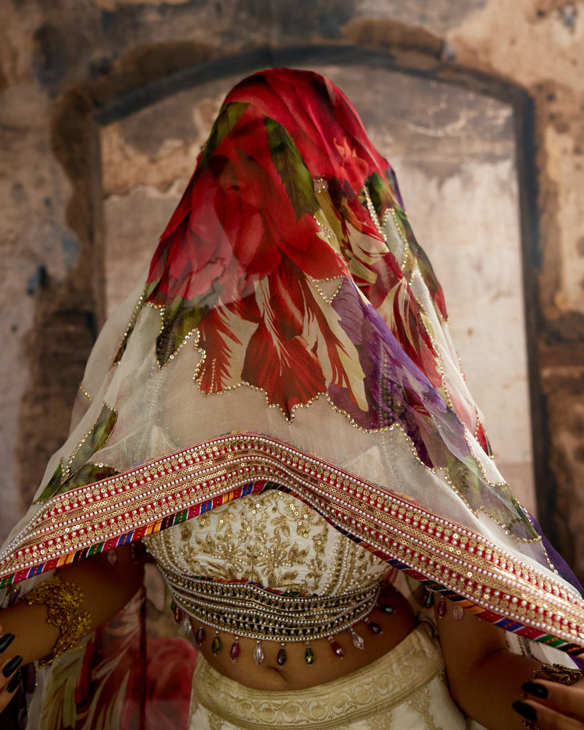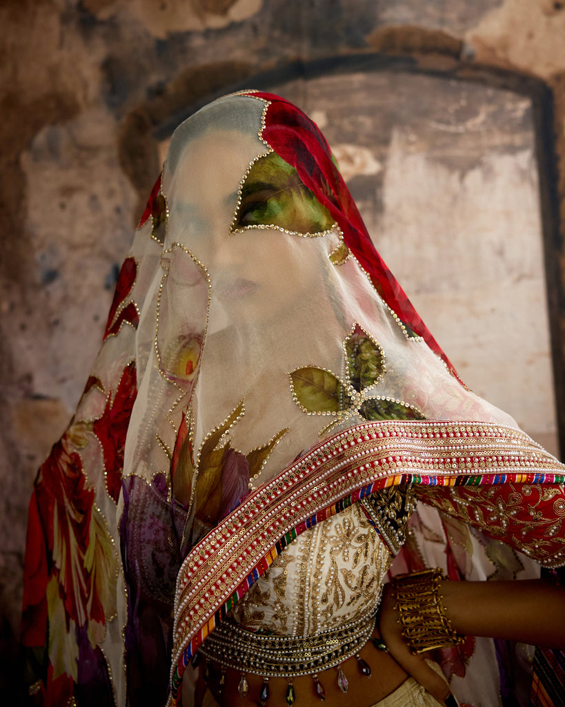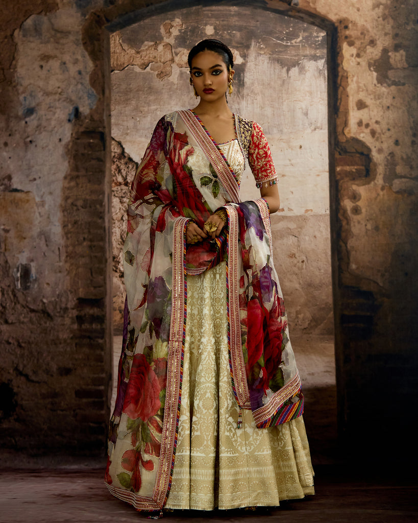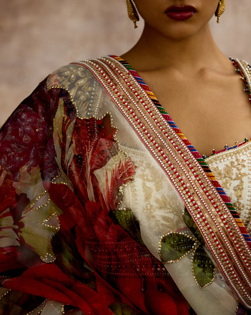 The Set comes with an intricate embroidered silk blouse and a printed and embroidered silk Organza dupatta with embroidered borders around.