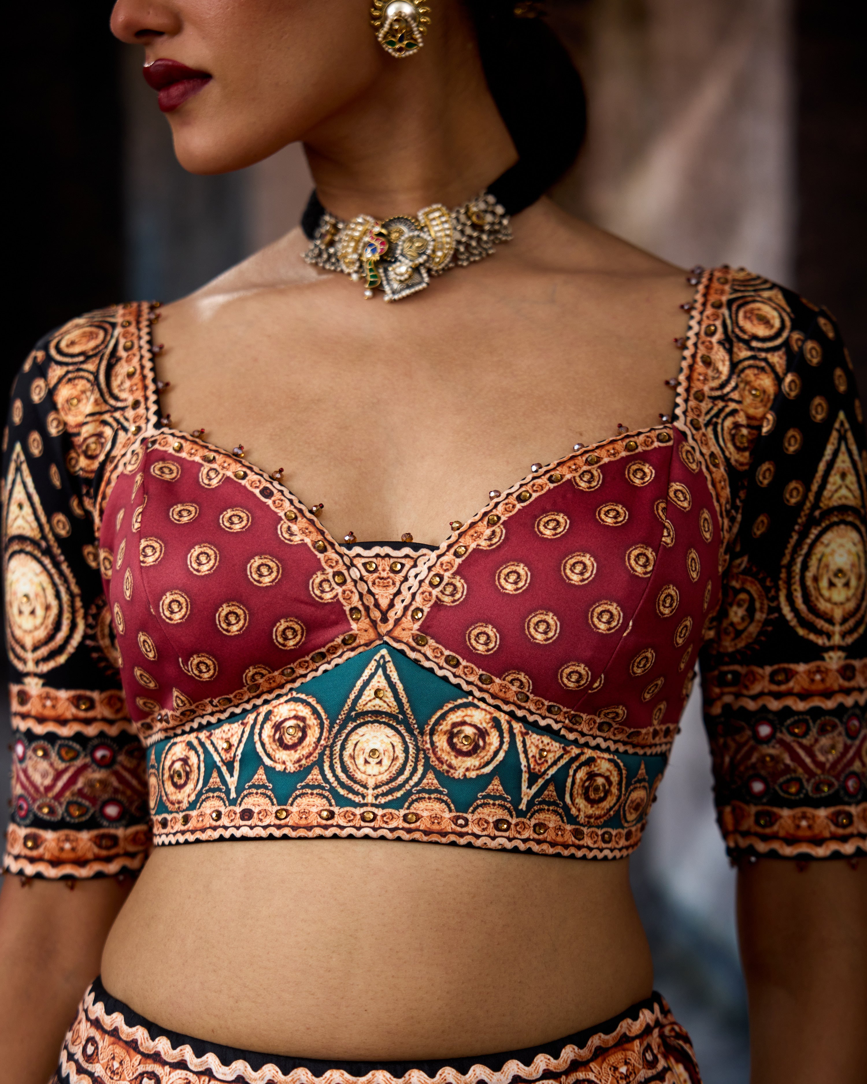 The blouse shape is as per the images. The blouse is printed and highlighted with Swarovski crystals apart from edgings of crystal beads.