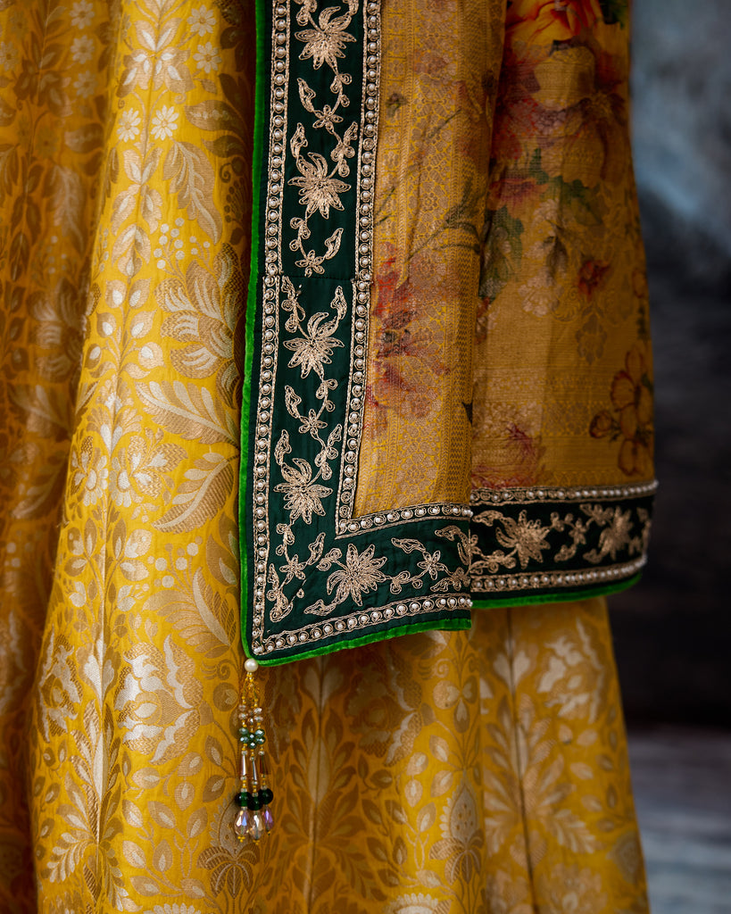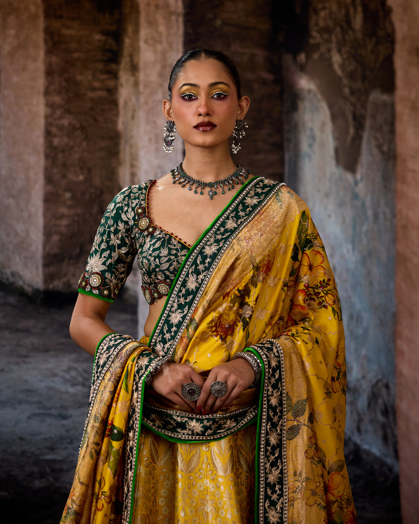 A Banarasi handwoven Silk Brocade lehenga set.