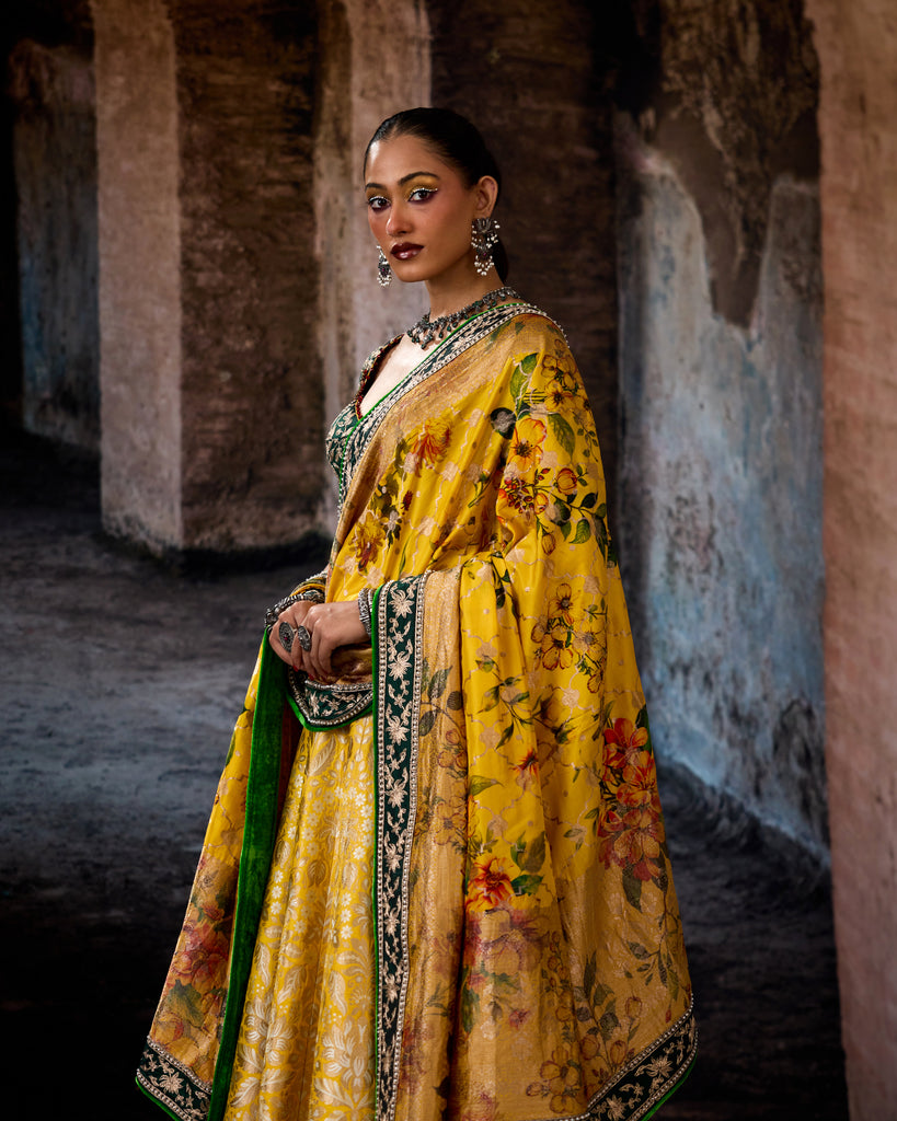 The Set comes with an intricate embroidered silk blouse and a printed silk brocade dupatta with embroidered borders around.