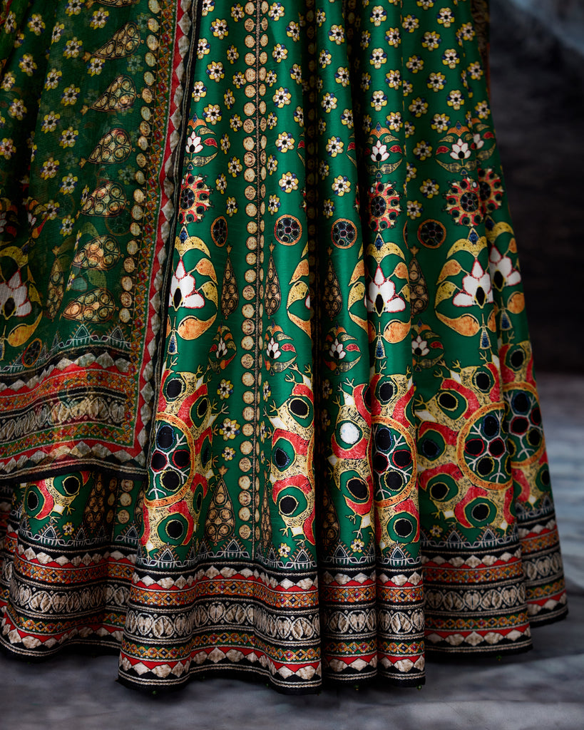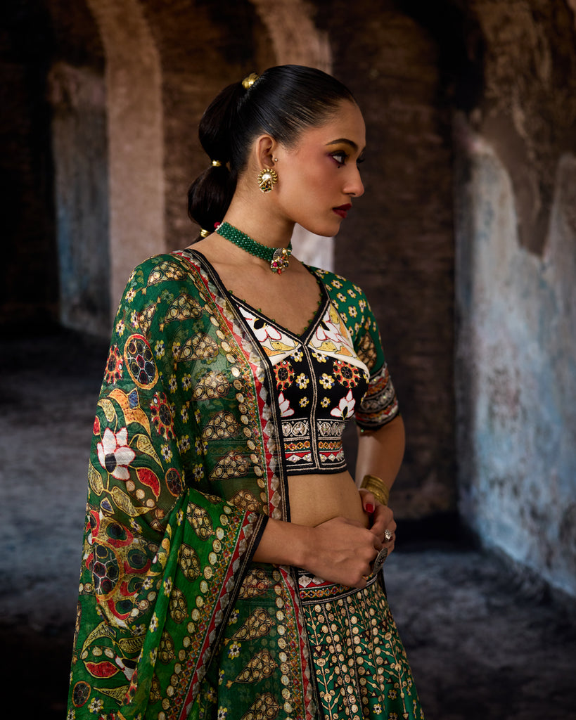 The dupatta is in a wispy and a soft silk kota printed in the coordinating print of the skirt set.