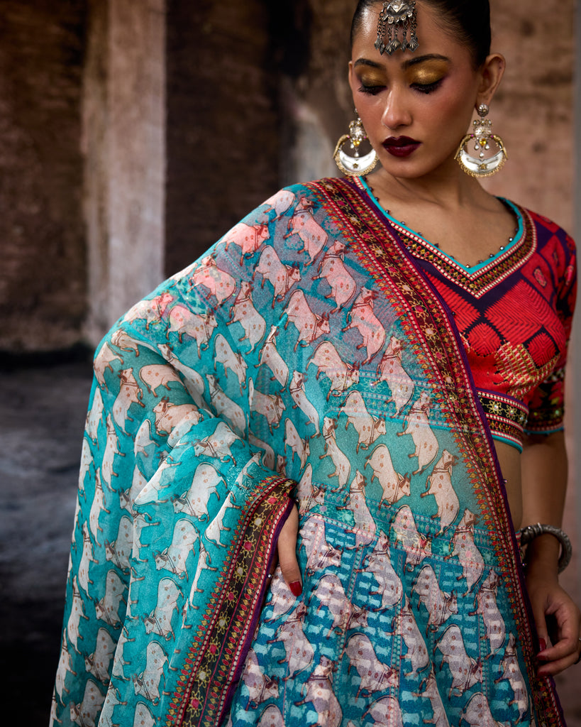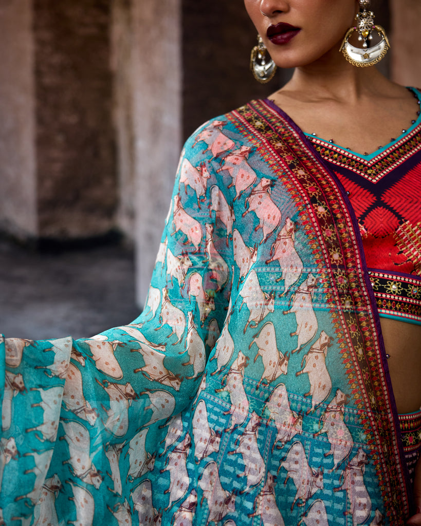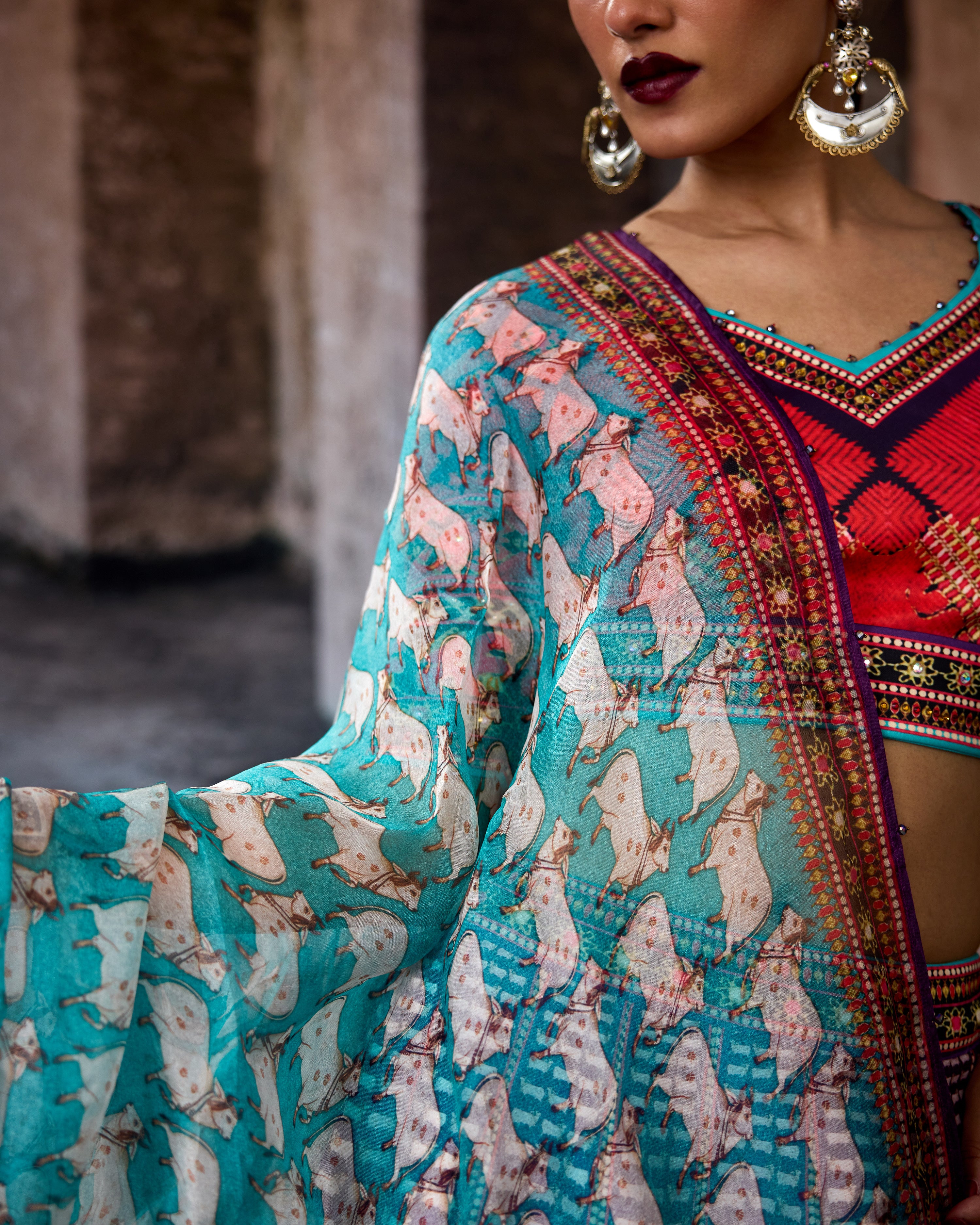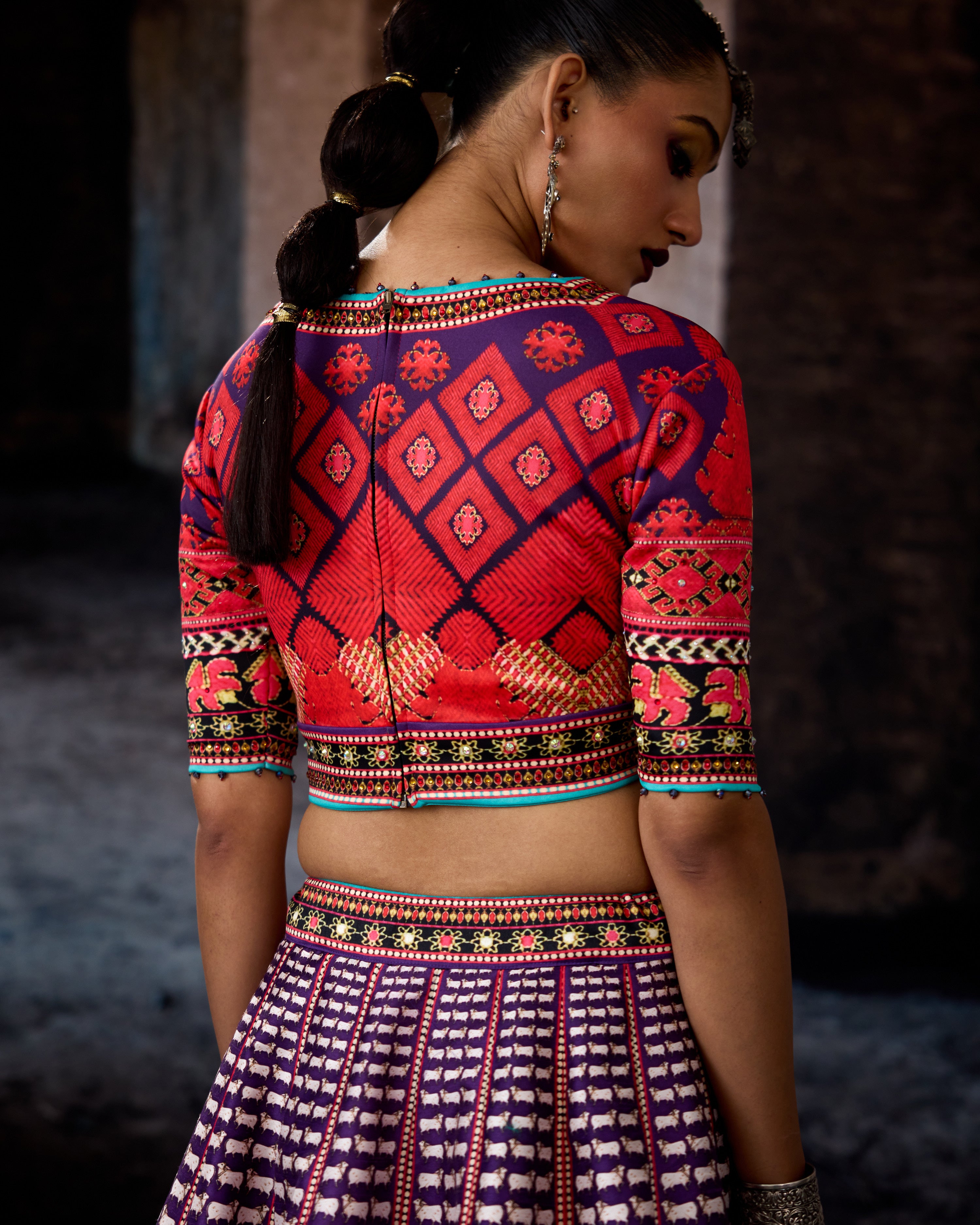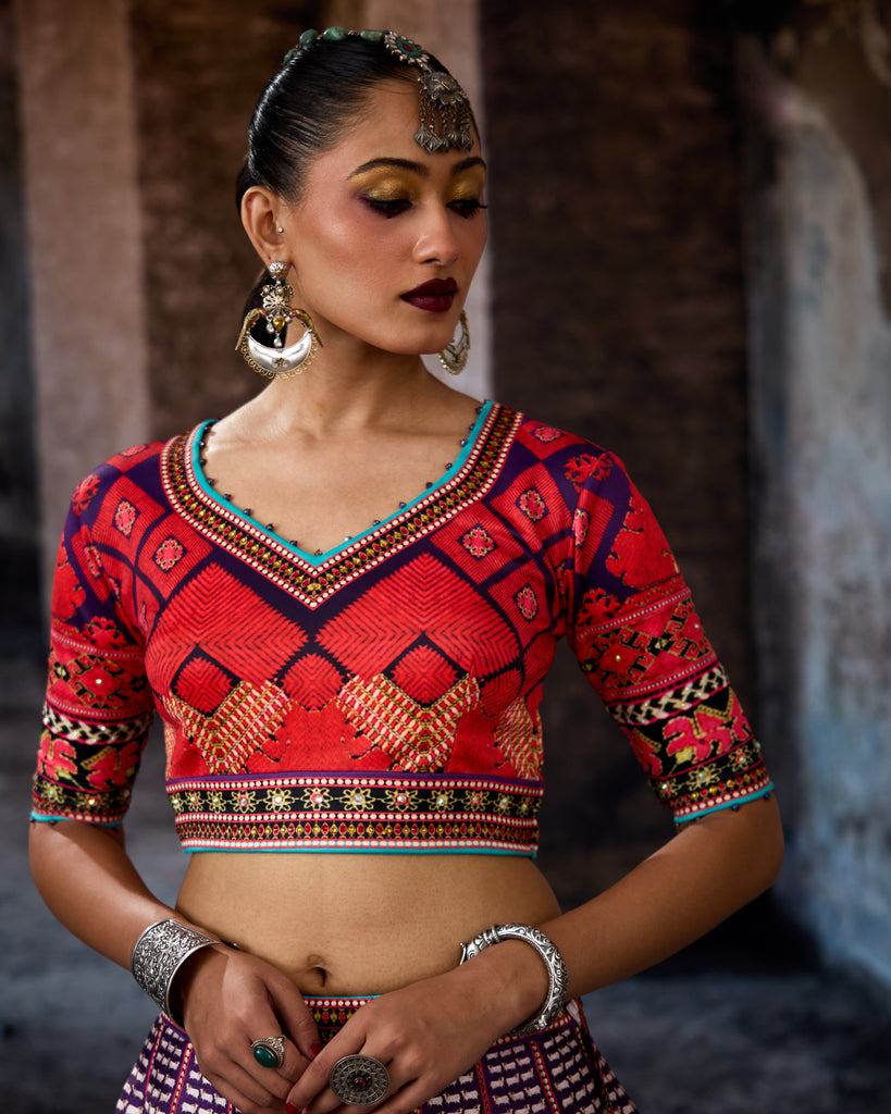 The blouse shape is as per the images. The blouse is printed and highlighted with Swarovski crystals apart from edgings of crystal beads.
