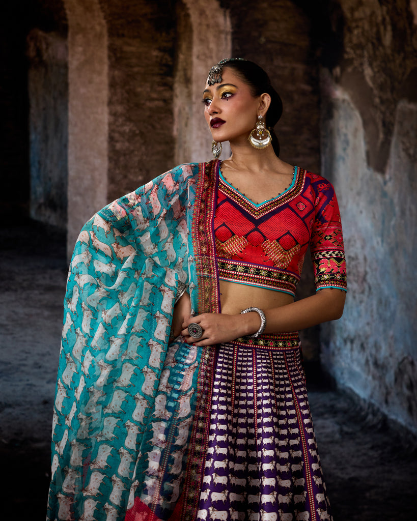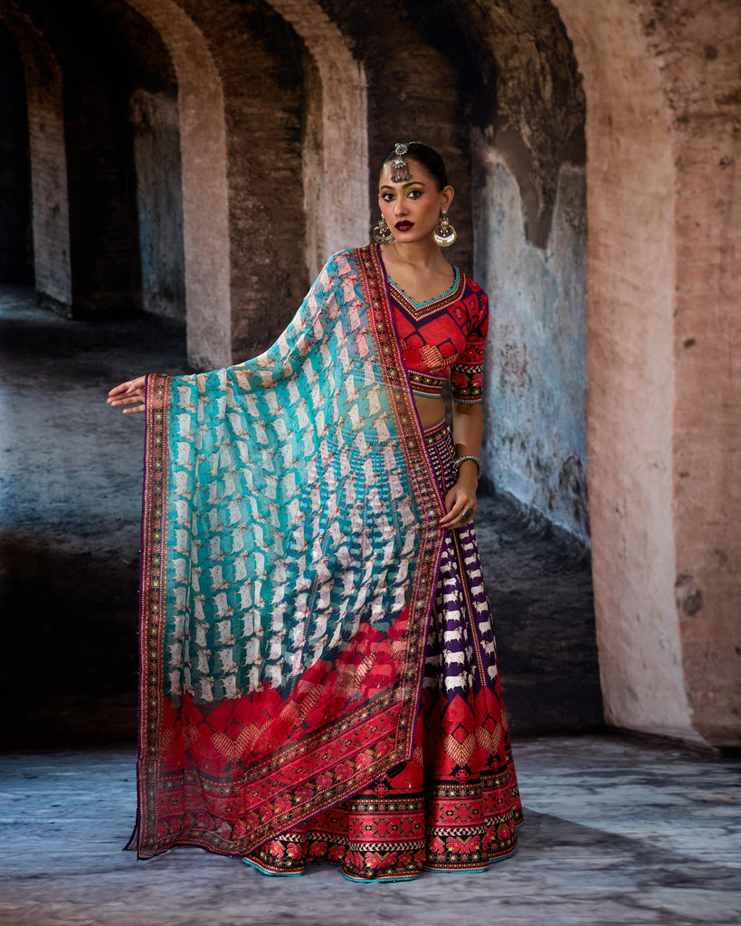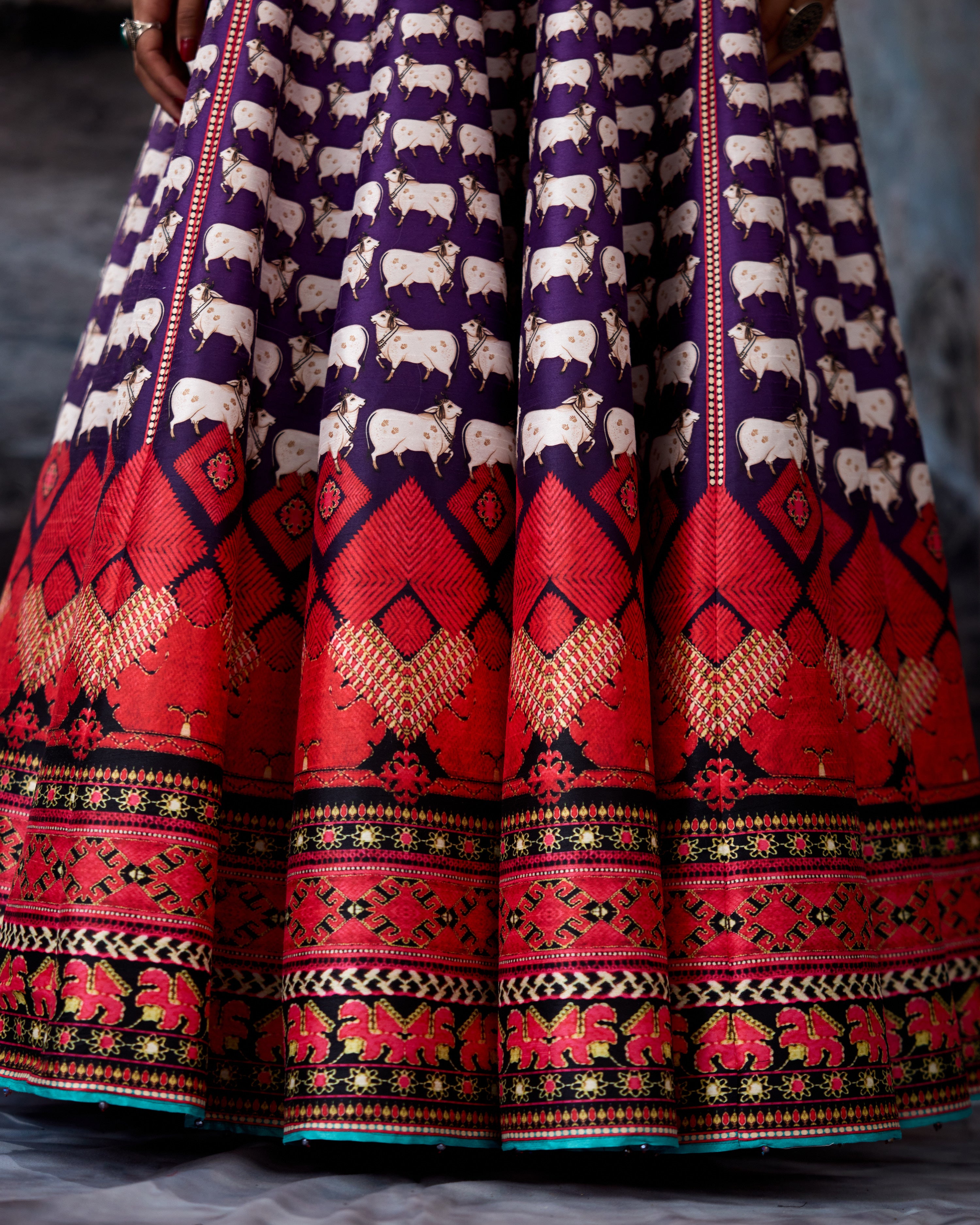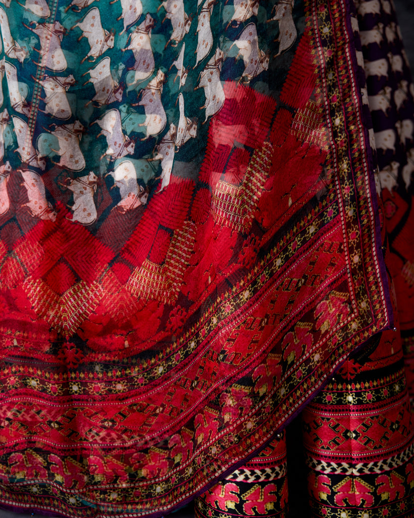 The dupatta is in a wispy and a soft silk kota printed in the coordinating print of the skirt set.