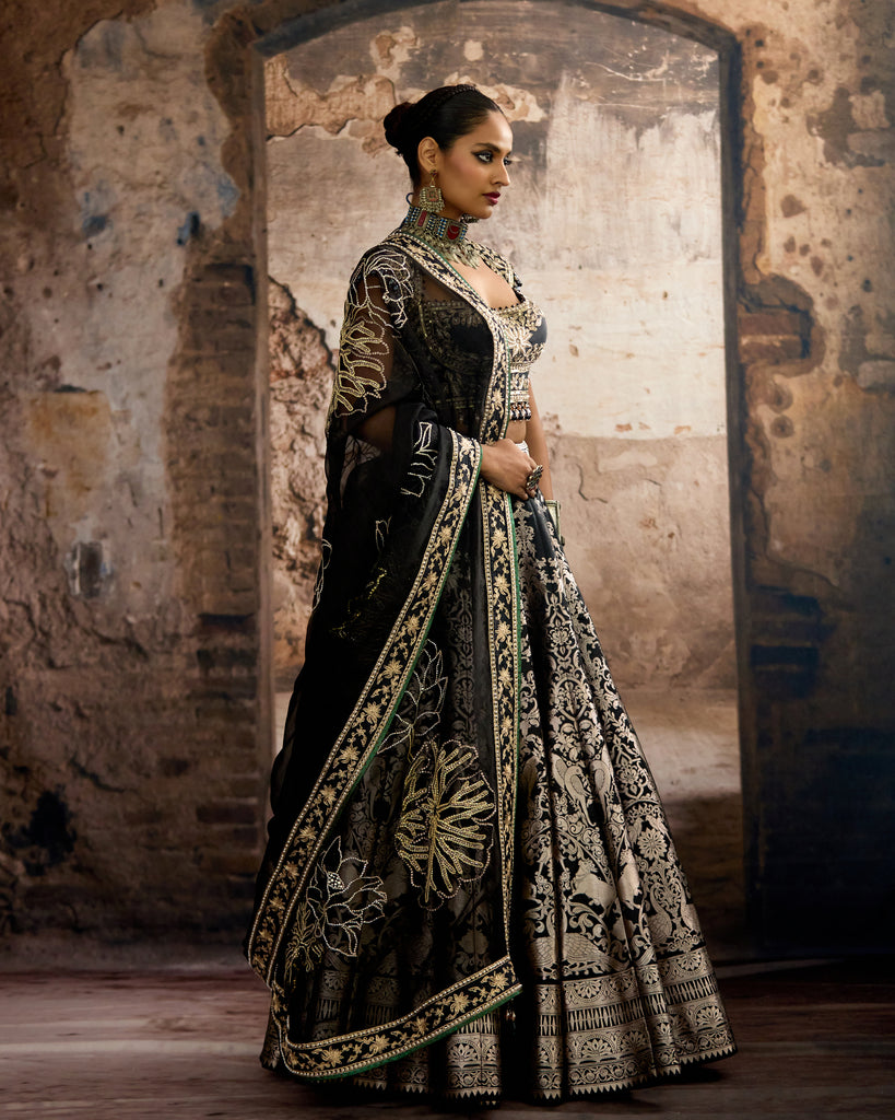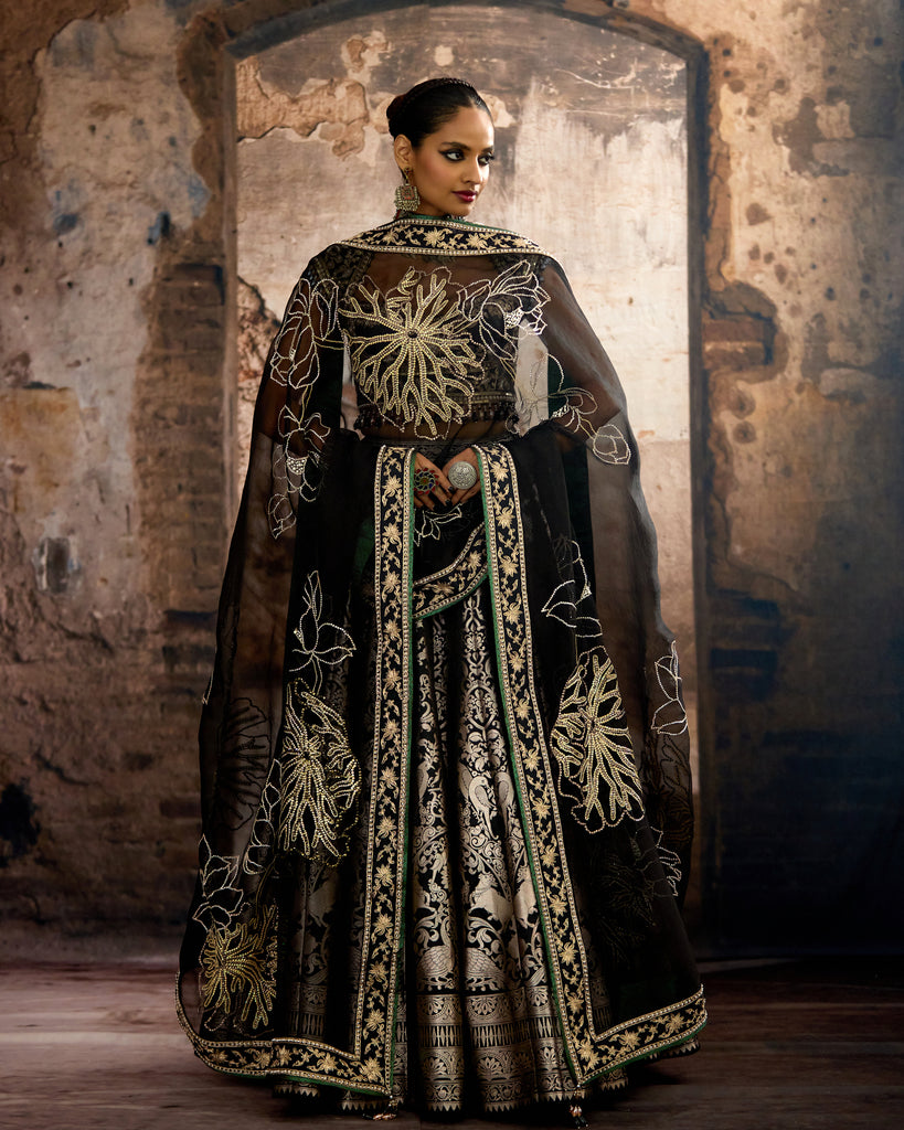 The Set comes with an intricate embroidered silk blouse and an embroidered silk Organza dupatta with embroidered borders around.