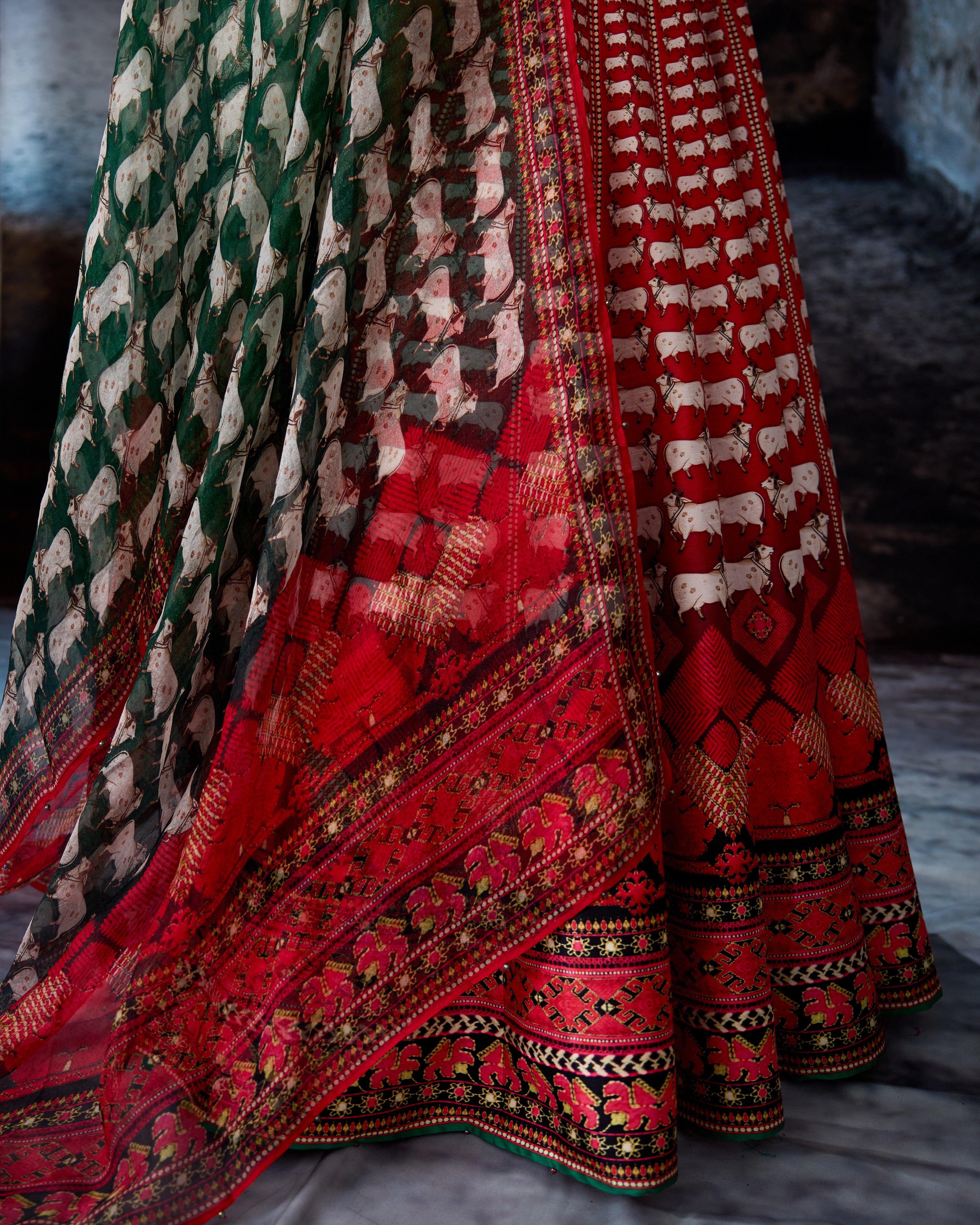 The dupatta is in a wispy and a soft silk kota printed in the coordinating print of the skirt set.
