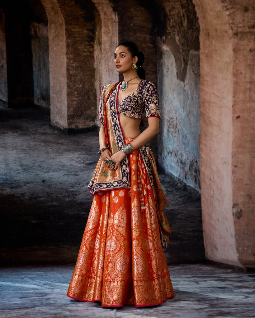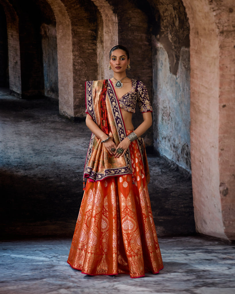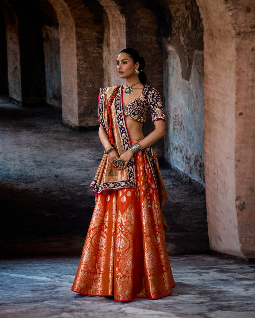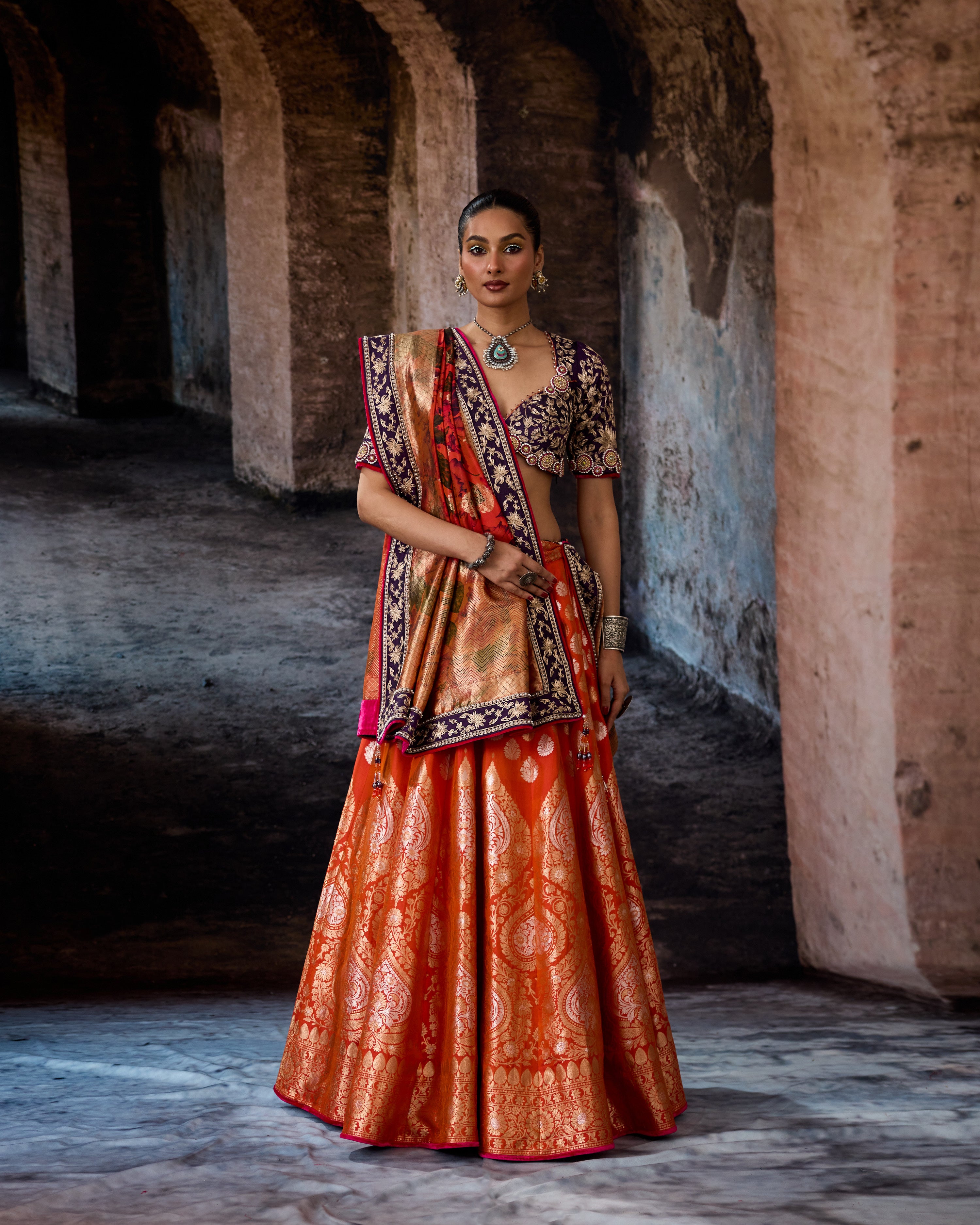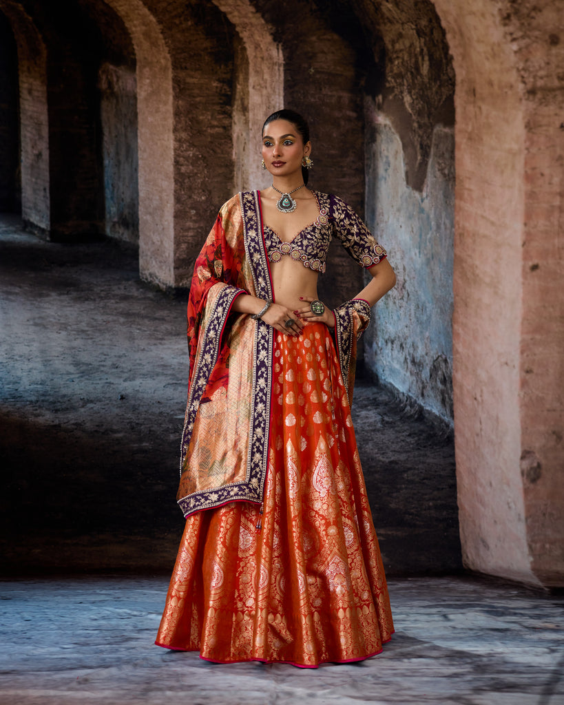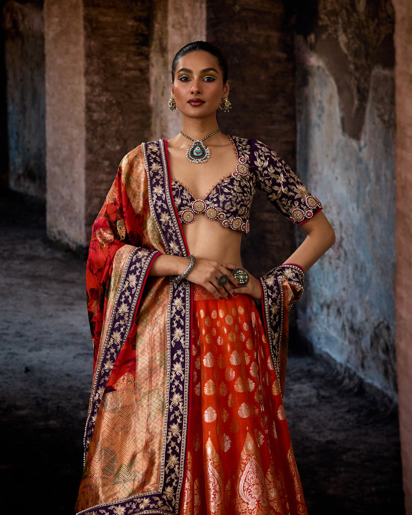 The Set comes with an intricate embroidered silk blouse and a printed silk brocade dupatta with embroidered borders around.