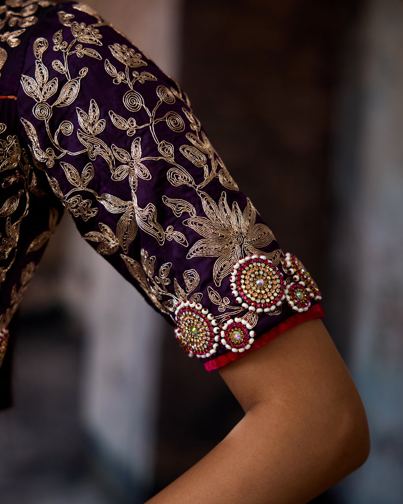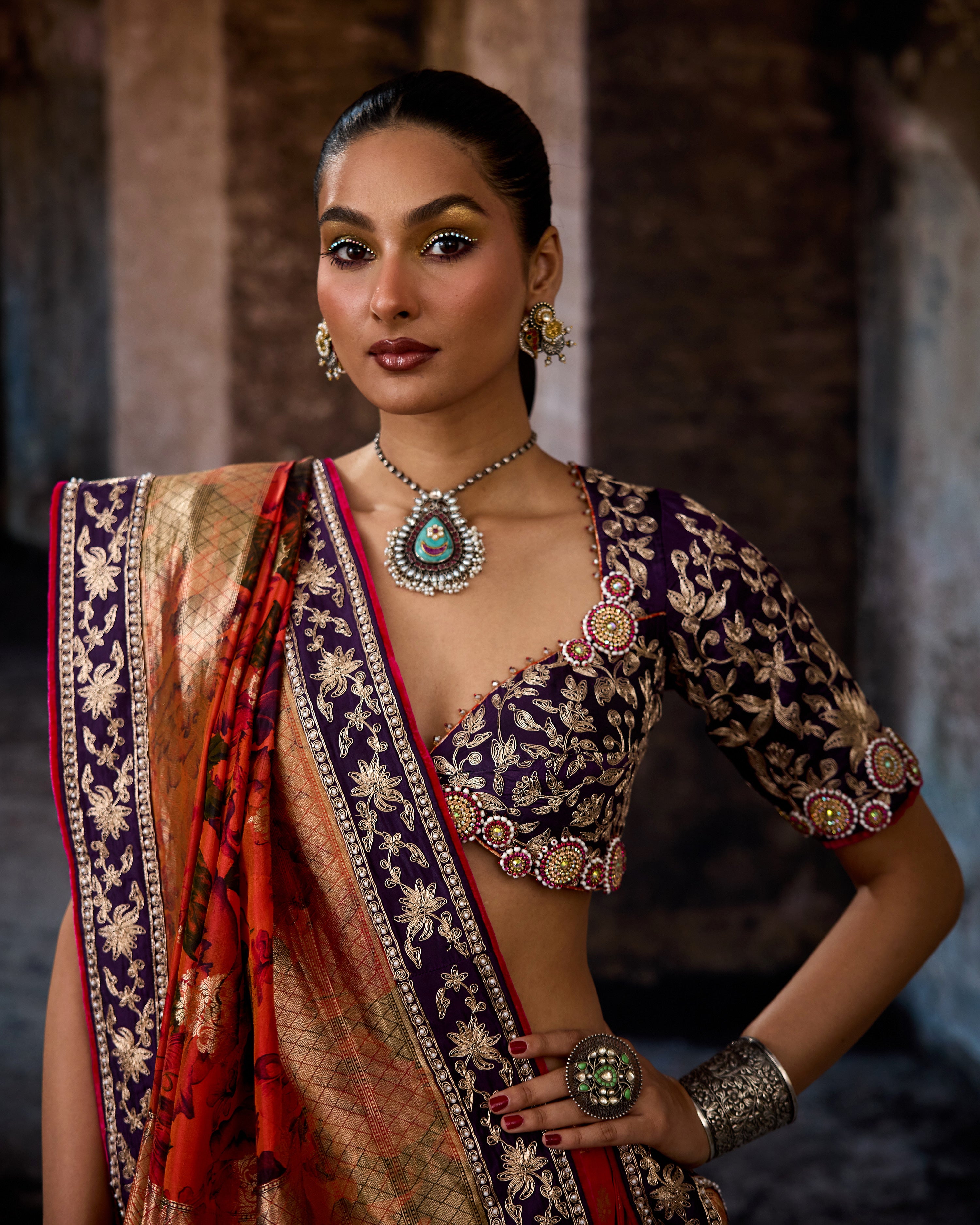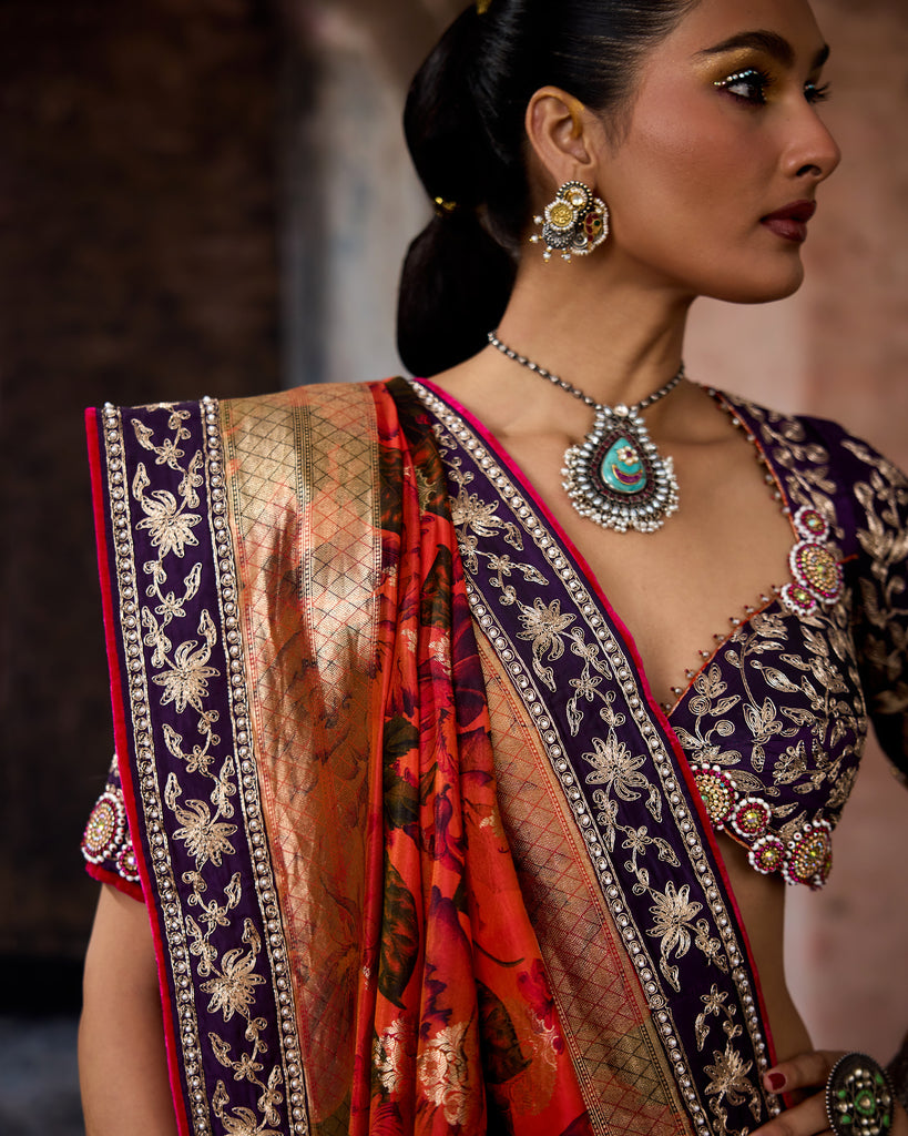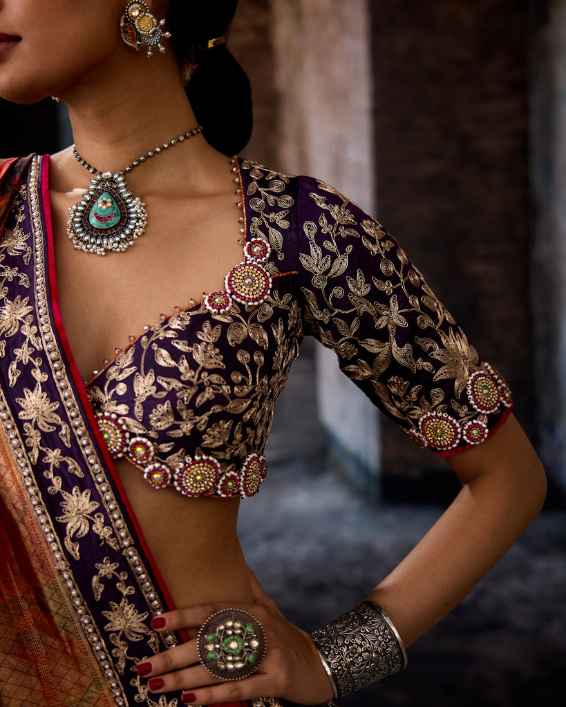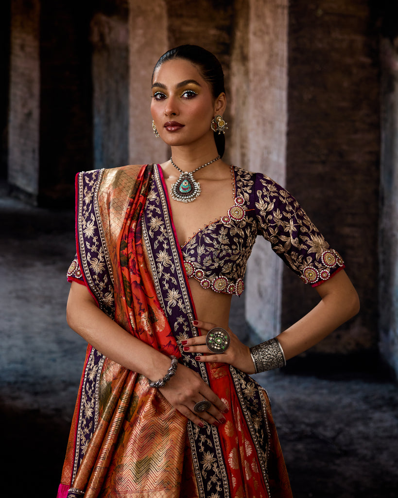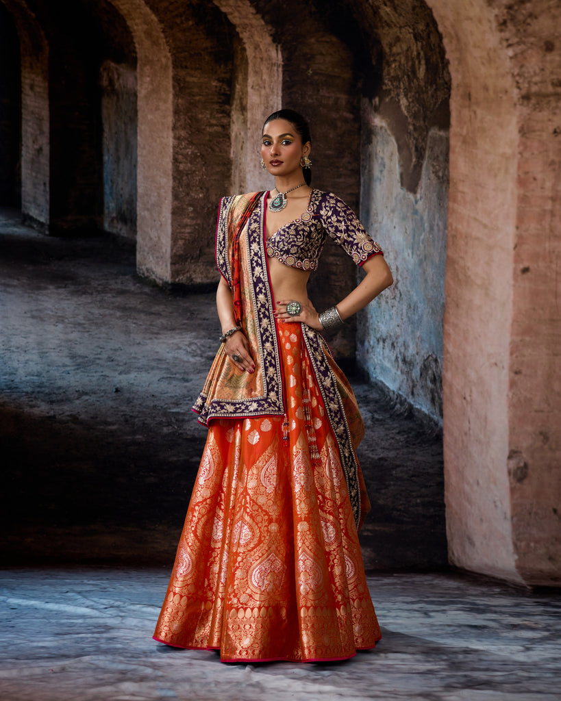The Set comes with an intricate embroidered silk blouse and a printed silk brocade dupatta with embroidered borders around.