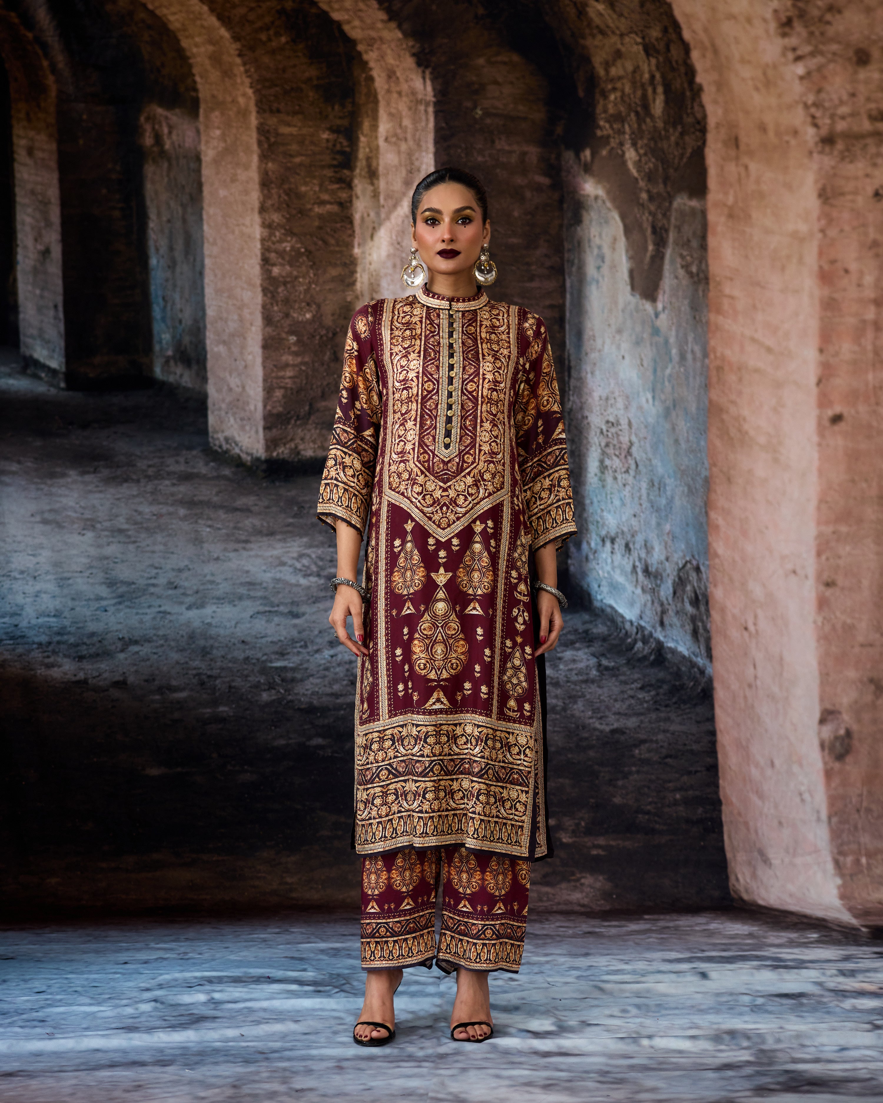 The kurta is a mandarin collar neckline silhouette with a button placket front.