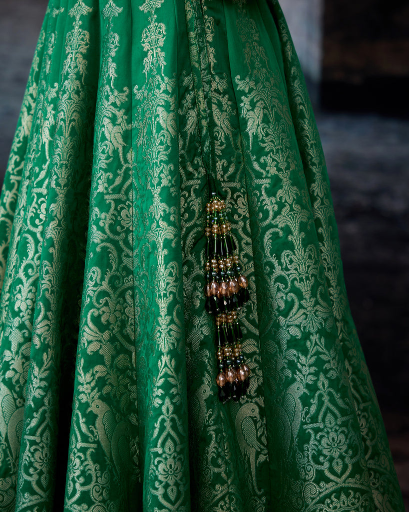 The Skirt is a silk brocade weave with a waist band and adjustable drawstring embellished in beautiful coordinating tassels with glass beads.