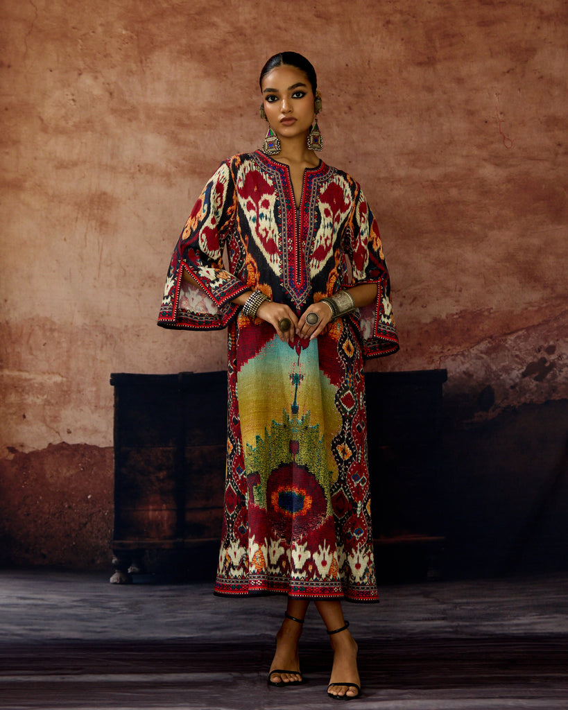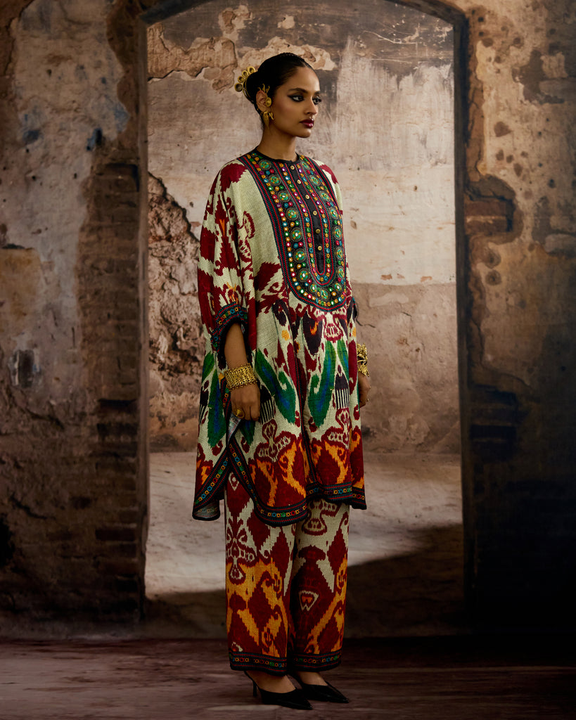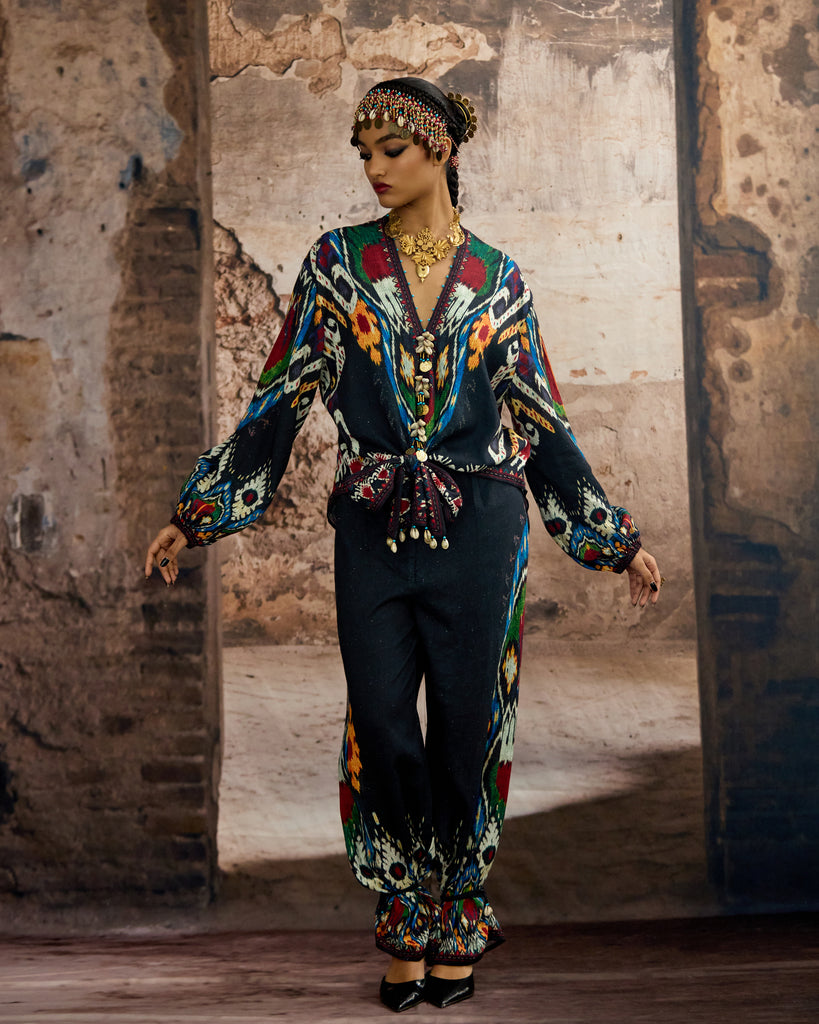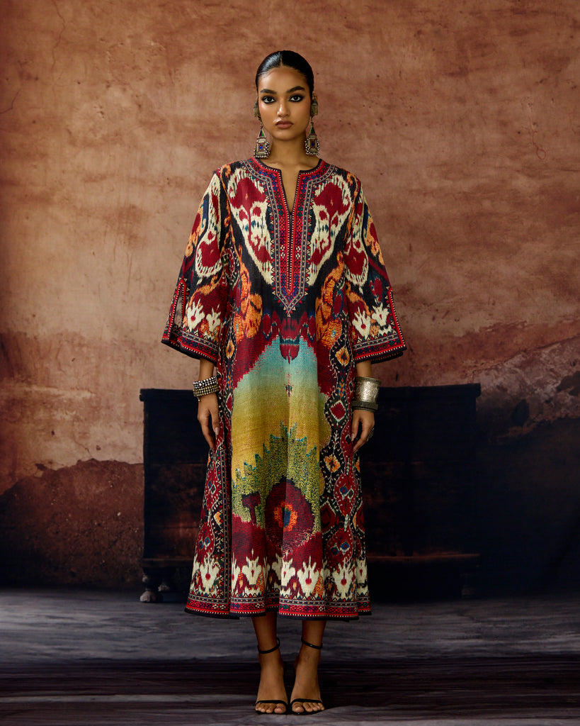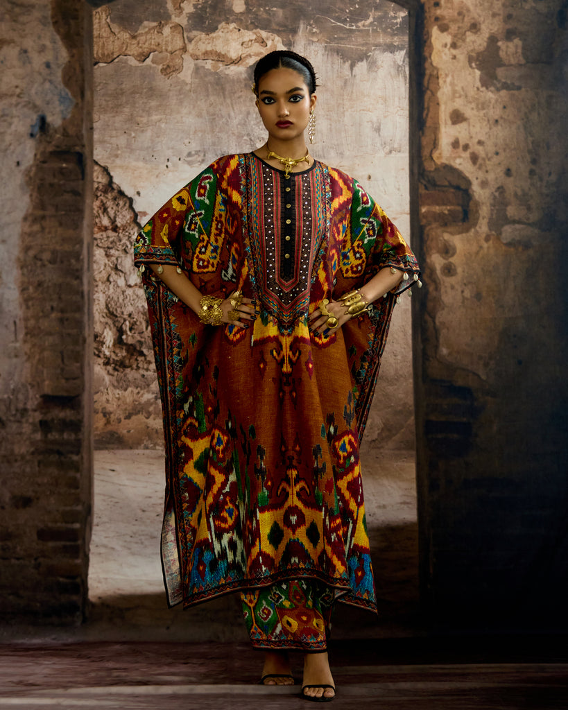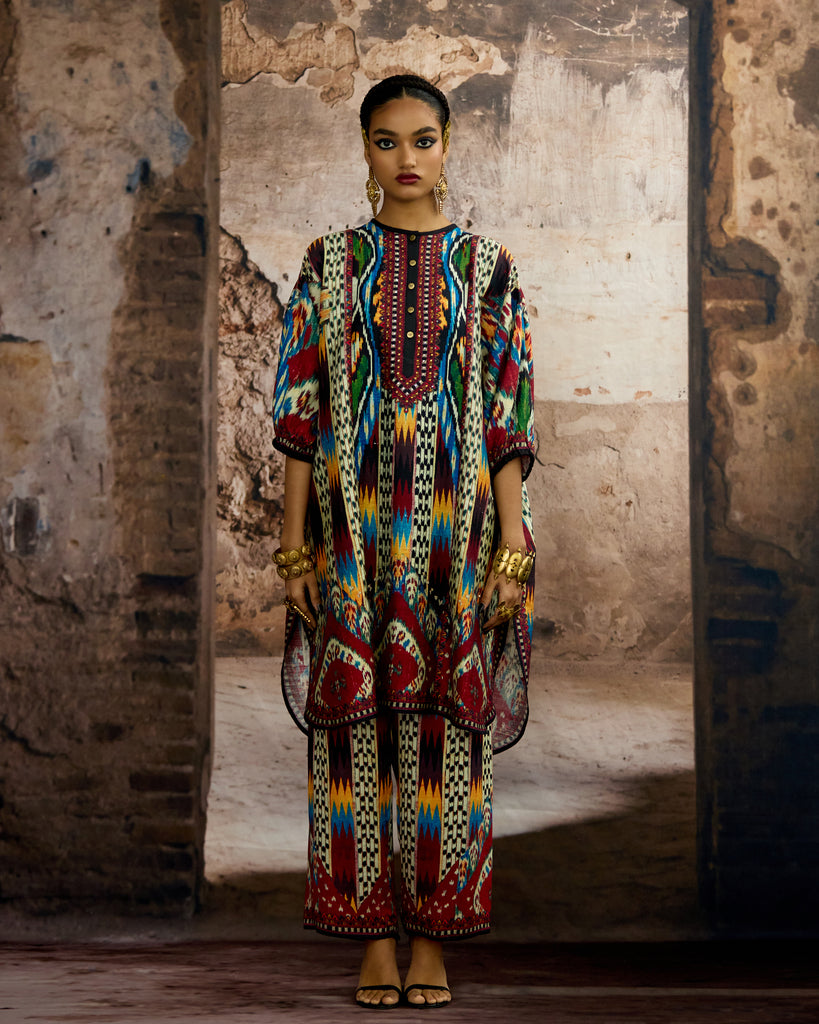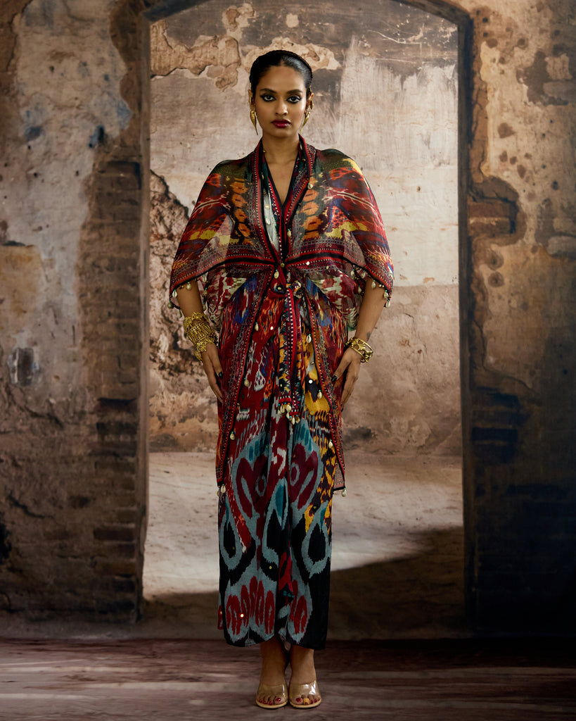 Kasbah draws from the famed Uzbek ikats and the Rabari embroideries of Kutch, merging two distant worlds into a tapestry of nomadic poetry. Pure buttery silks flow like desert sands beneath moonlight, dyed with sustainable azo-free inks in a palette of winter’s deepest moods—raven black, garnet, burnt rust, desert taupe, icy dove grey, sapphire, and emerald.