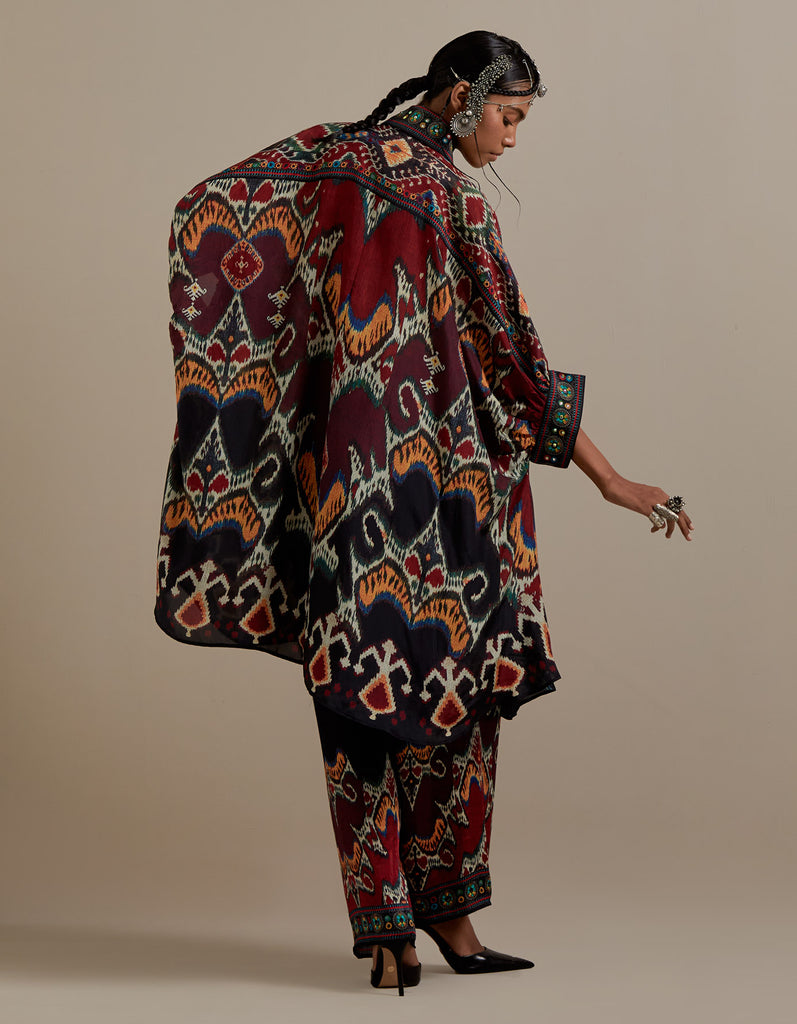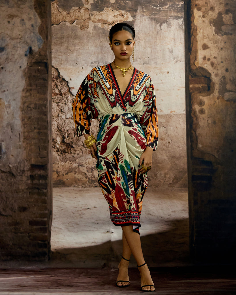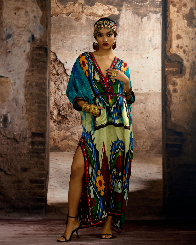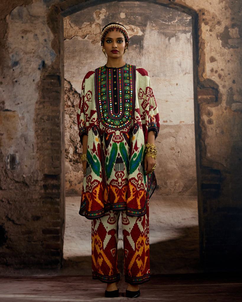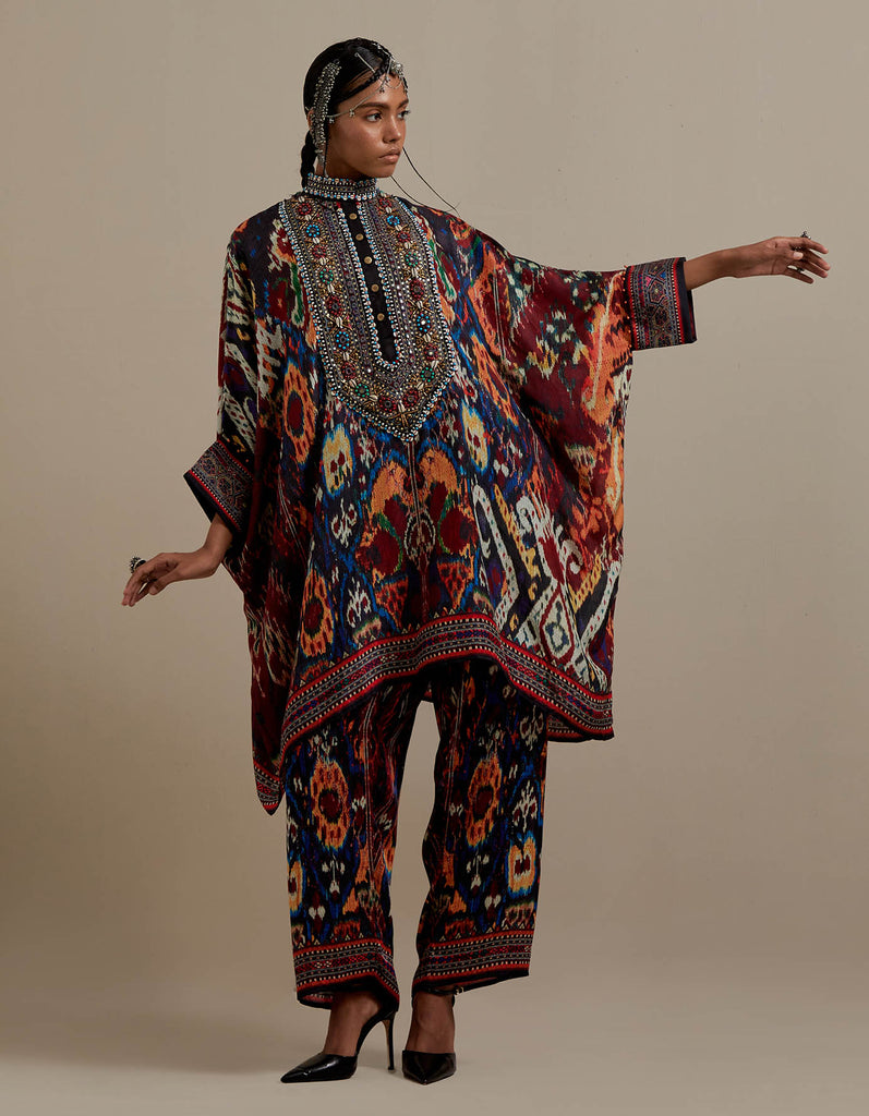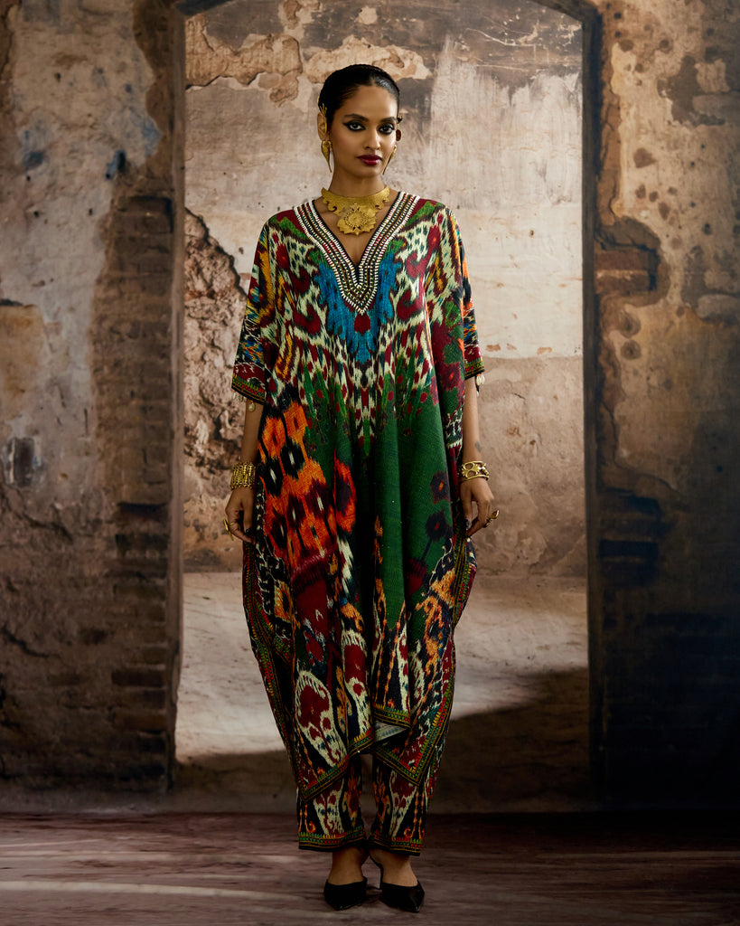Kasbah draws from the famed Uzbek ikats and the Rabari embroideries of Kutch, merging two distant worlds into a tapestry of nomadic poetry. Pure buttery silks flow like desert sands beneath moonlight, dyed with sustainable azo-free inks in a palette of winter’s deepest moods—raven black, garnet, burnt rust, desert taupe, icy dove grey, sapphire, and emerald.