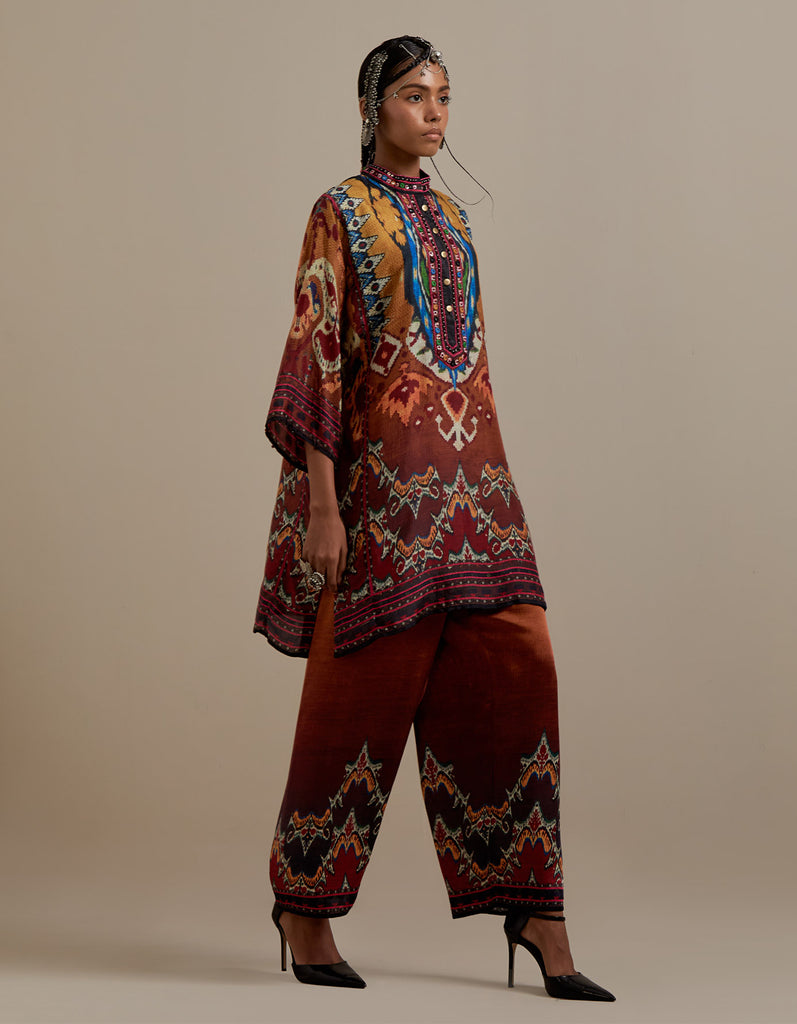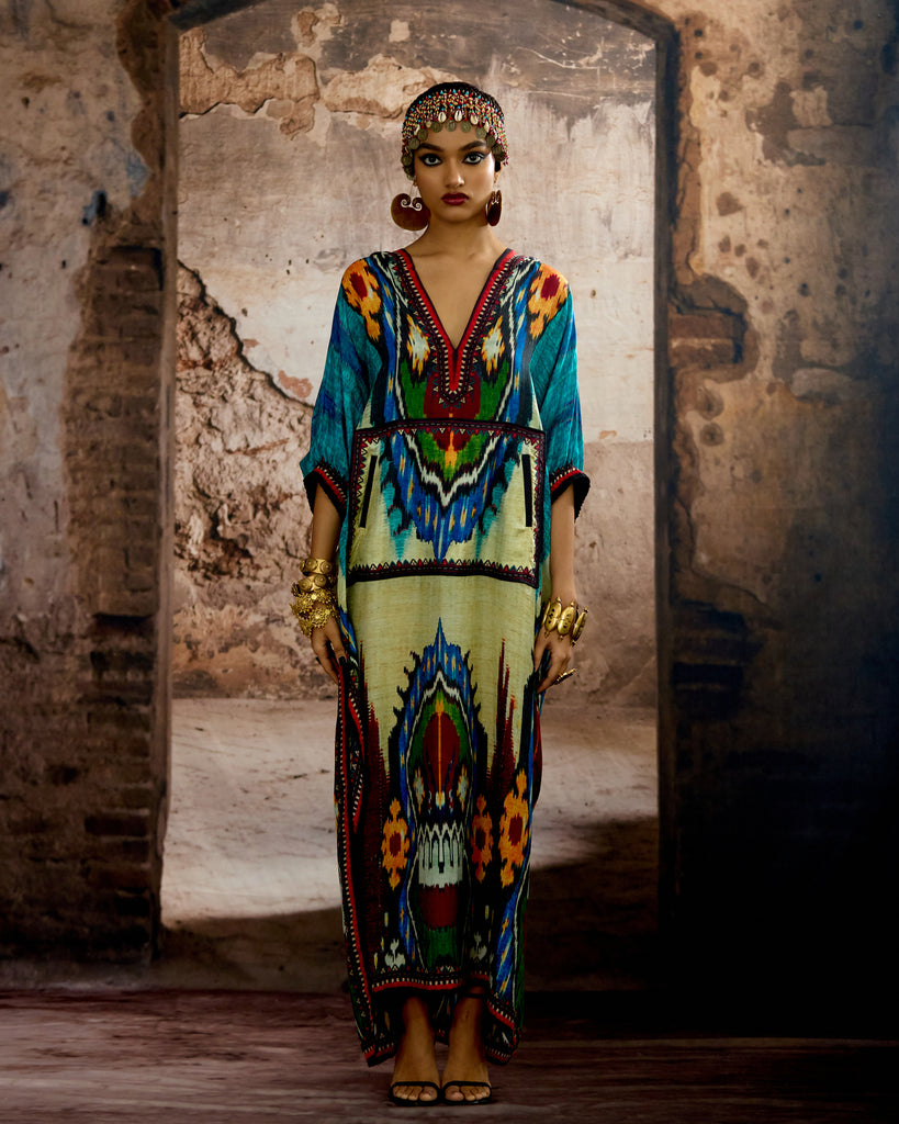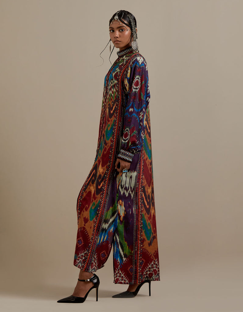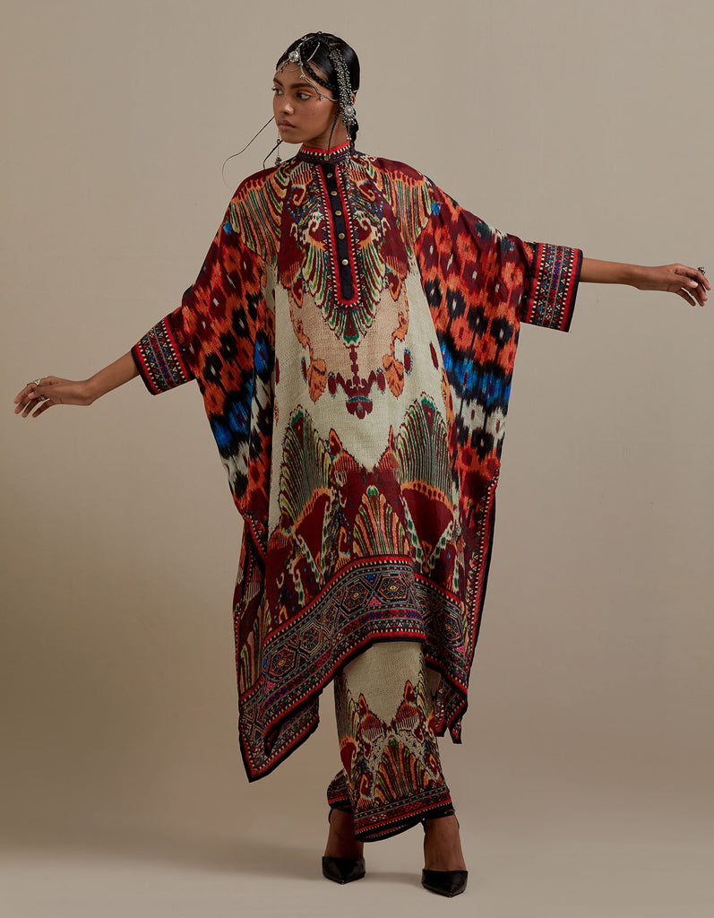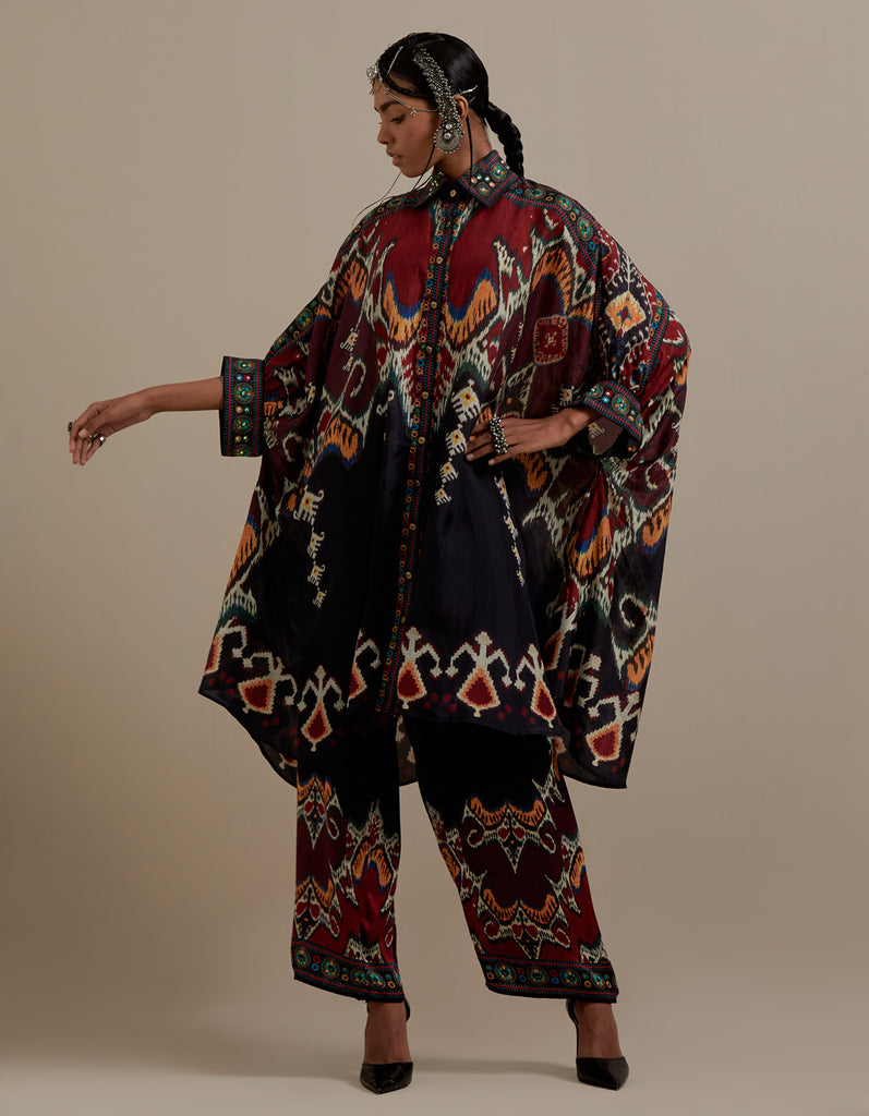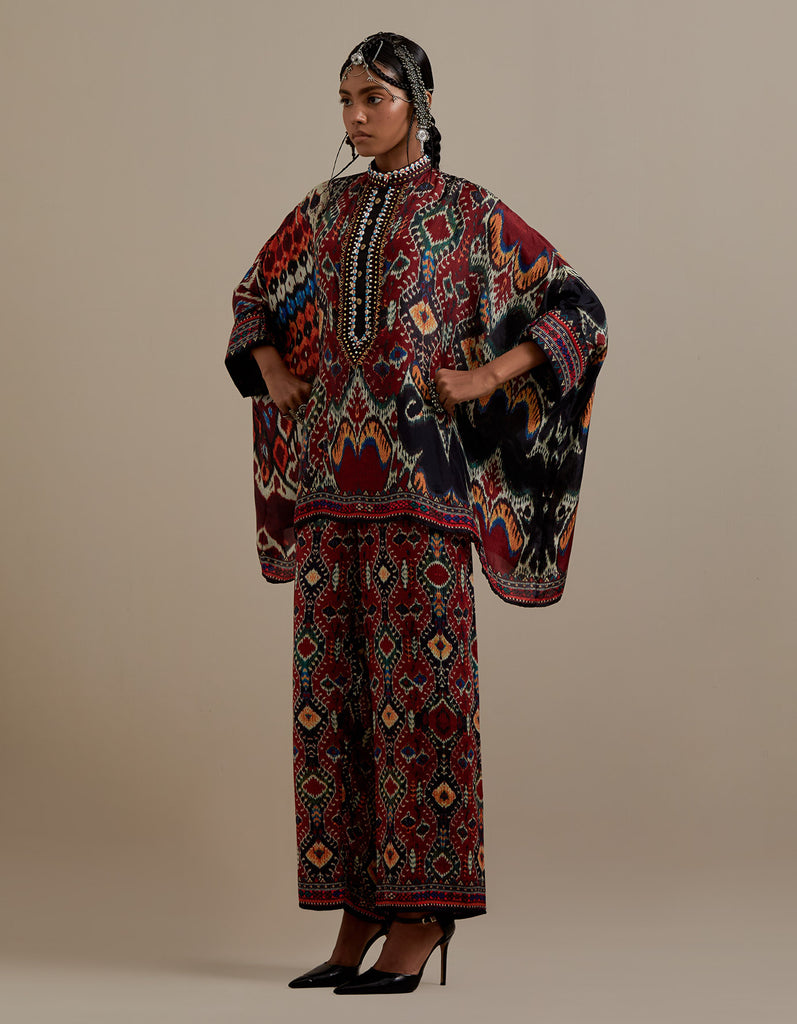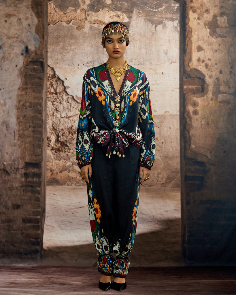 Kasbah draws from the famed Uzbek ikats and the Rabari embroideries of Kutch, merging two distant worlds into a tapestry of nomadic poetry. Pure buttery silks flow like desert sands beneath moonlight, dyed with sustainable azo-free inks in a palette of winter’s deepest moods—raven black, garnet, burnt rust, desert taupe, icy dove grey, sapphire, and emerald.