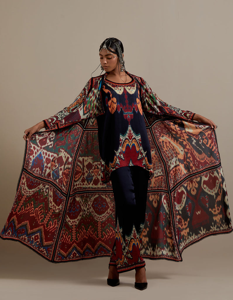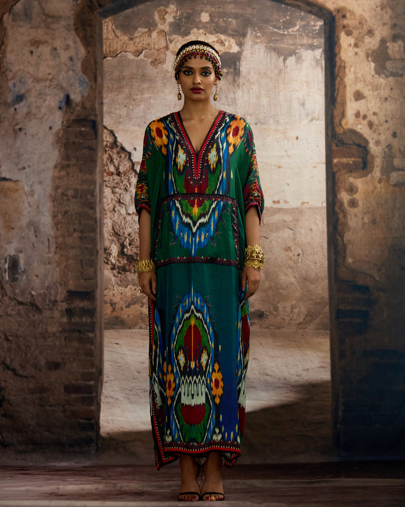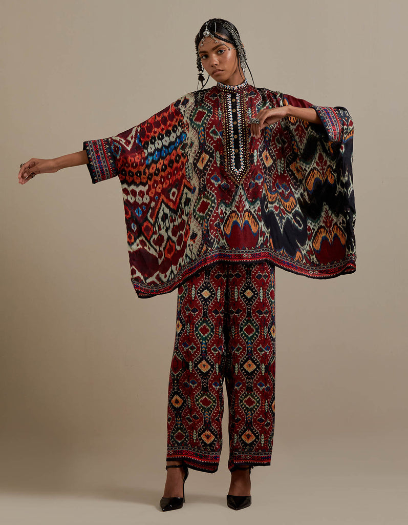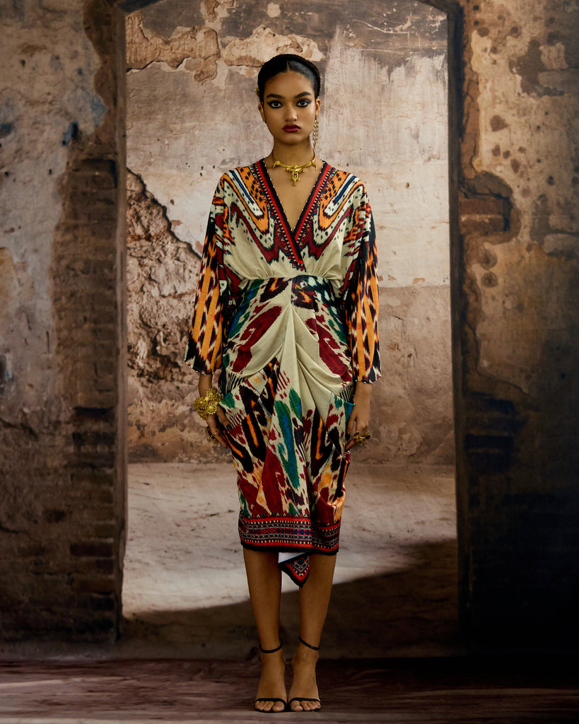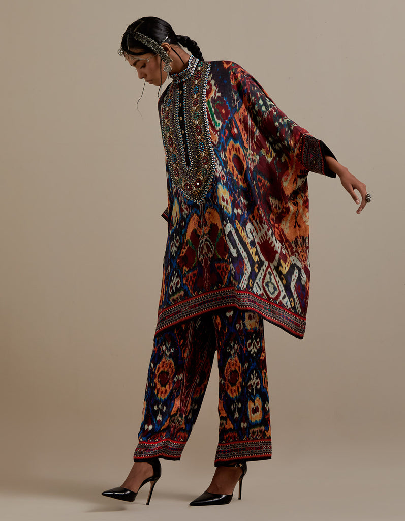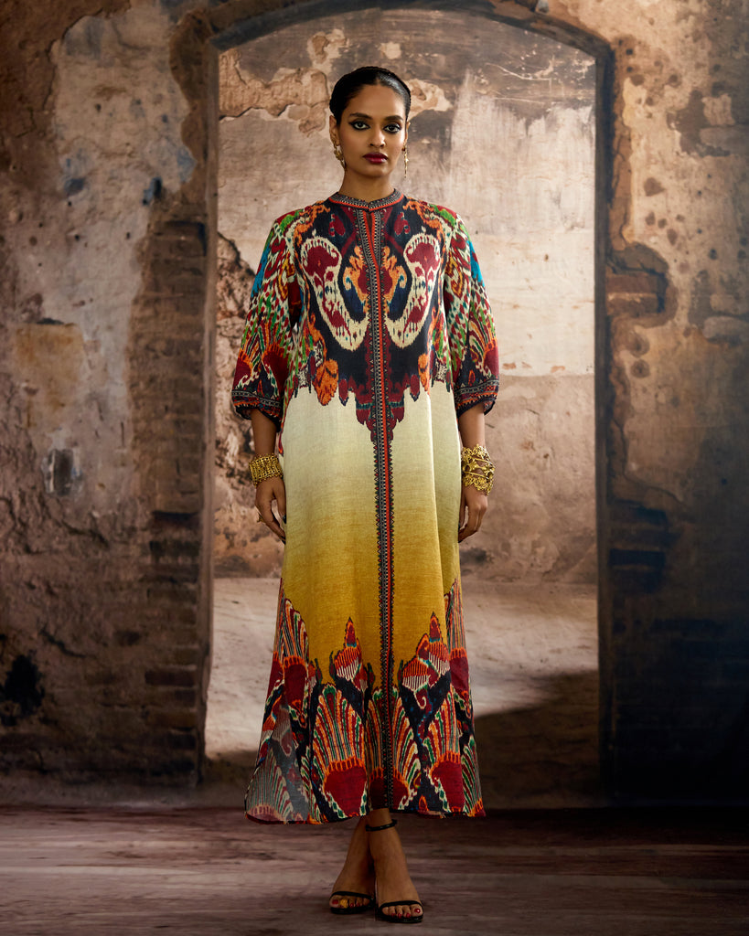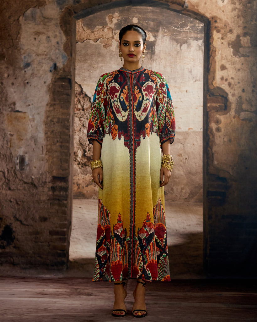 Kasbah draws from the famed Uzbek ikats and the Rabari embroideries of Kutch, merging two distant worlds into a tapestry of nomadic poetry. Pure buttery silks flow like desert sands beneath moonlight, dyed with sustainable azo-free inks in a palette of winter’s deepest moods—raven black, garnet, burnt rust, desert taupe, icy dove grey, sapphire, and emerald.
