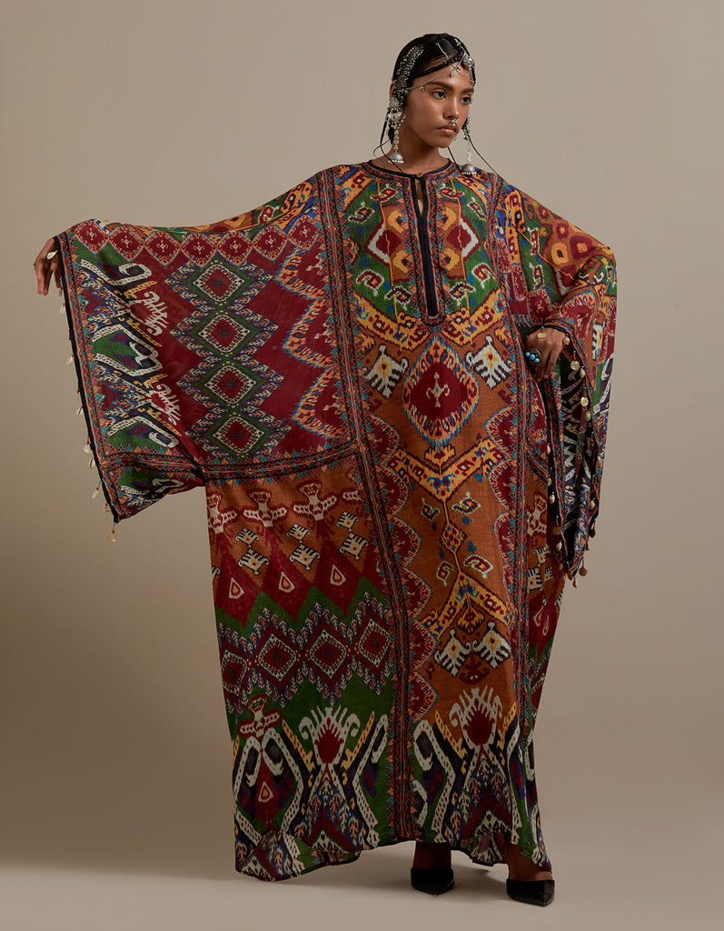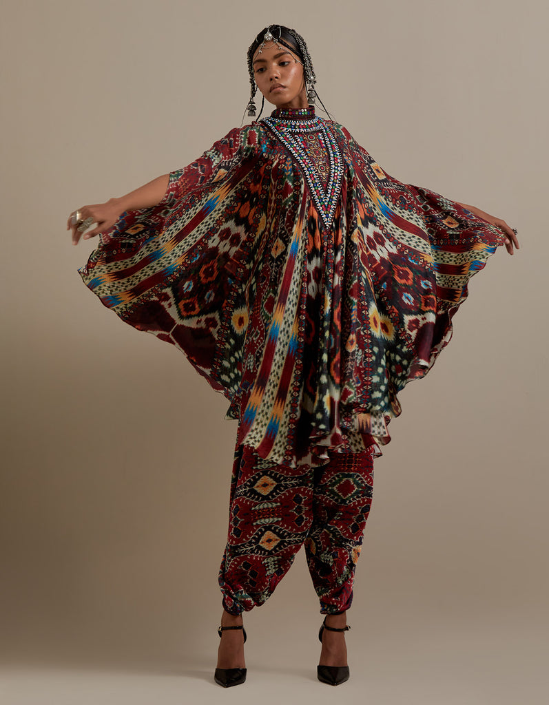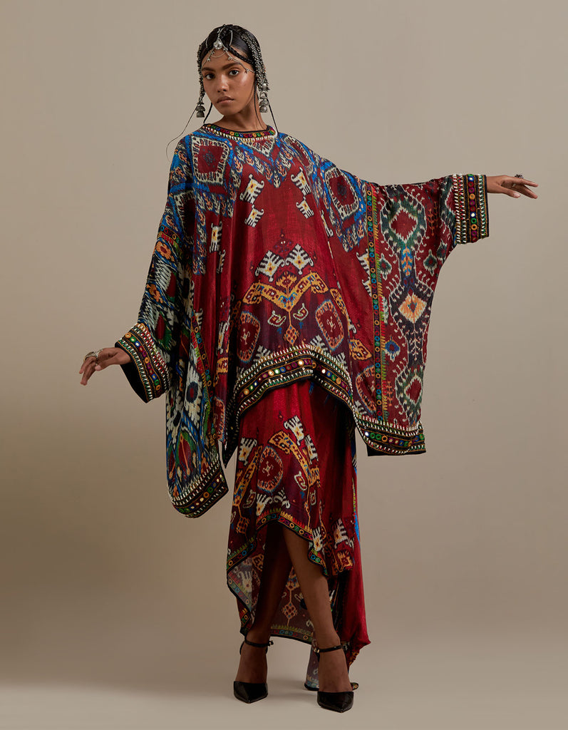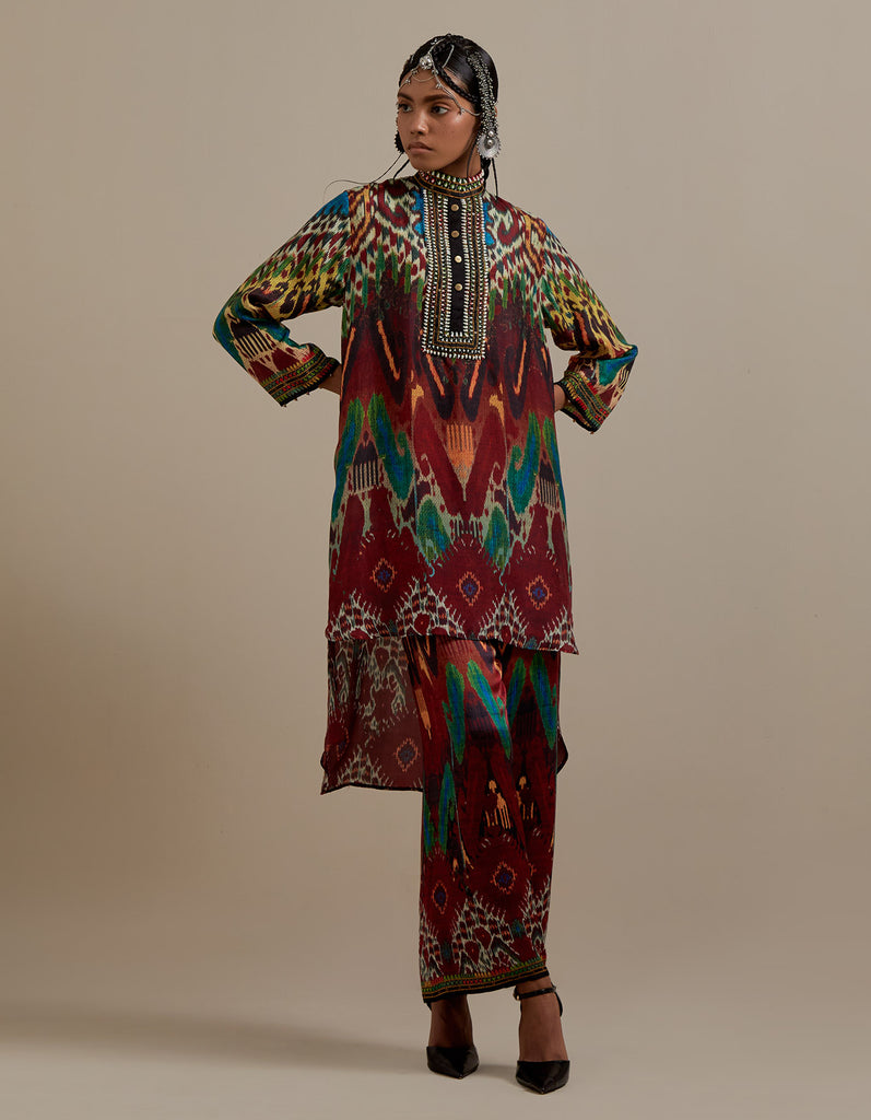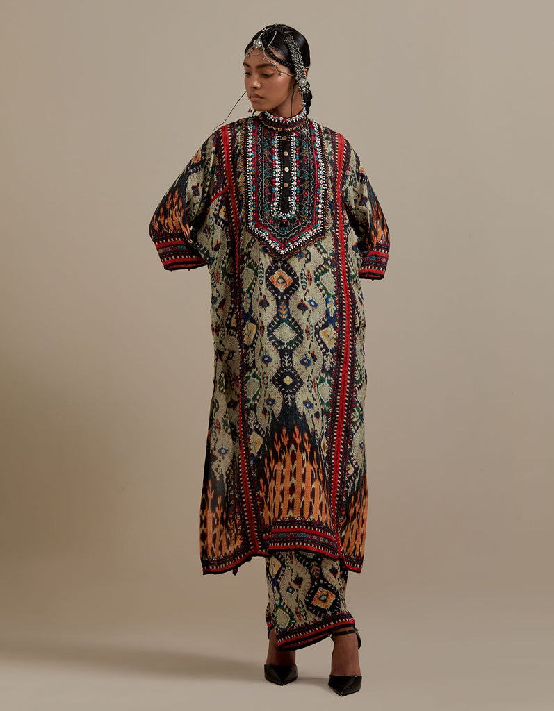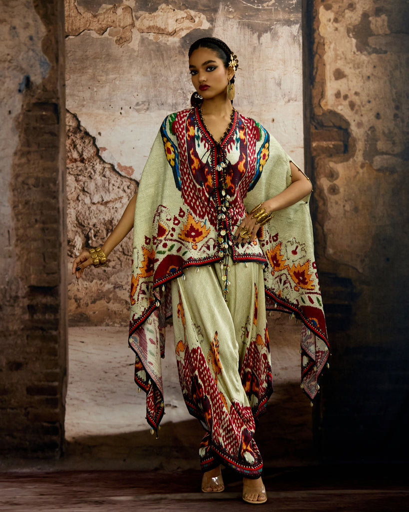 Kasbah draws from the famed Uzbek ikats and the Rabari embroideries of Kutch, merging two distant worlds into a tapestry of nomadic poetry. Pure buttery silks flow like desert sands beneath moonlight, dyed with sustainable azo-free inks in a palette of winter’s deepest moods—raven black, garnet, burnt rust, desert taupe, icy dove grey, sapphire, and emerald.