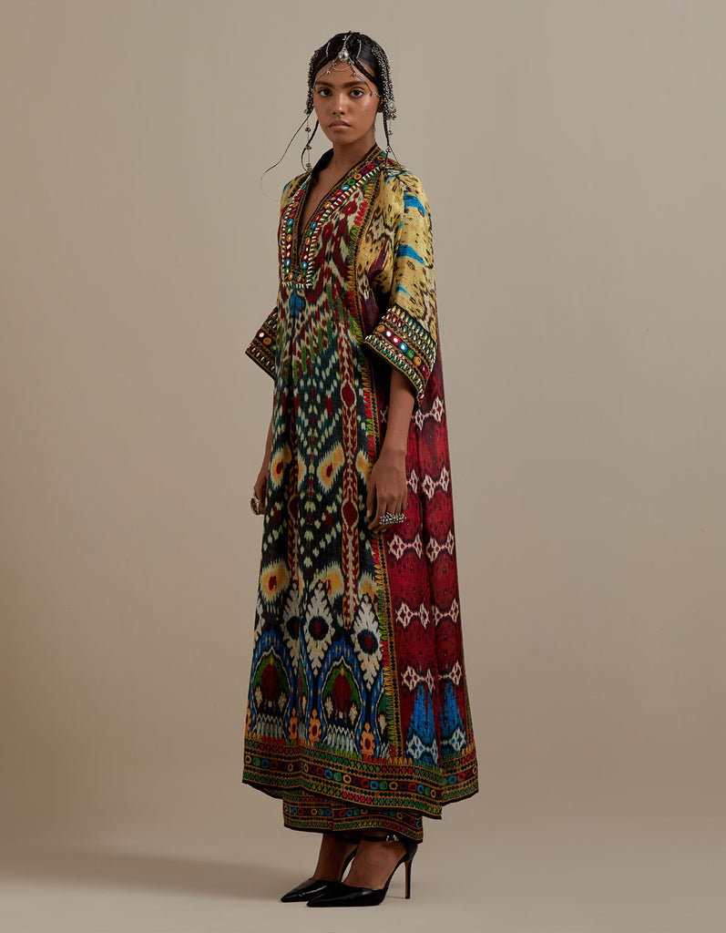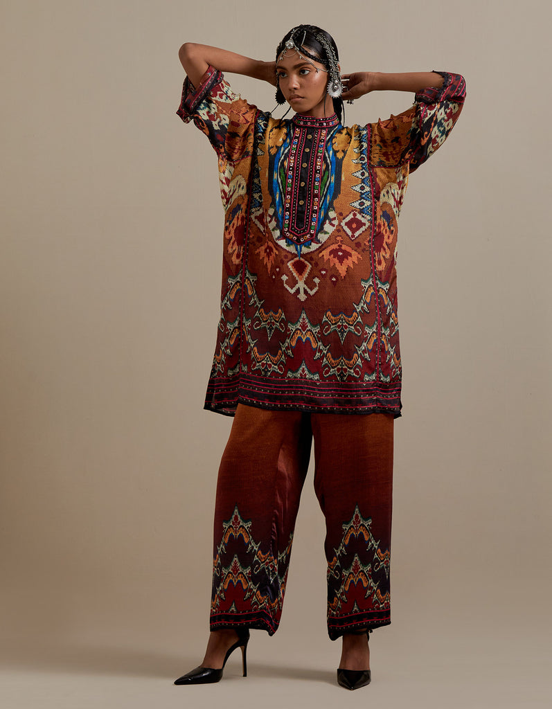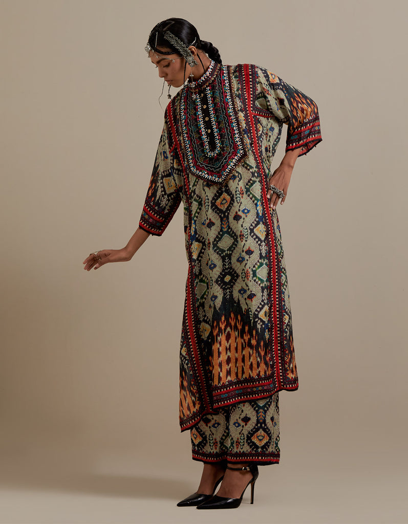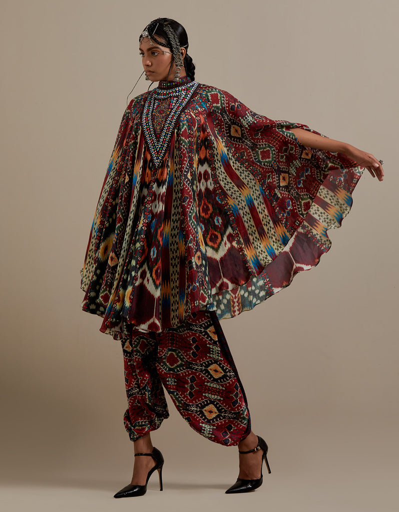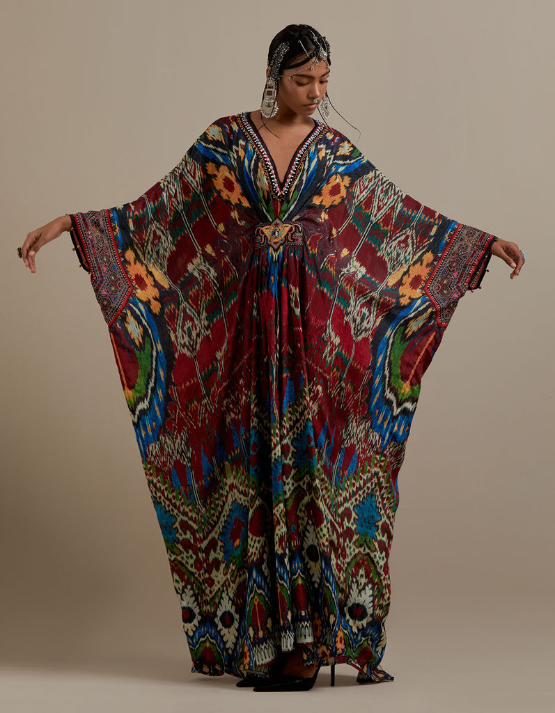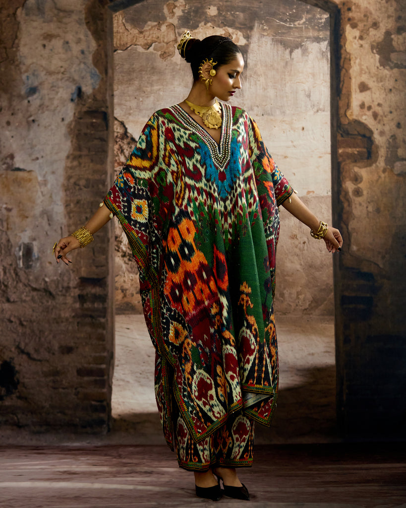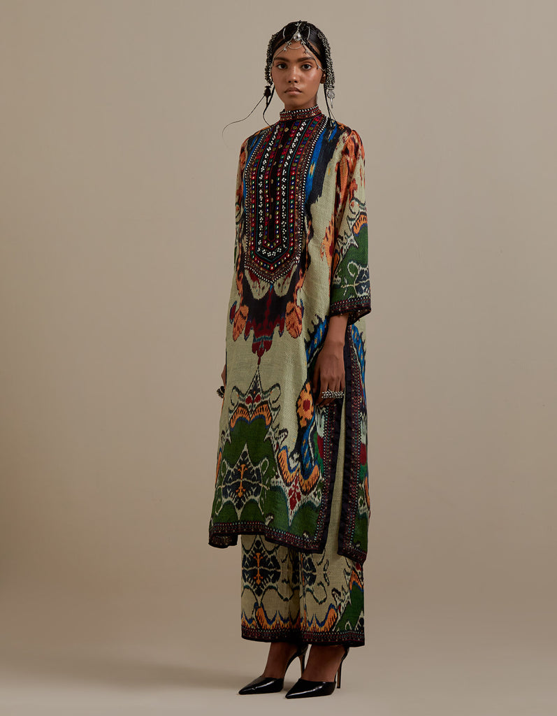 Kasbah draws from the famed Uzbek ikats and the Rabari embroideries of Kutch, merging two distant worlds into a tapestry of nomadic poetry. Pure buttery silks flow like desert sands beneath moonlight, dyed with sustainable azo-free inks in a palette of winter’s deepest moods—raven black, garnet, burnt rust, desert taupe, icy dove grey, sapphire, and emerald.