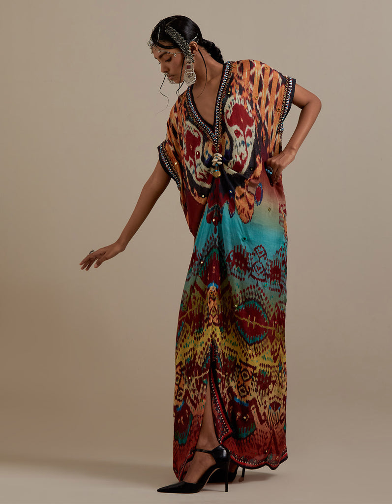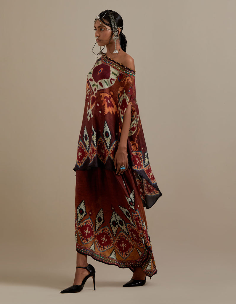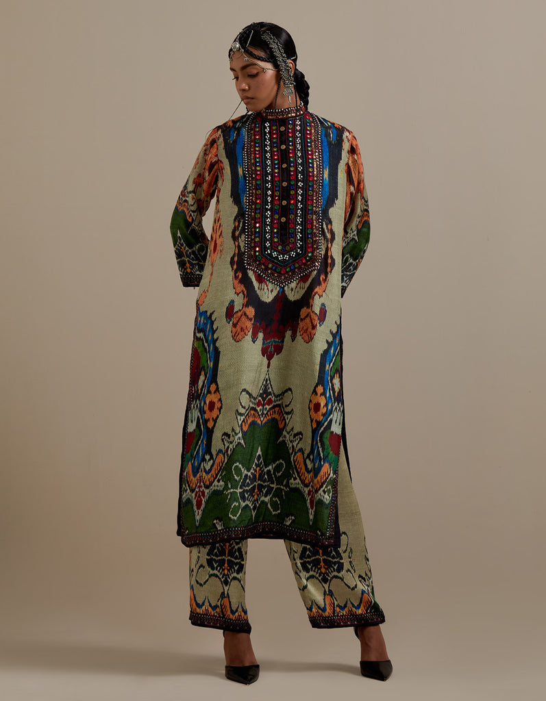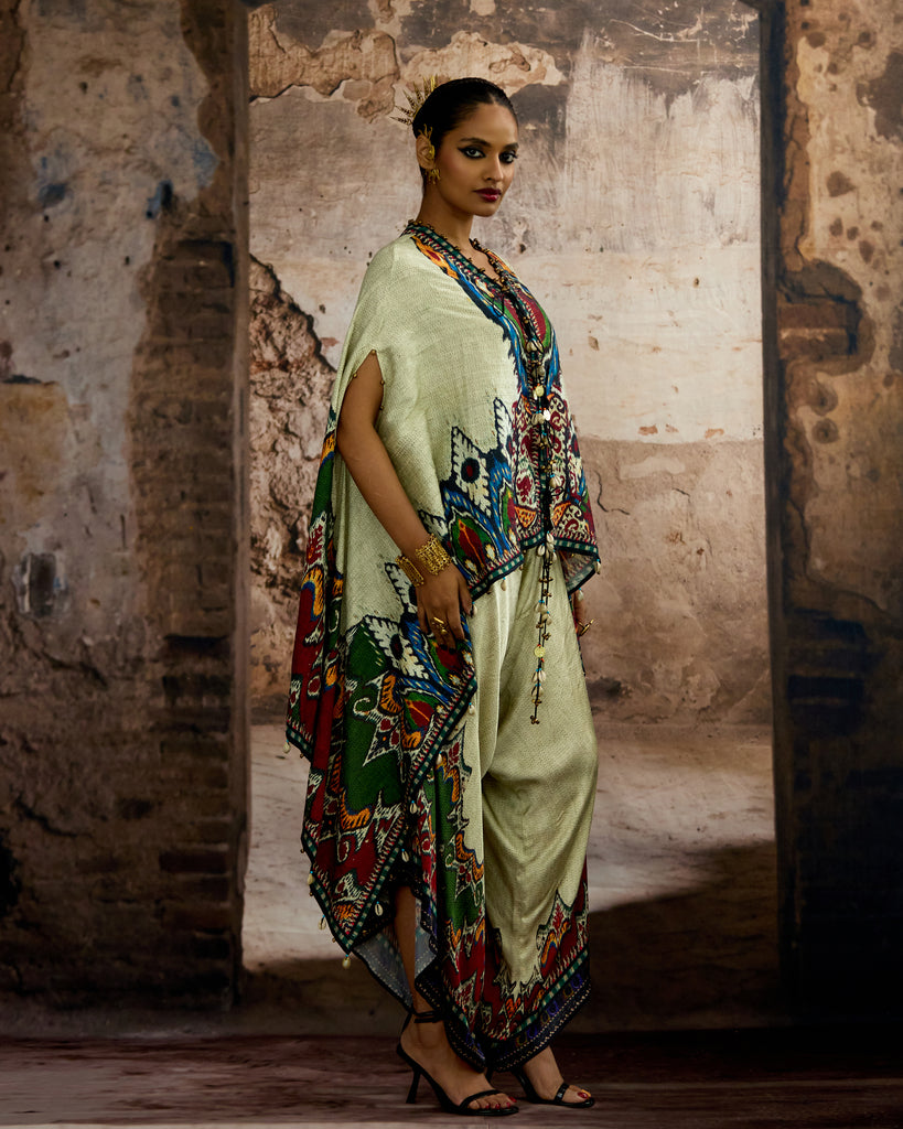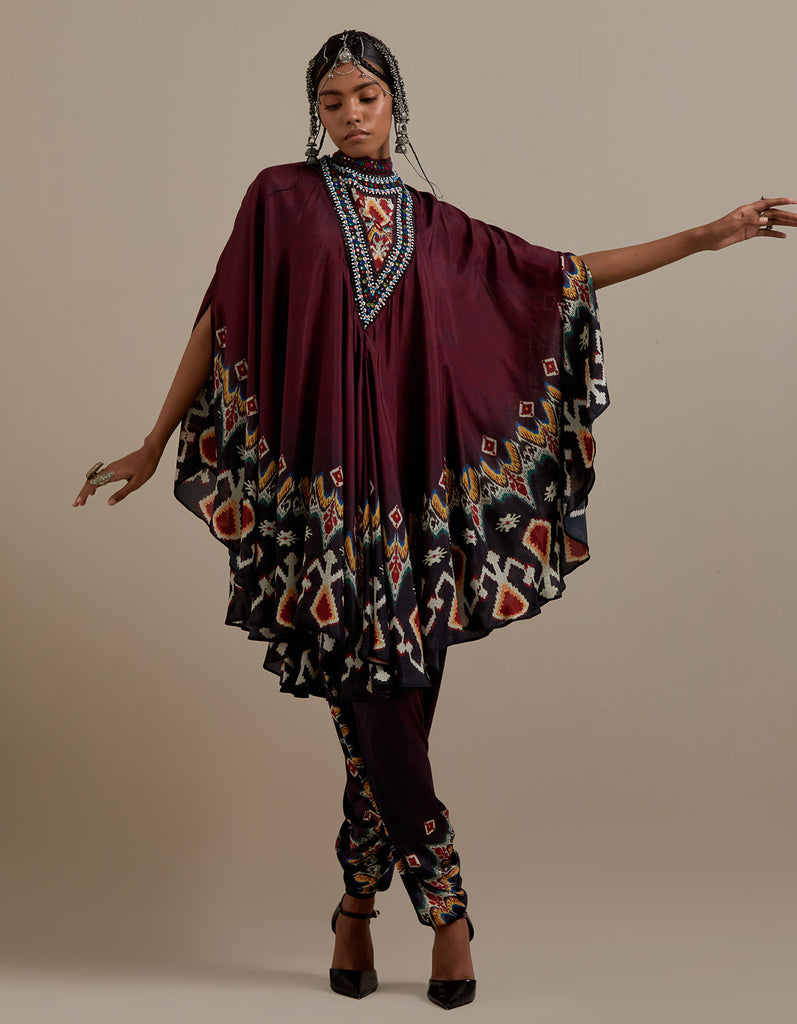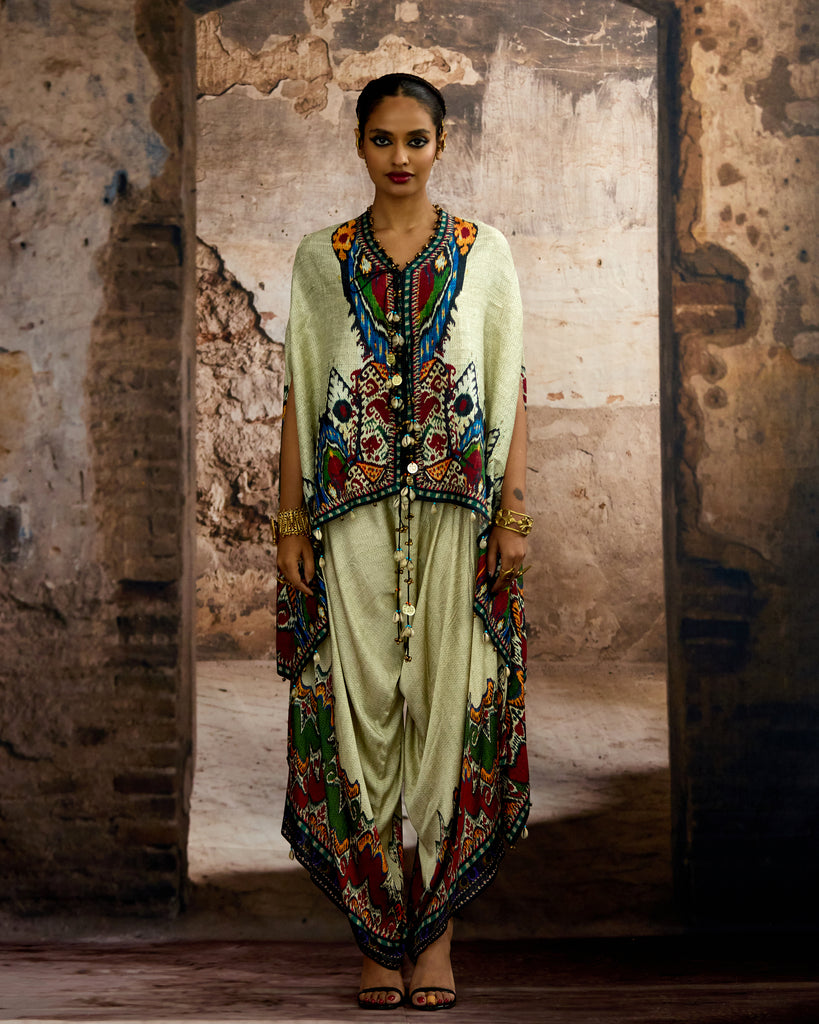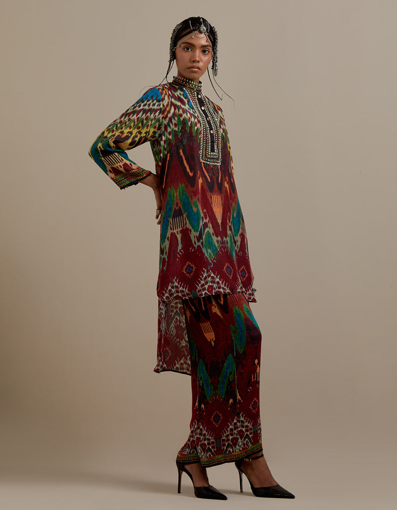 Kasbah draws from the famed Uzbek ikats and the Rabari embroideries of Kutch, merging two distant worlds into a tapestry of nomadic poetry. Pure buttery silks flow like desert sands beneath moonlight, dyed with sustainable azo-free inks in a palette of winter’s deepest moods—raven black, garnet, burnt rust, desert taupe, icy dove grey, sapphire, and emerald.