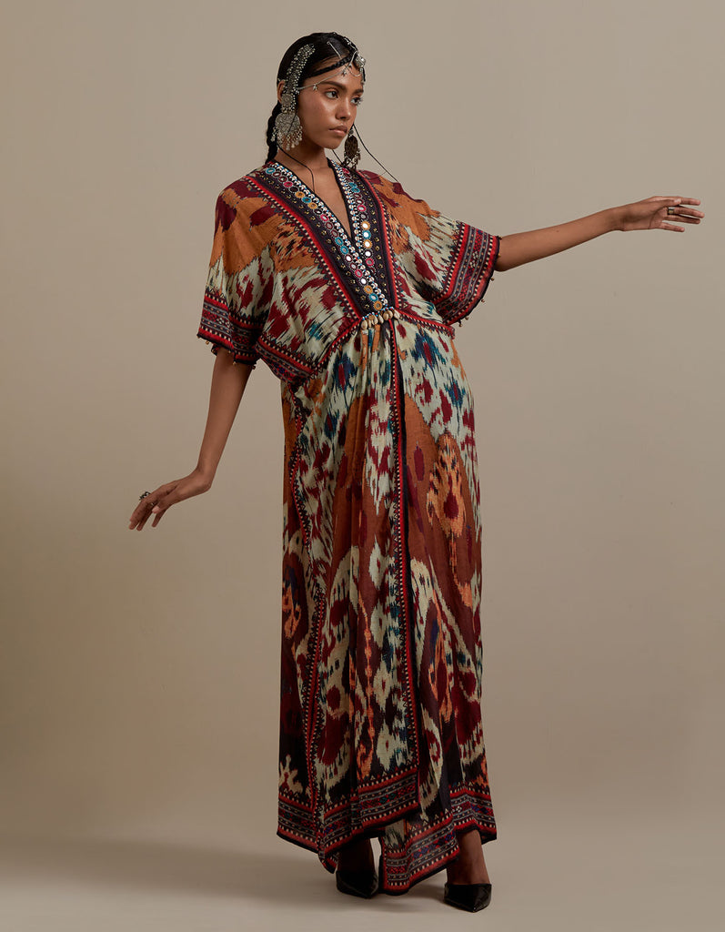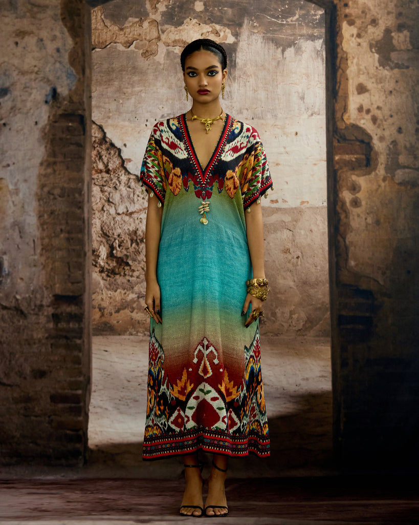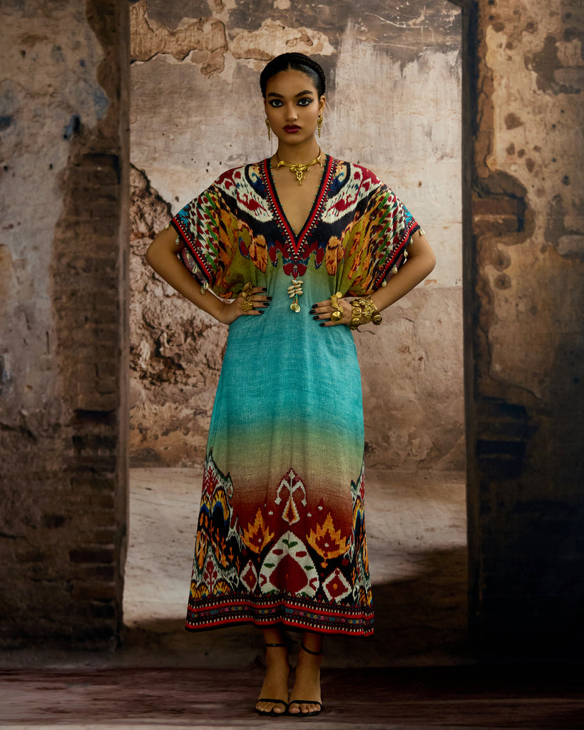Each silhouette is alive with embellishments—feroza stones glimmering like the Arabian seas, coral beads echoing sunset dunes, brass accents shimmering like ancient souks, and tribal mirror-work catching the light like stars in an endless sky. Antique metallic cords entwine with eclectic ikat prints, evoking the strength of tradition and the seduction of the exotic.