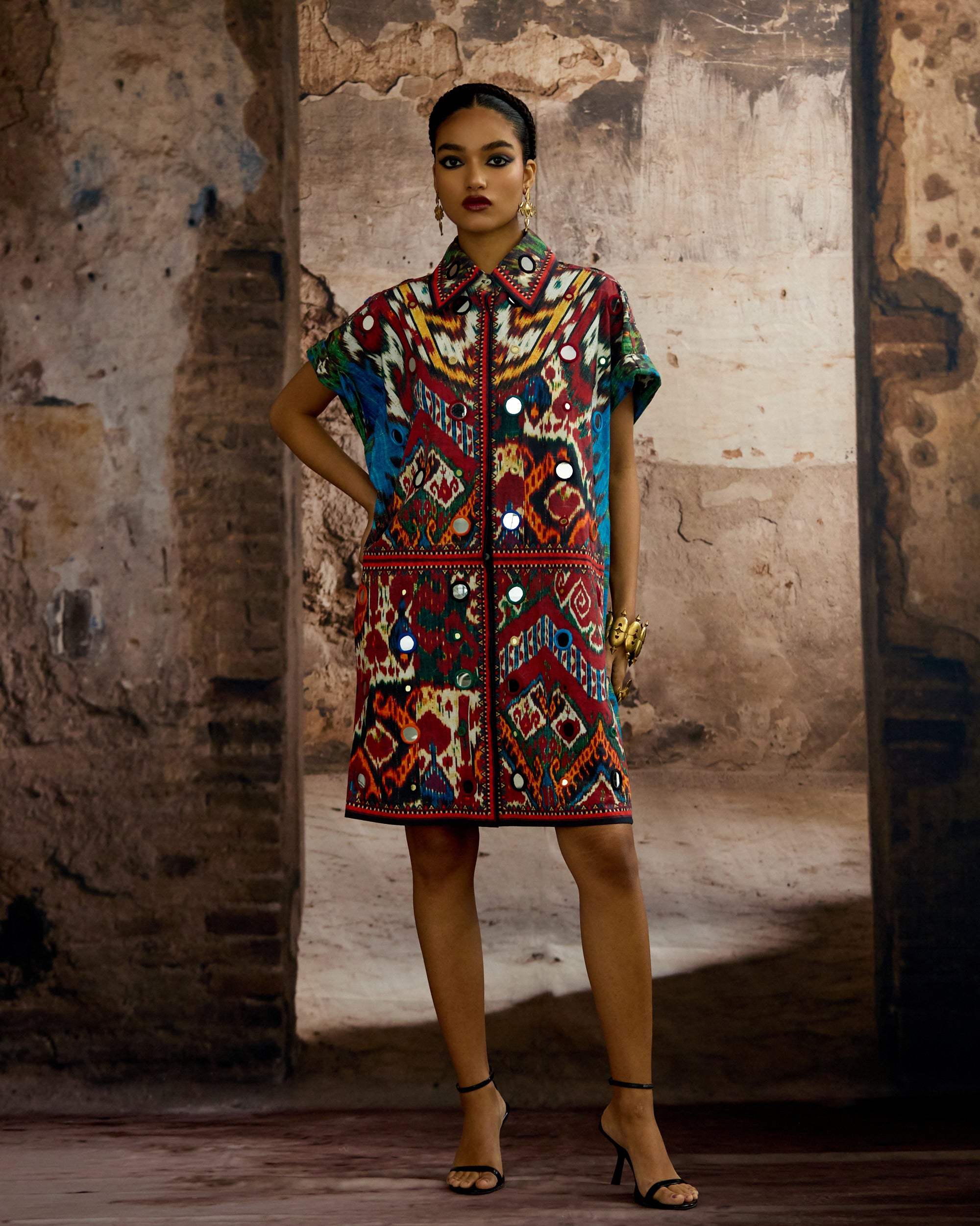 A printed button front shirt dress with front pockets at the waistline. The dress has a collar and fold-up drop shoulder hems.