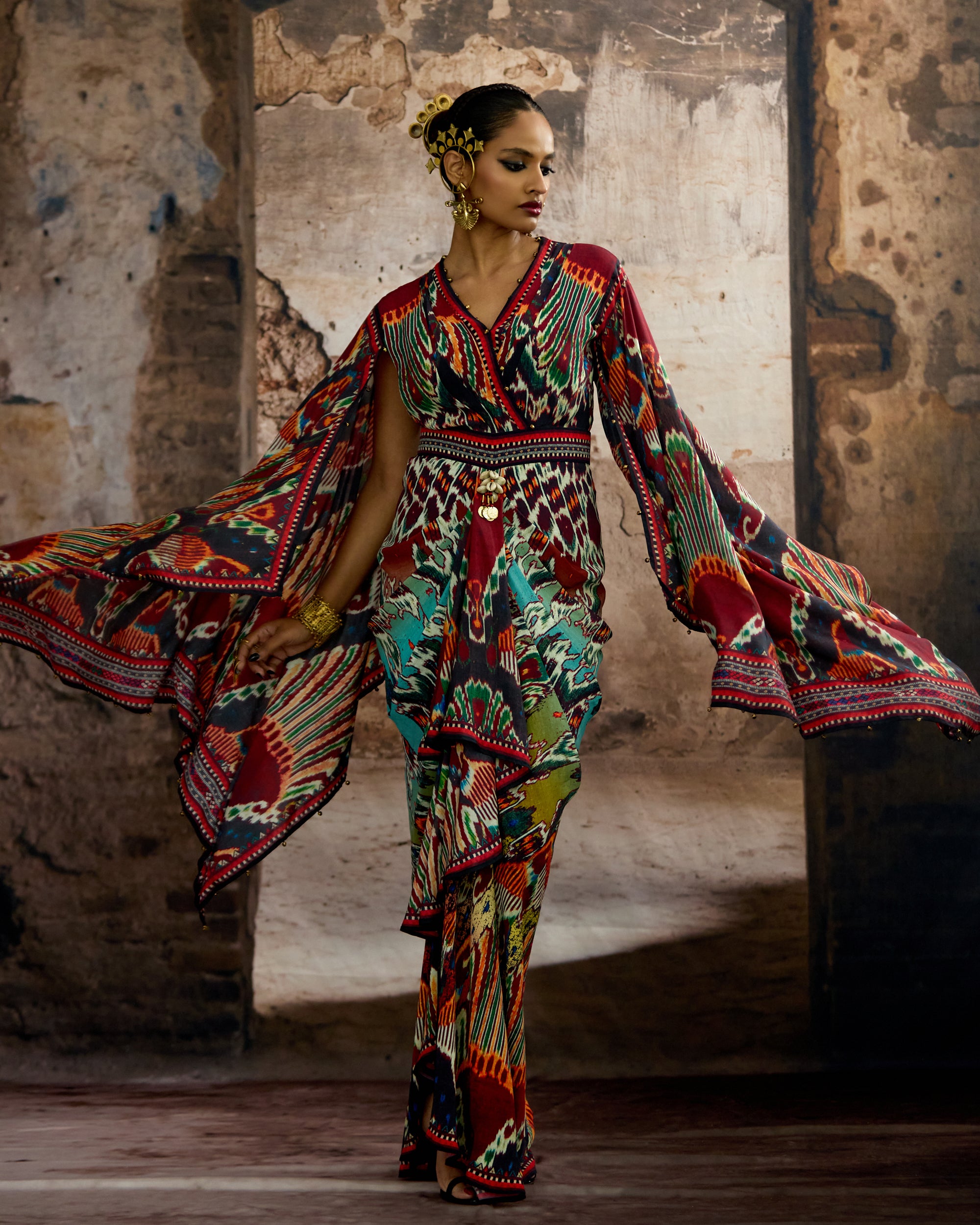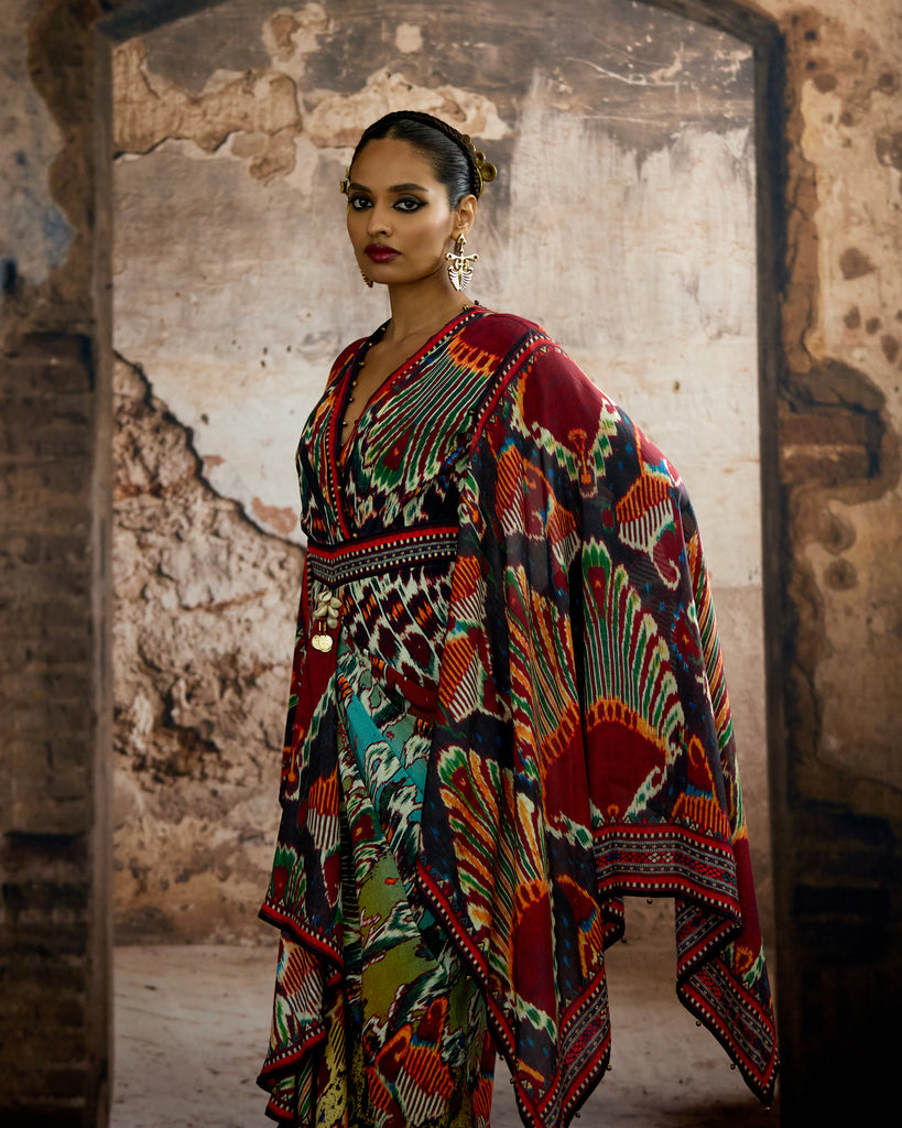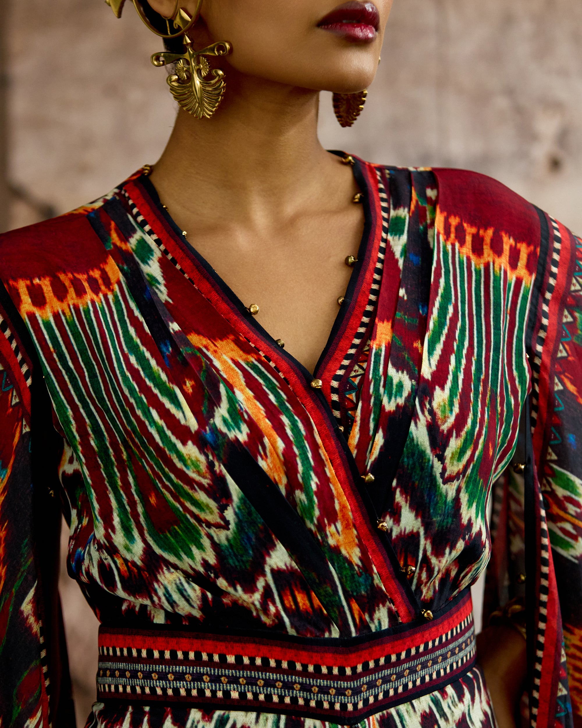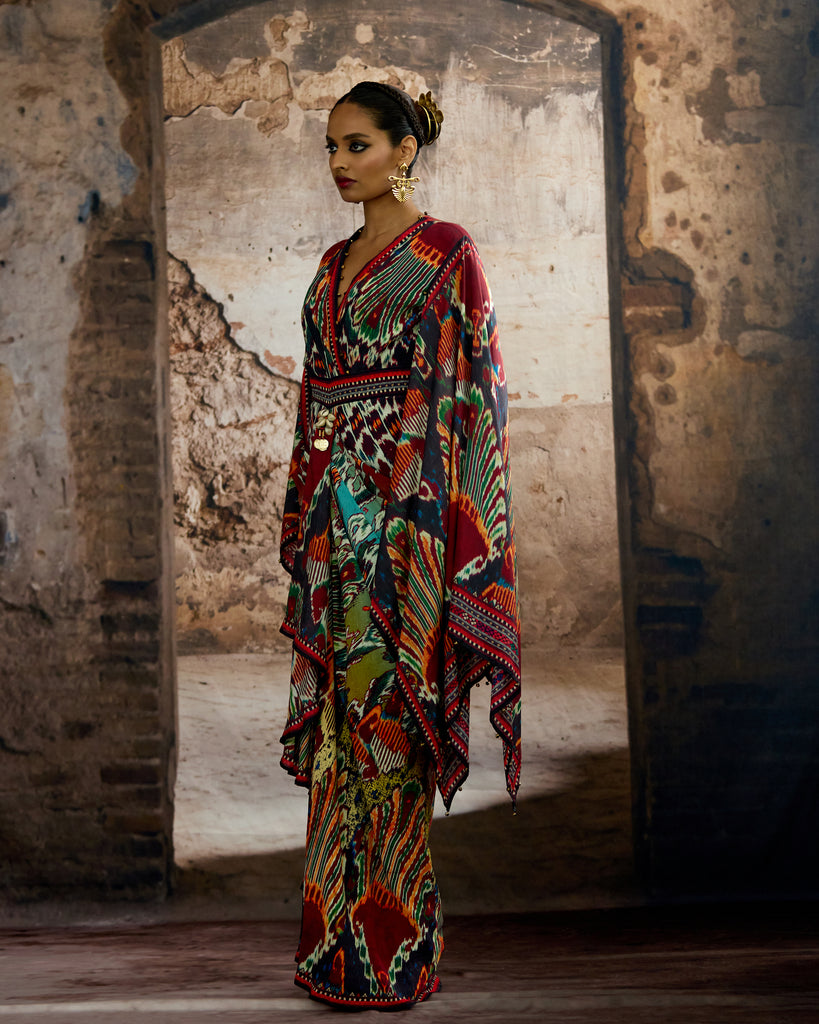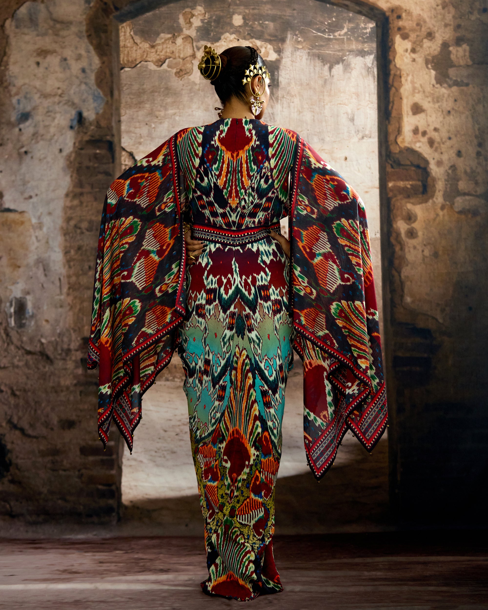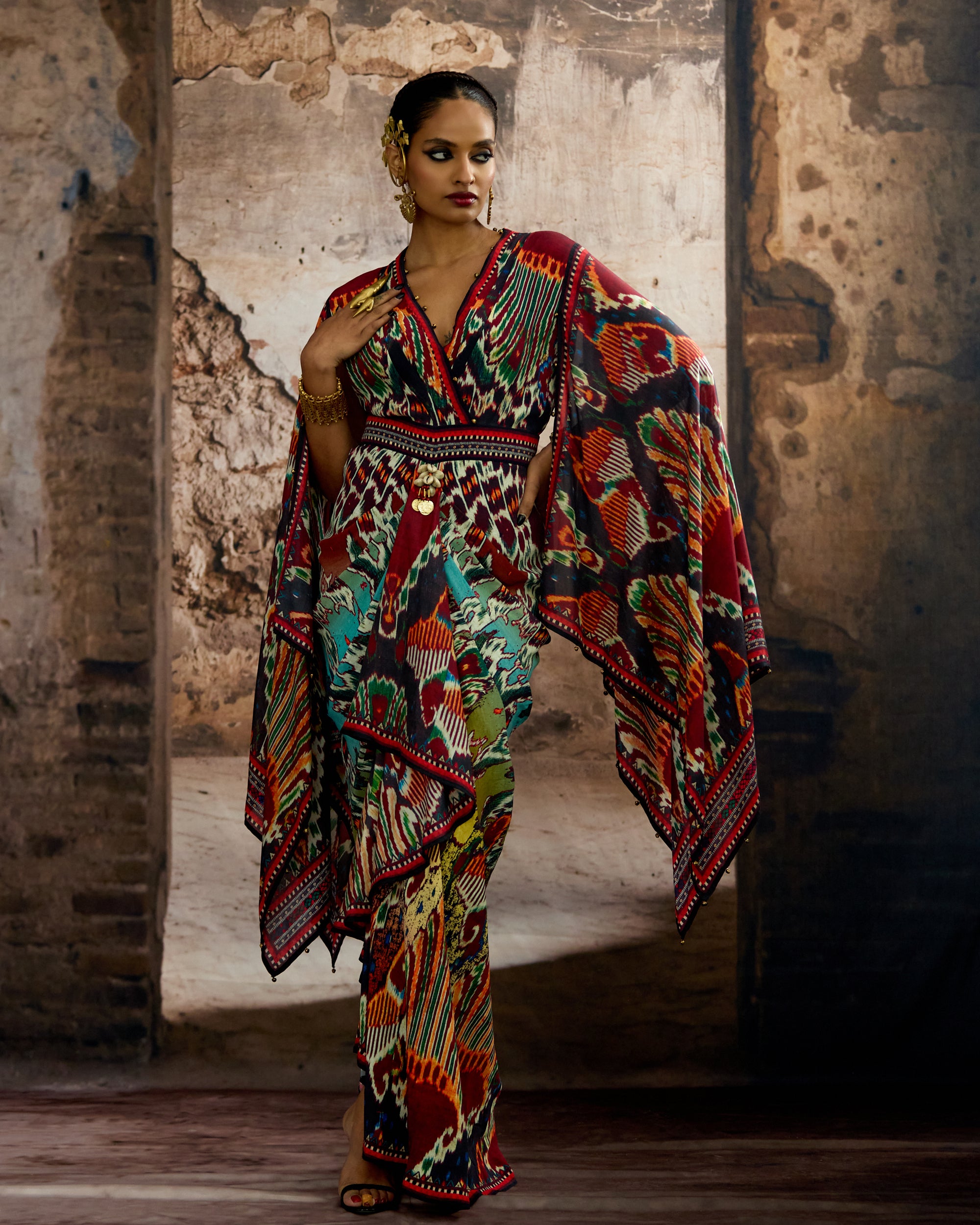 A printed overlap bodice draped dress with silk kimono sleeves. The dress is true to size and is fitted as per measurements. The Dress has a center back zipper fastener.