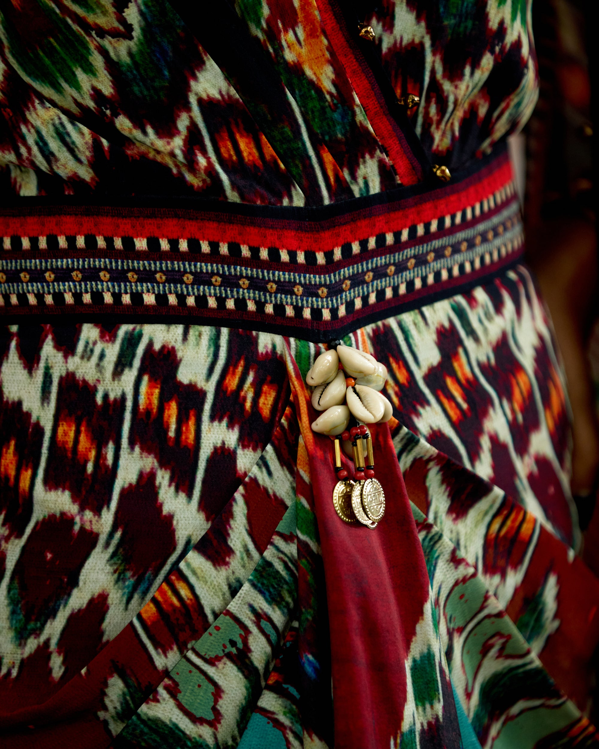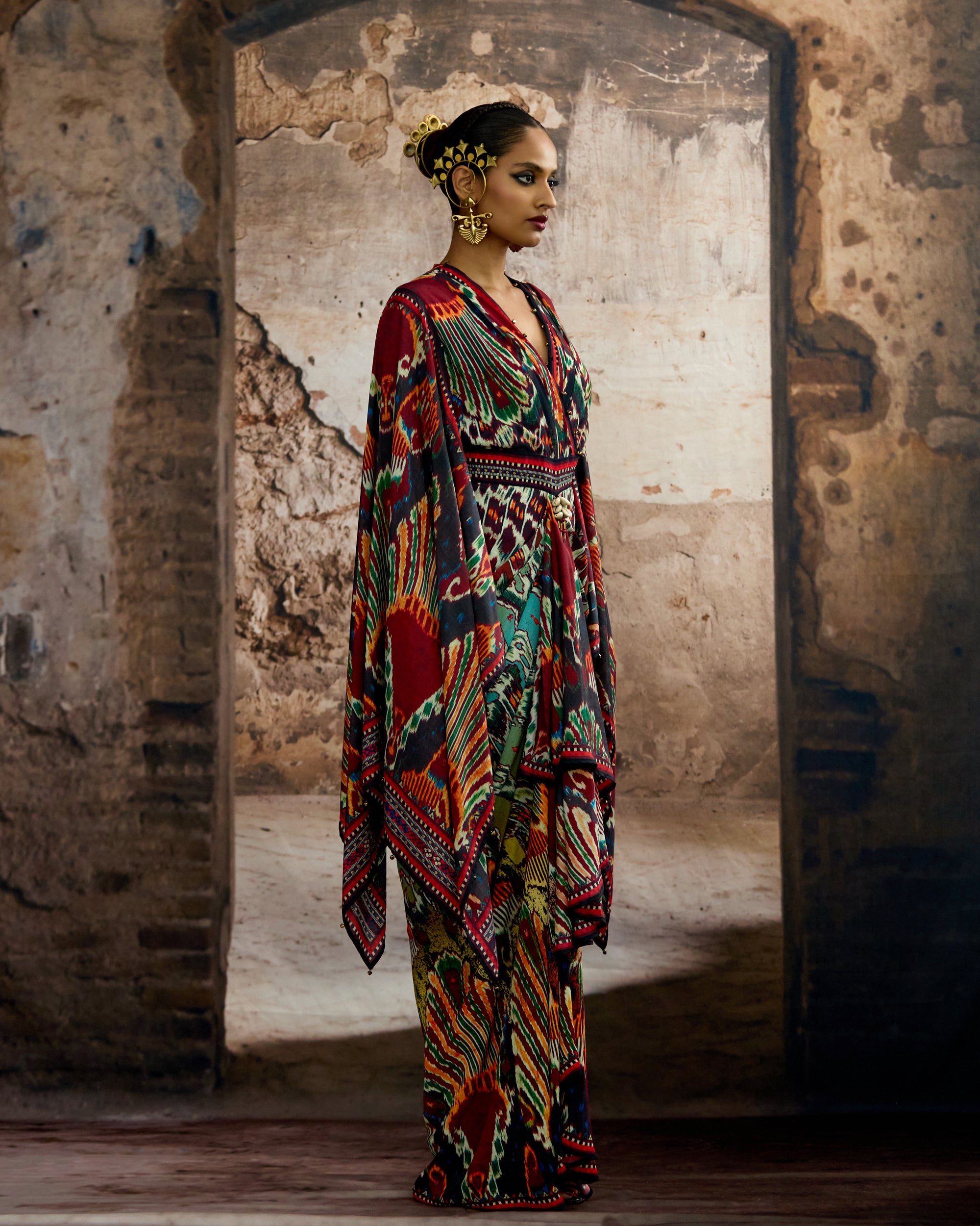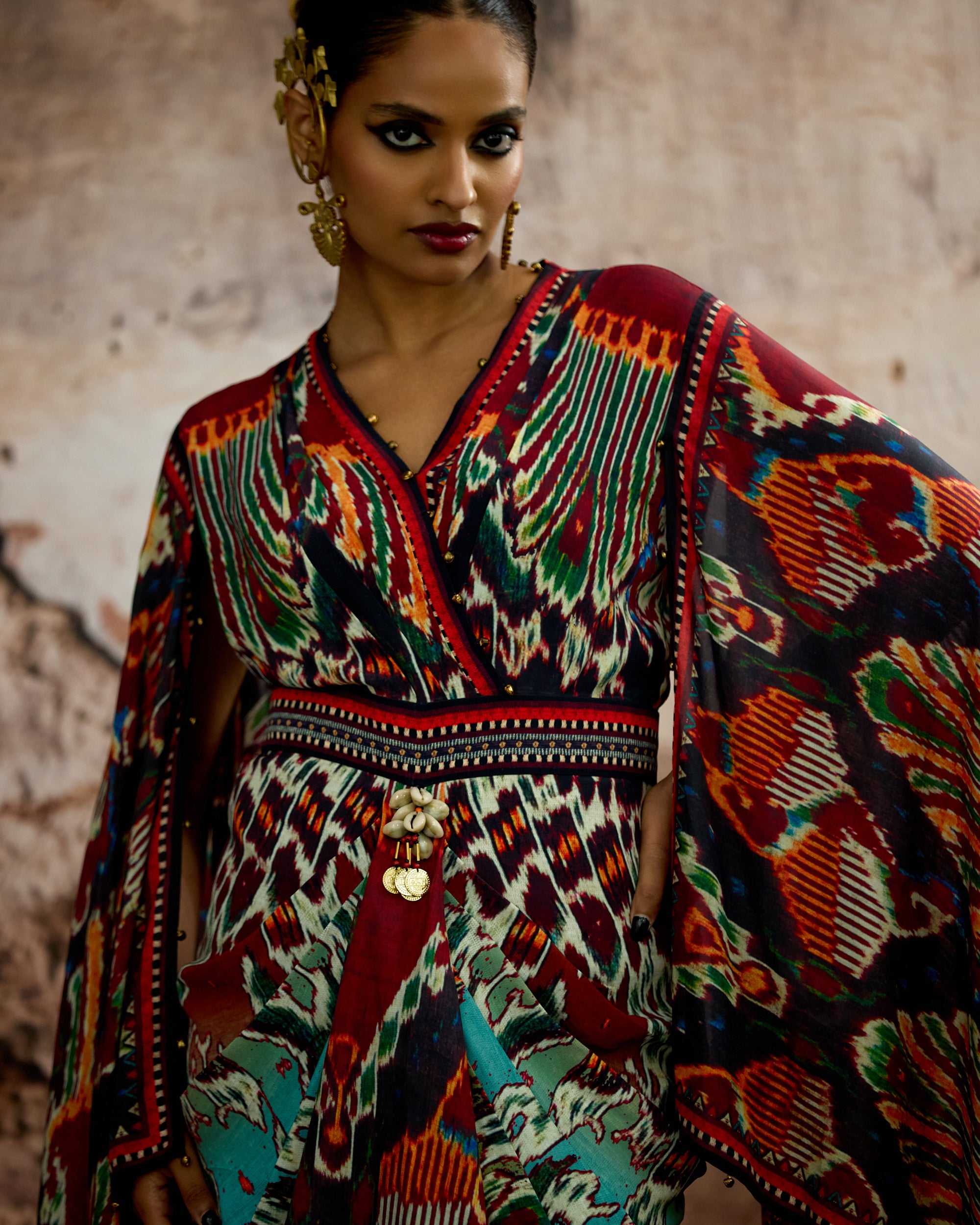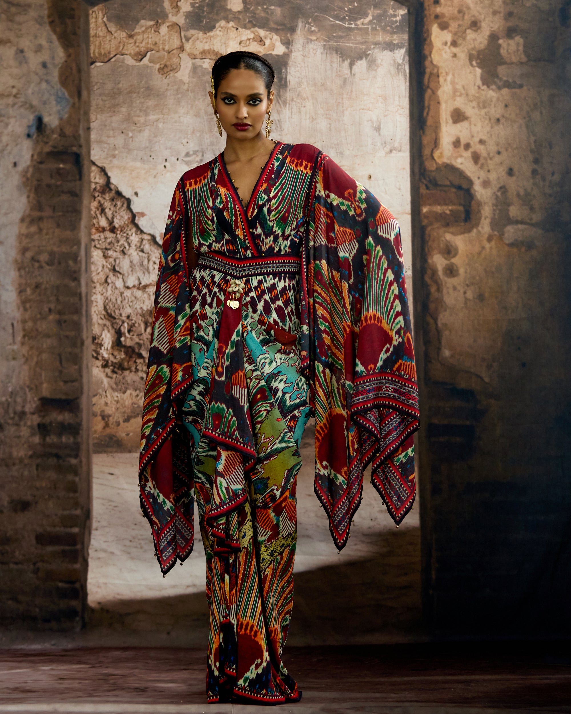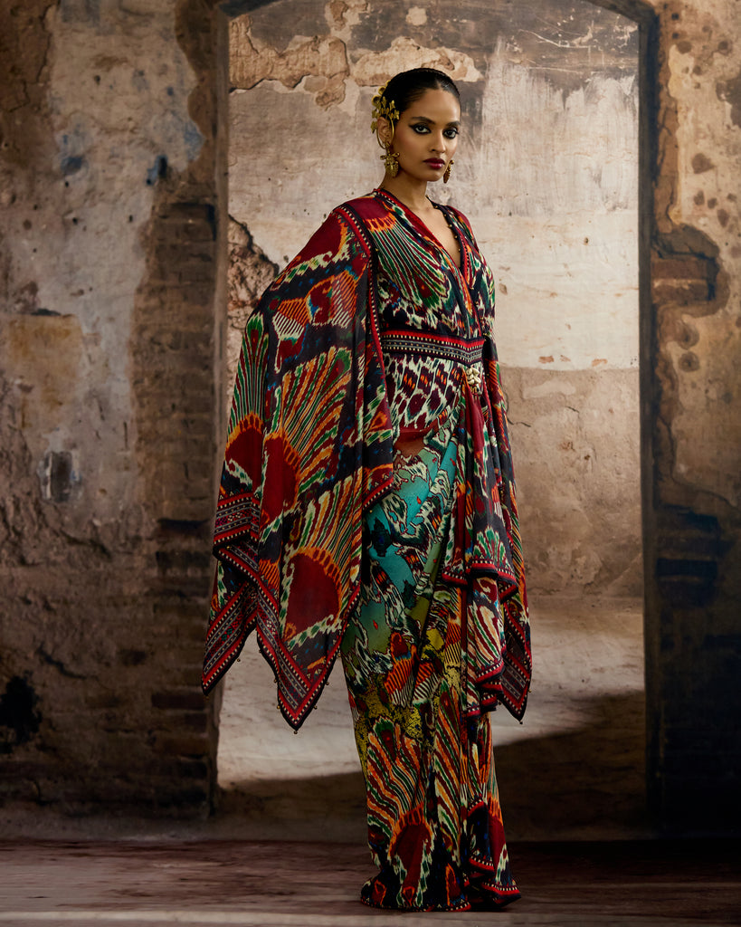A printed overlap bodice draped dress with silk kimono sleeves. The dress is true to size and is fitted as per measurements. The Dress has a center back zipper fastener.