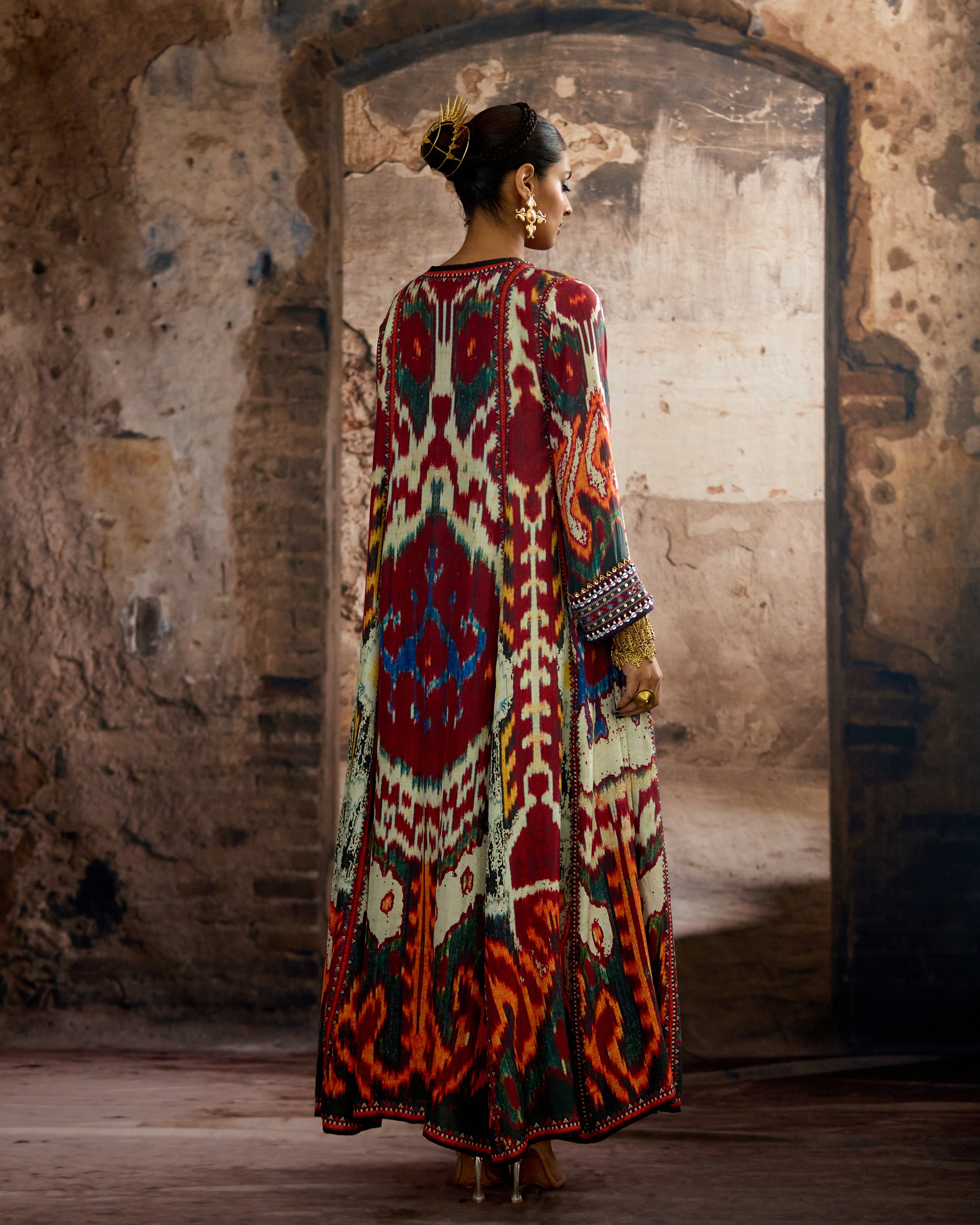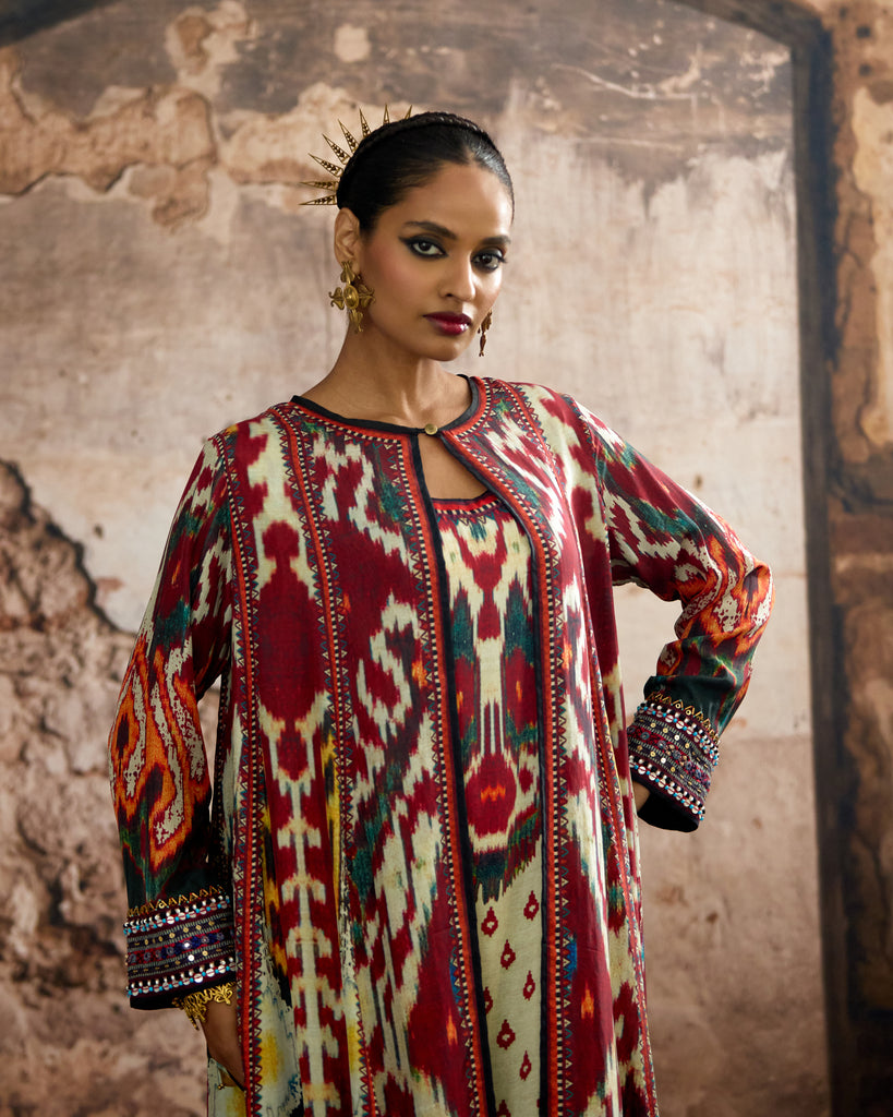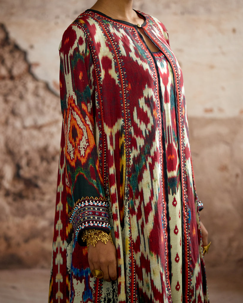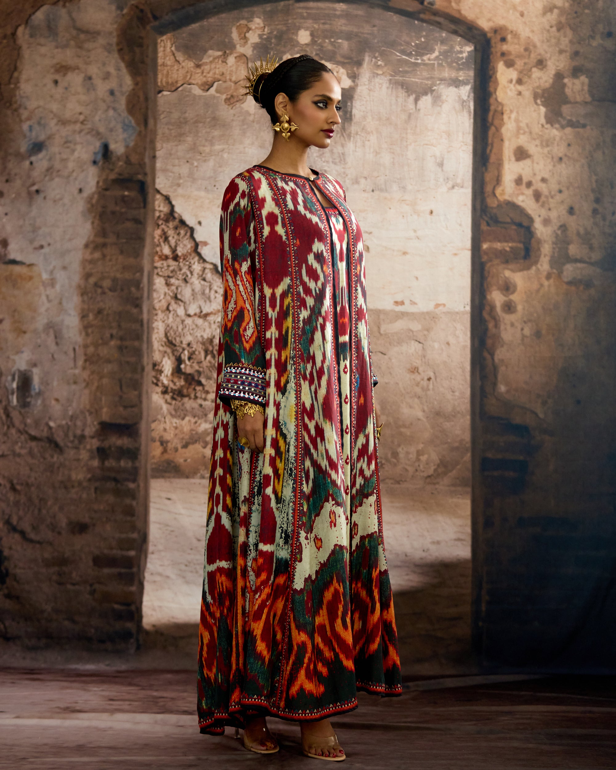 A printed single button panelled silk jacket with full sleeves. The jacket has embroidery on the sleeve hem.