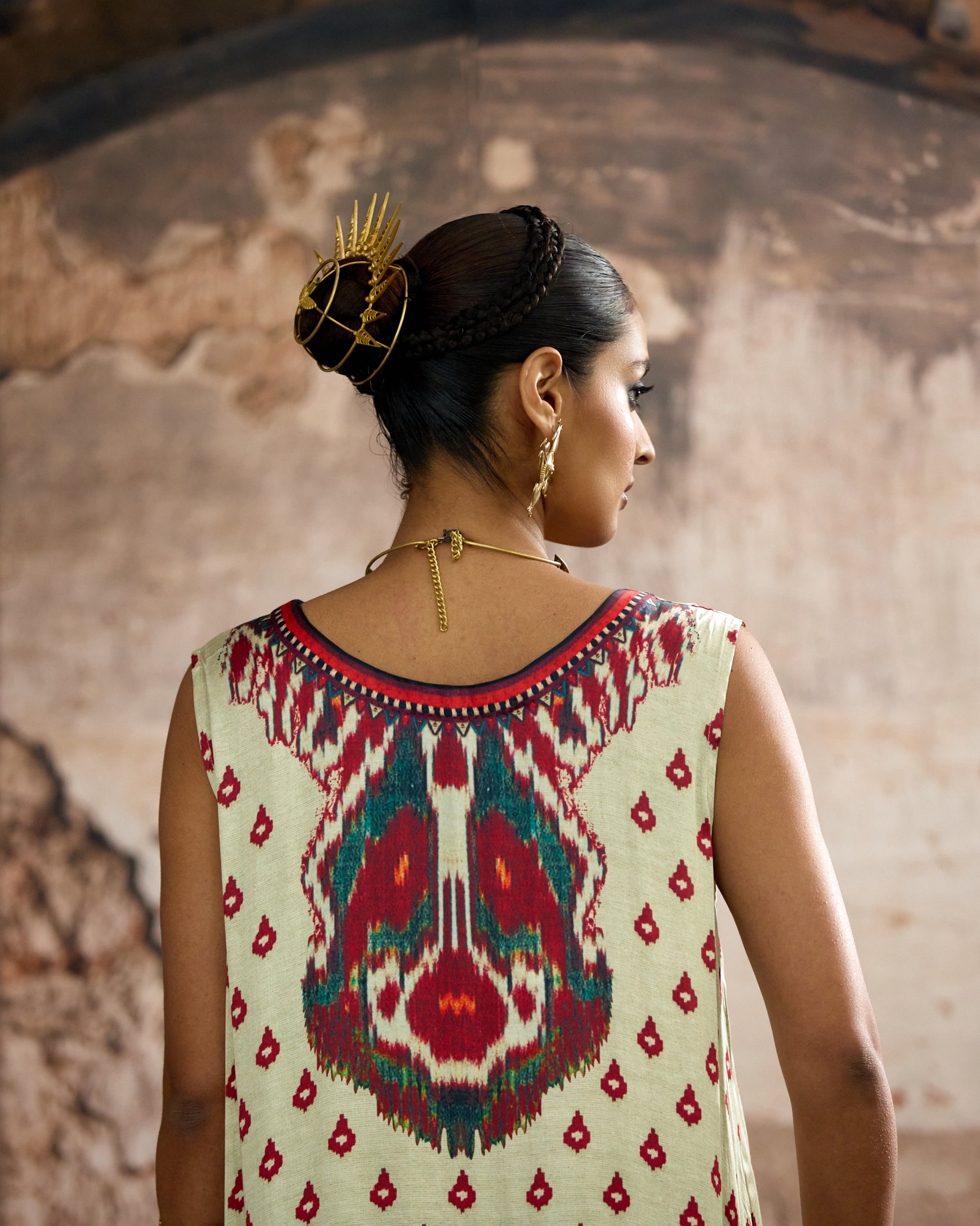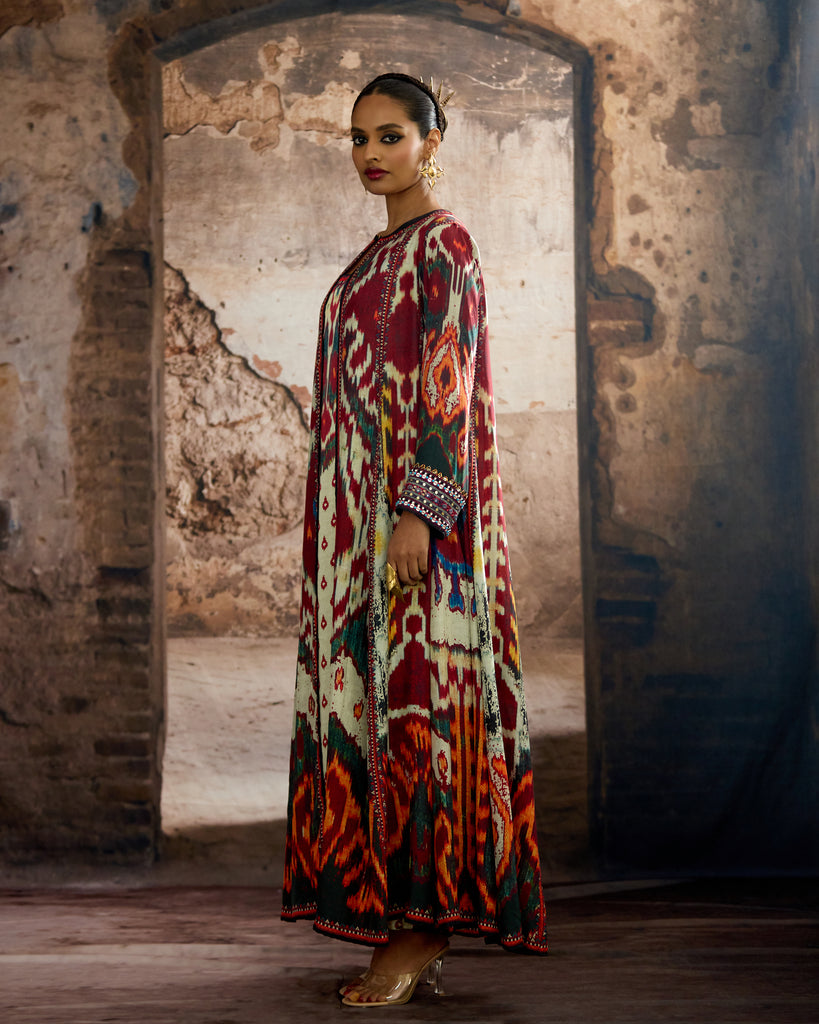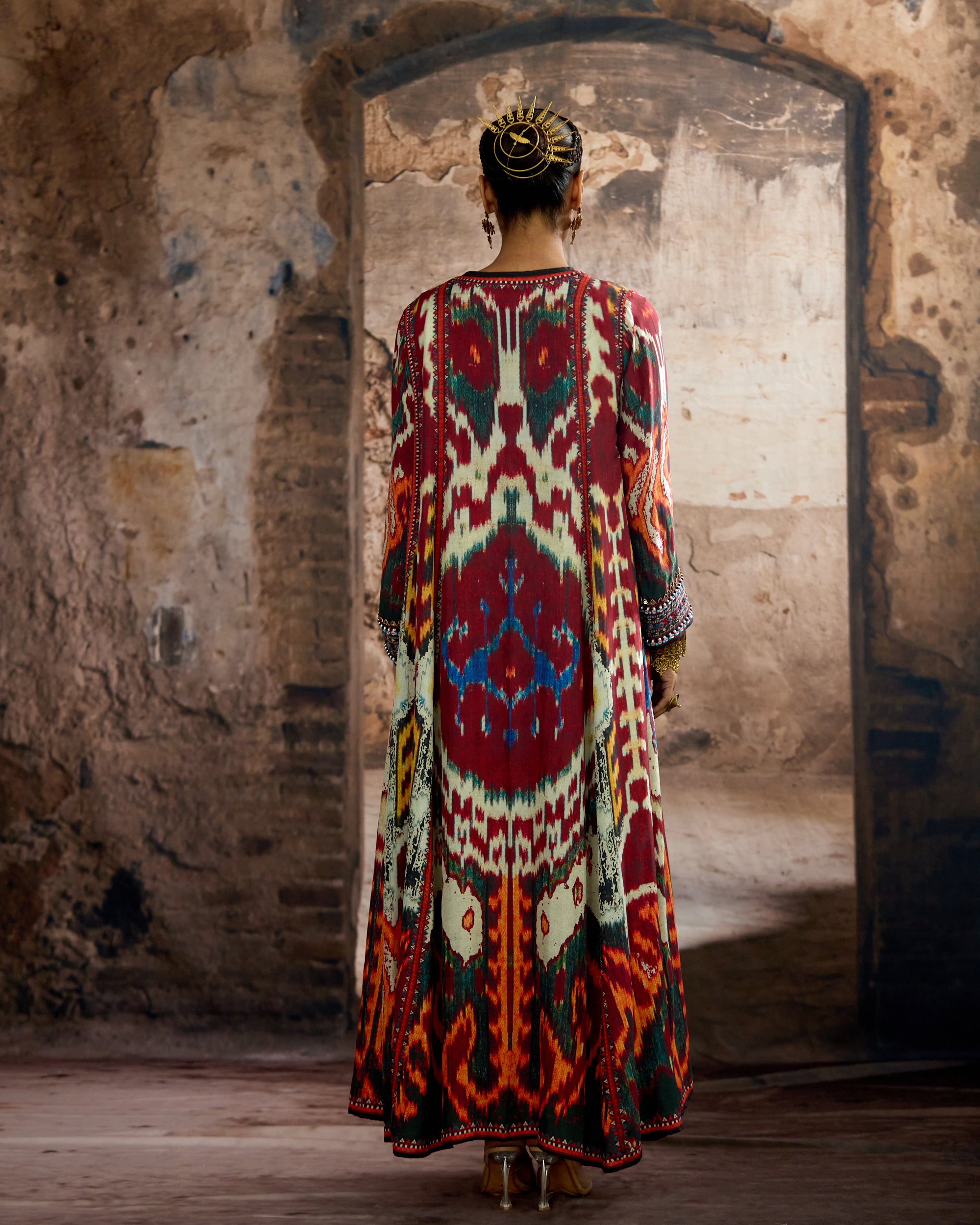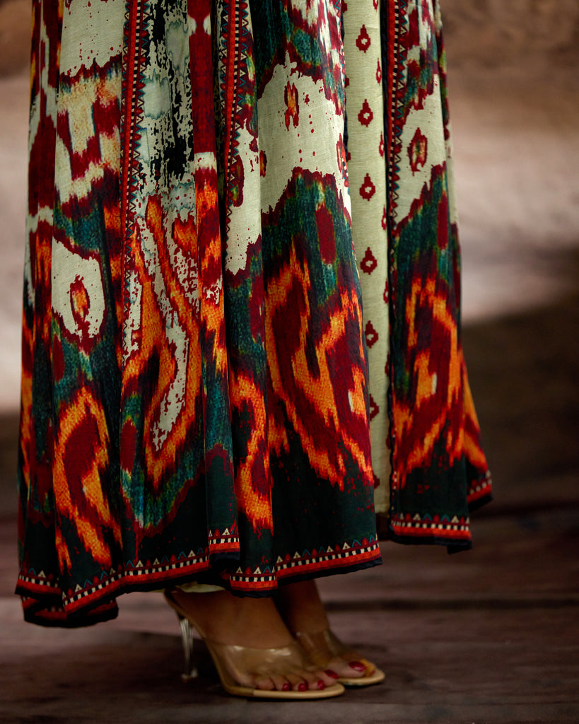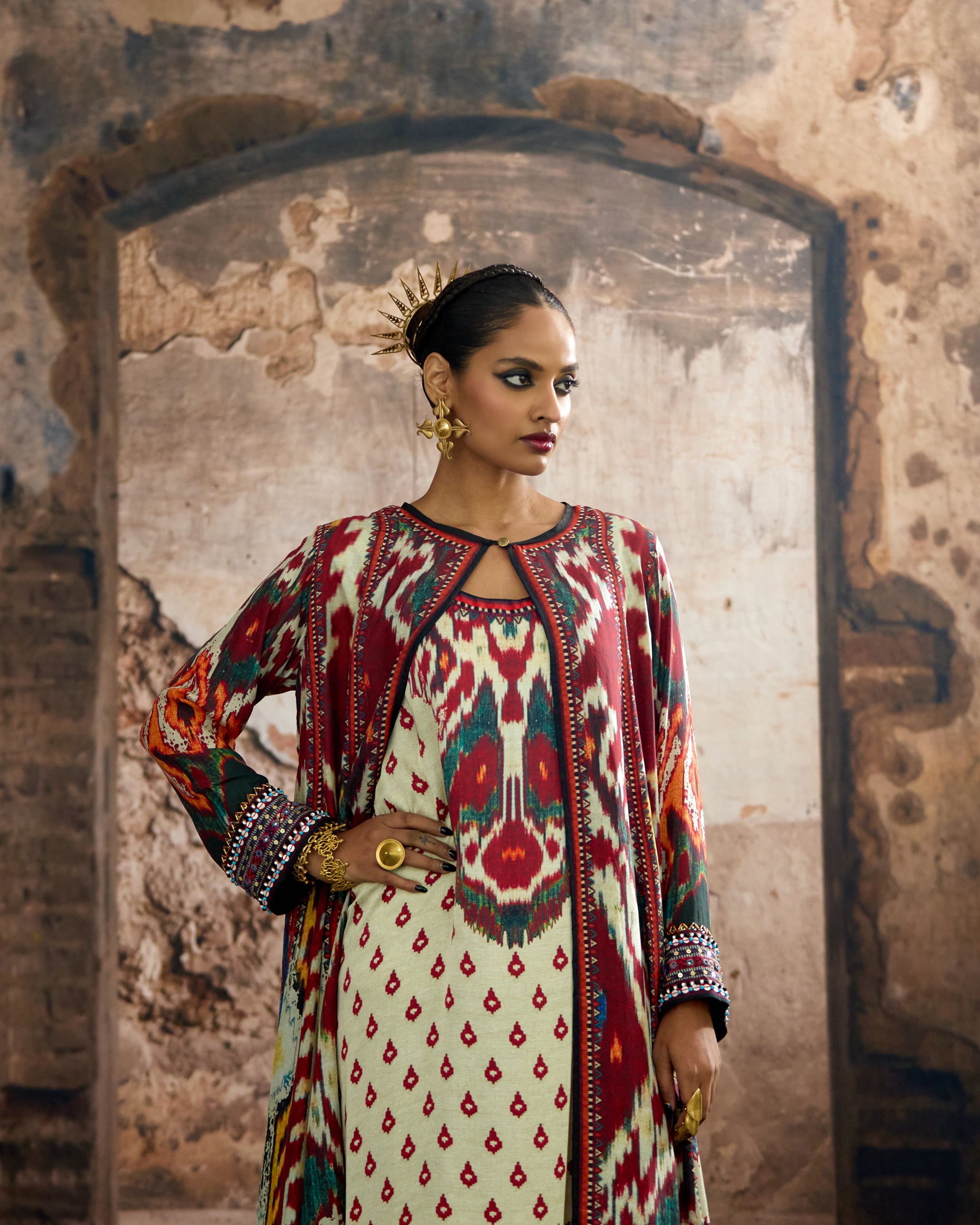 A printed single button panelled silk jacket with full sleeves. The jacket has embroidery on the sleeve hem.